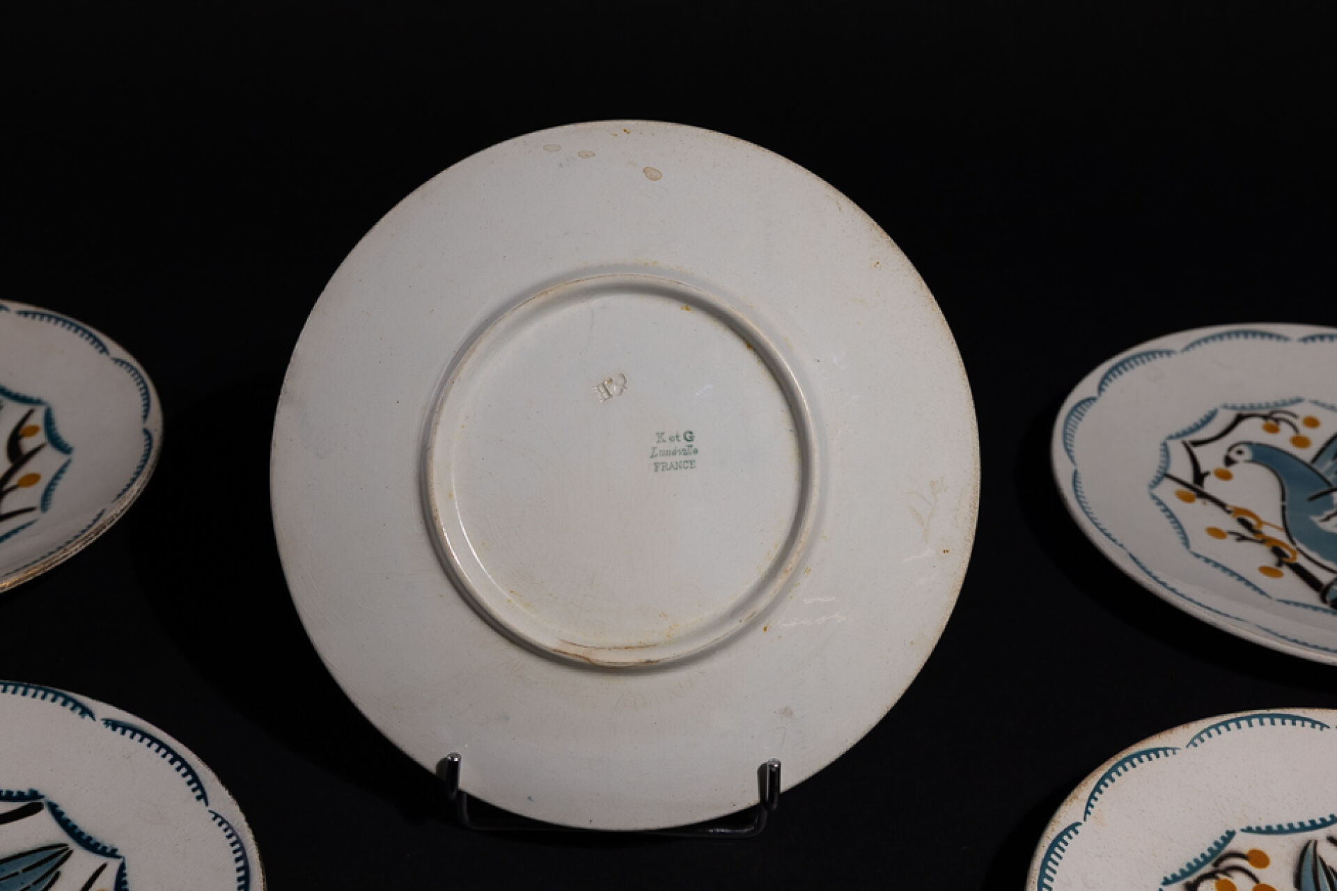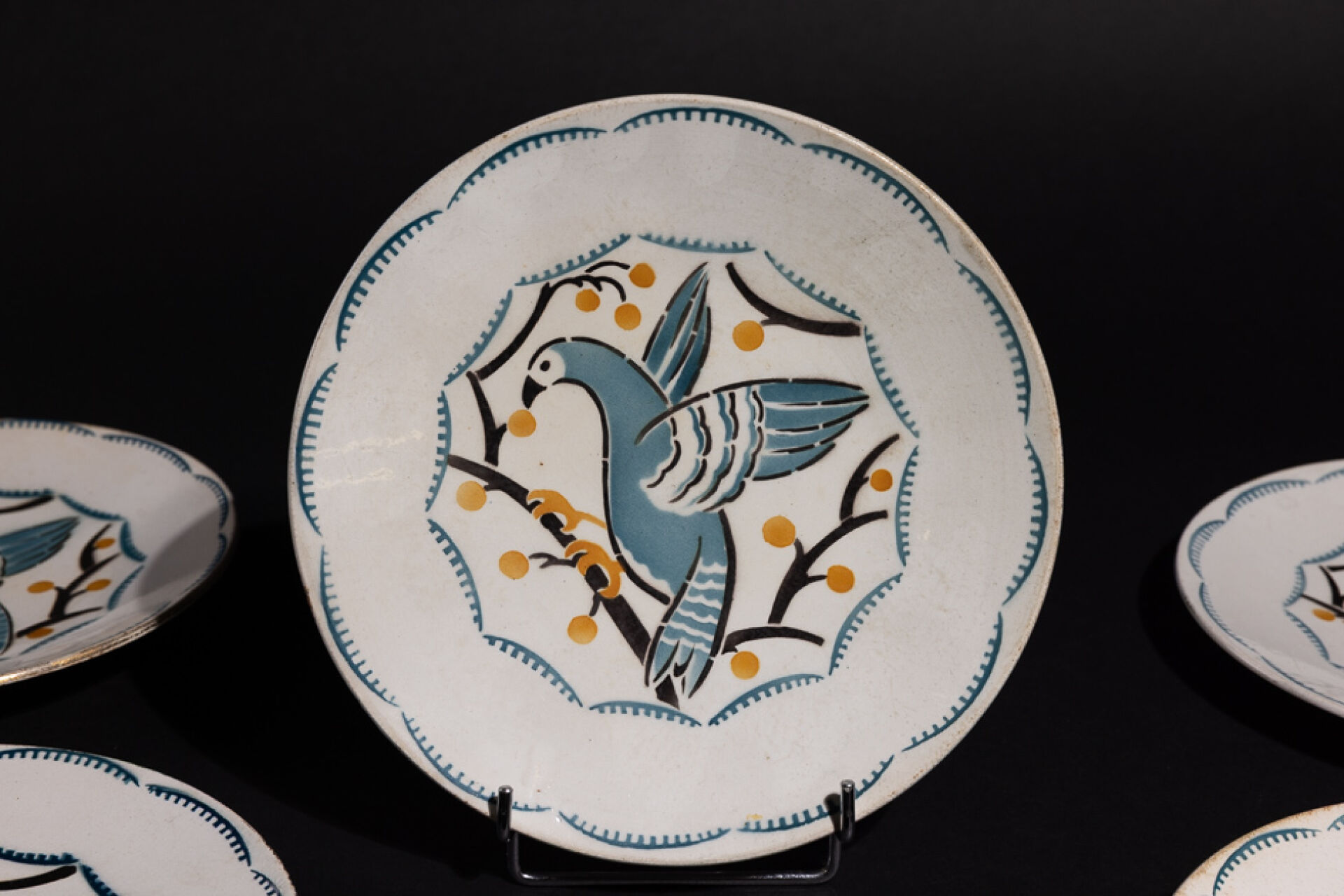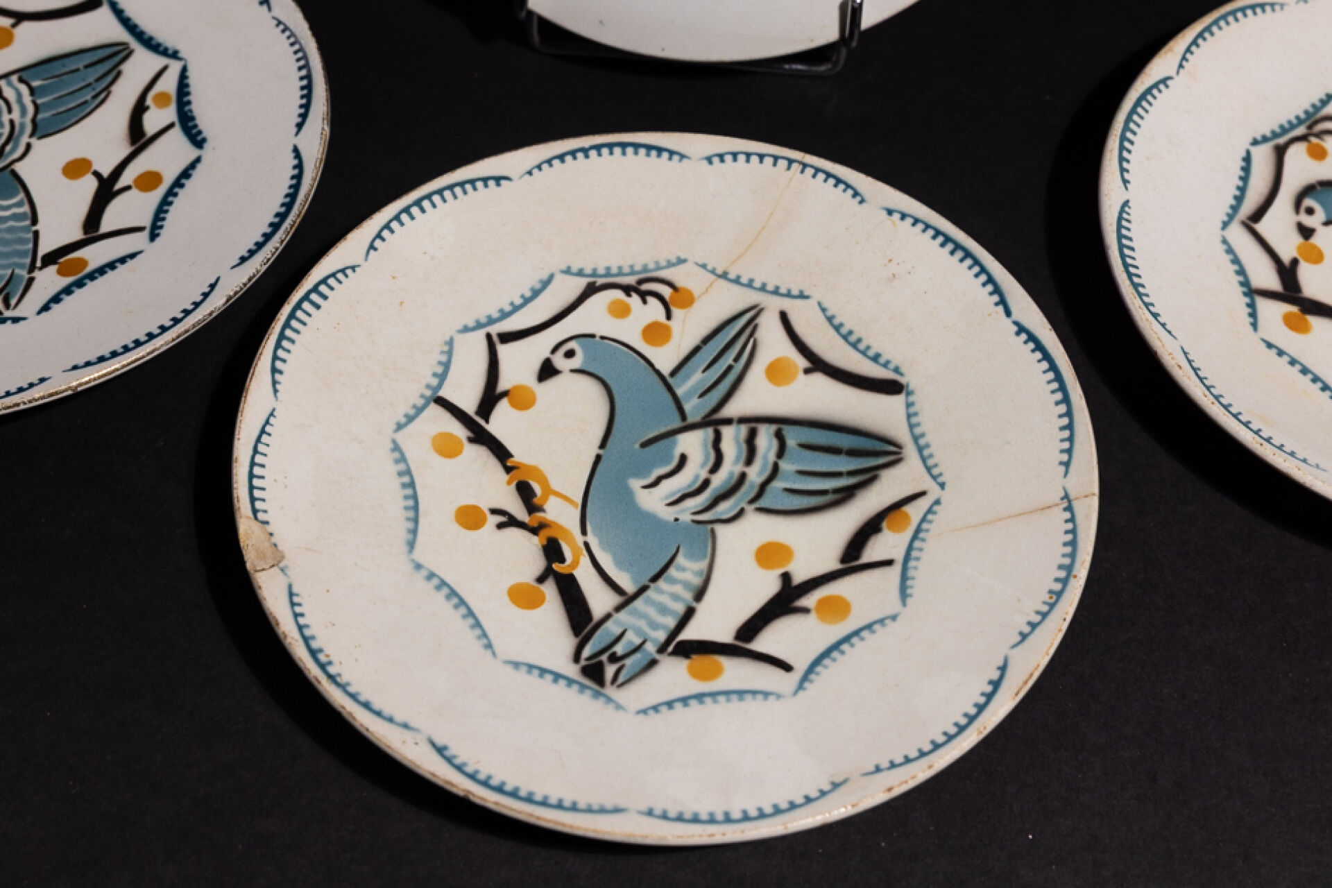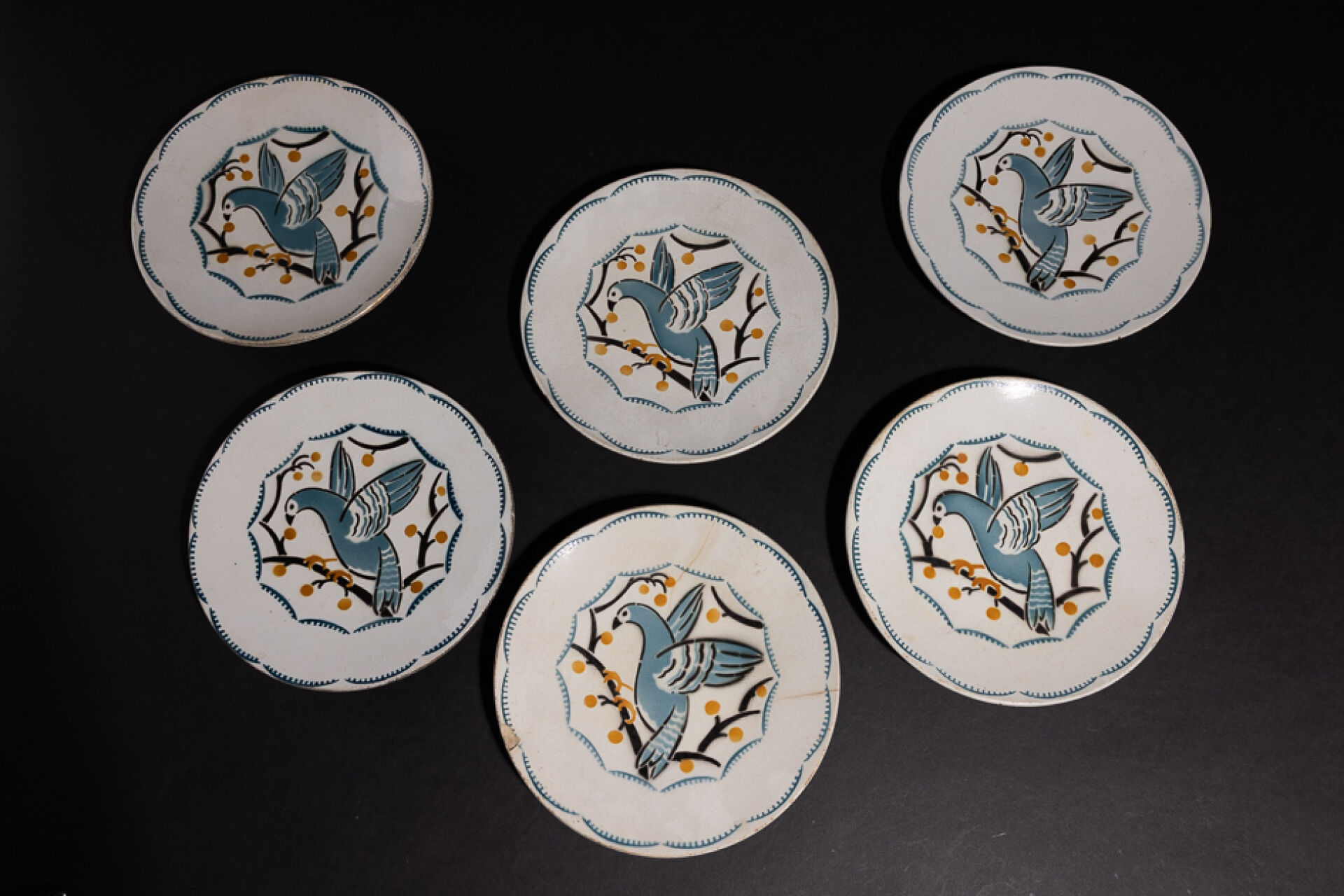 Maison KELLER GUERIN à Lunéville. Suite de six assiettes en faïence à décor polychrome dans les tons bleu, jaune et noir, d'oiseaux branchés, marquées au revers (fêles, éclats sur l'une des assiettes).