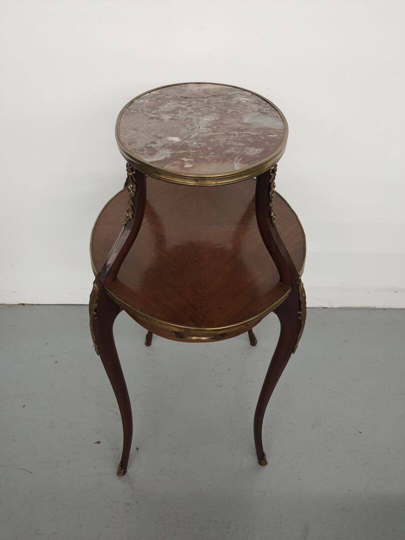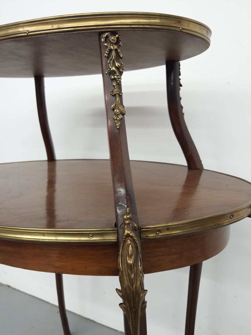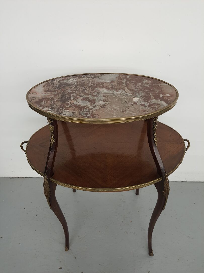Table à thé, en bois de placage de forme ovoïde à deux plateaux superposés ceints de lingotières, le plateau supérieur foncé de marbre rose veiné blanc (petits accidents), le plateau mendiant flanqué de deux anses, les montants sinueux à chutes en métal doré de guirlandes de fruits nouées et volutes feuillagées, stylisées (oxydations, petits accidents, restaurations). Style Louis XV. Haut. : 85,5 cm - Larg. : 71,5 cm - Prof. : 47 cm