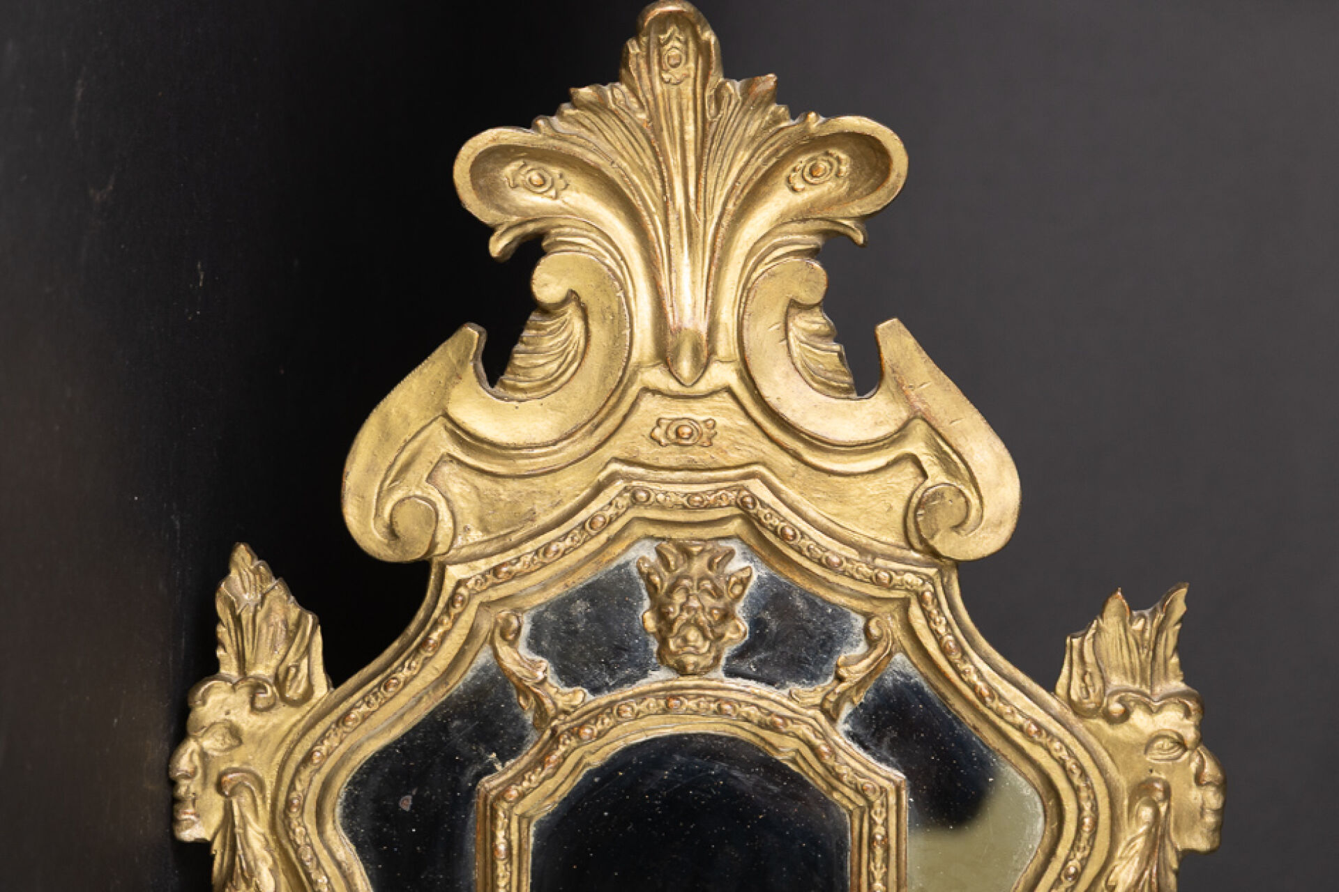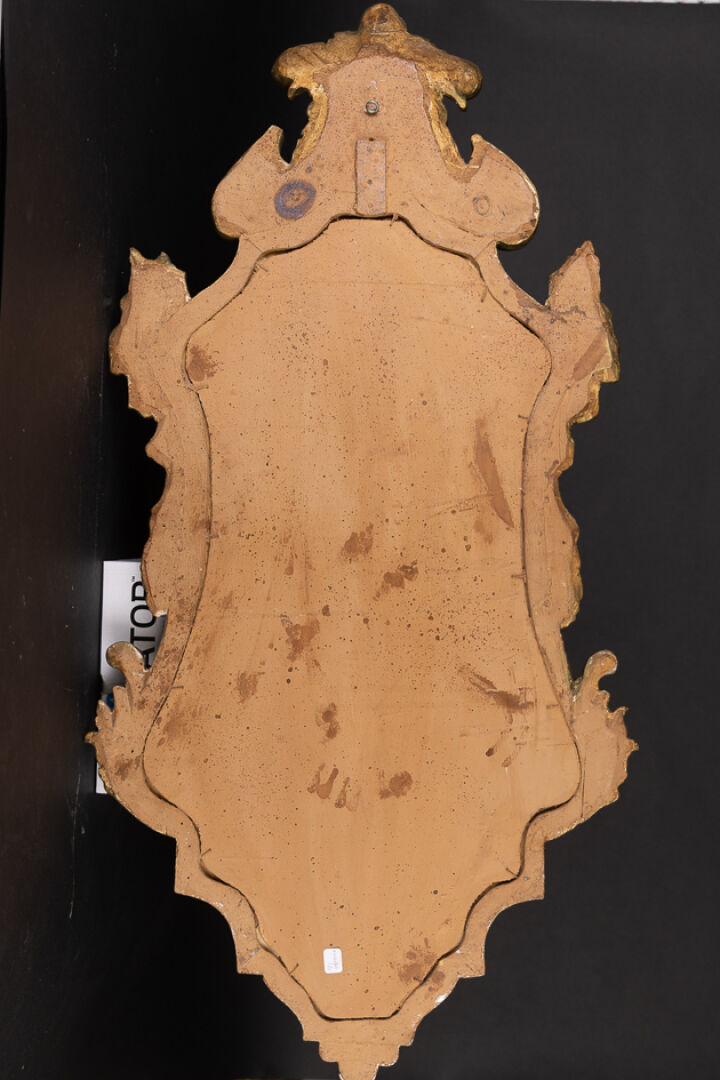 Miroir d'entre deux en bois et stuc redorés, à pare closes, le fronton et les montants, en volutes et coquilles, agrémentés de mascarons (petits accidents). Style Régence. Haut. : 103.5 cm - Larg. : 52 cm
