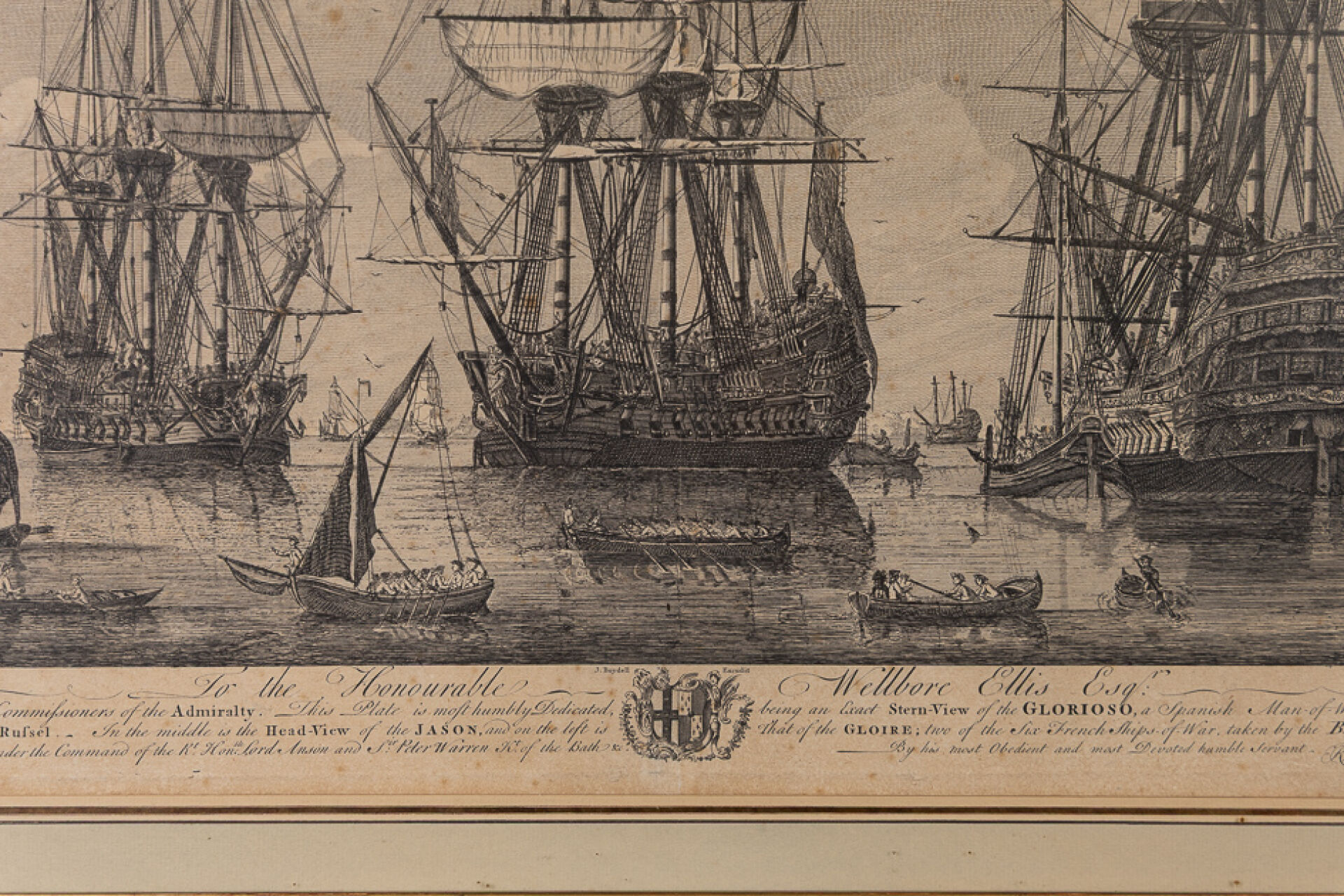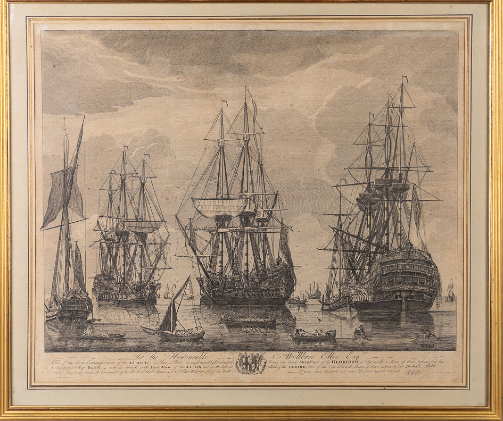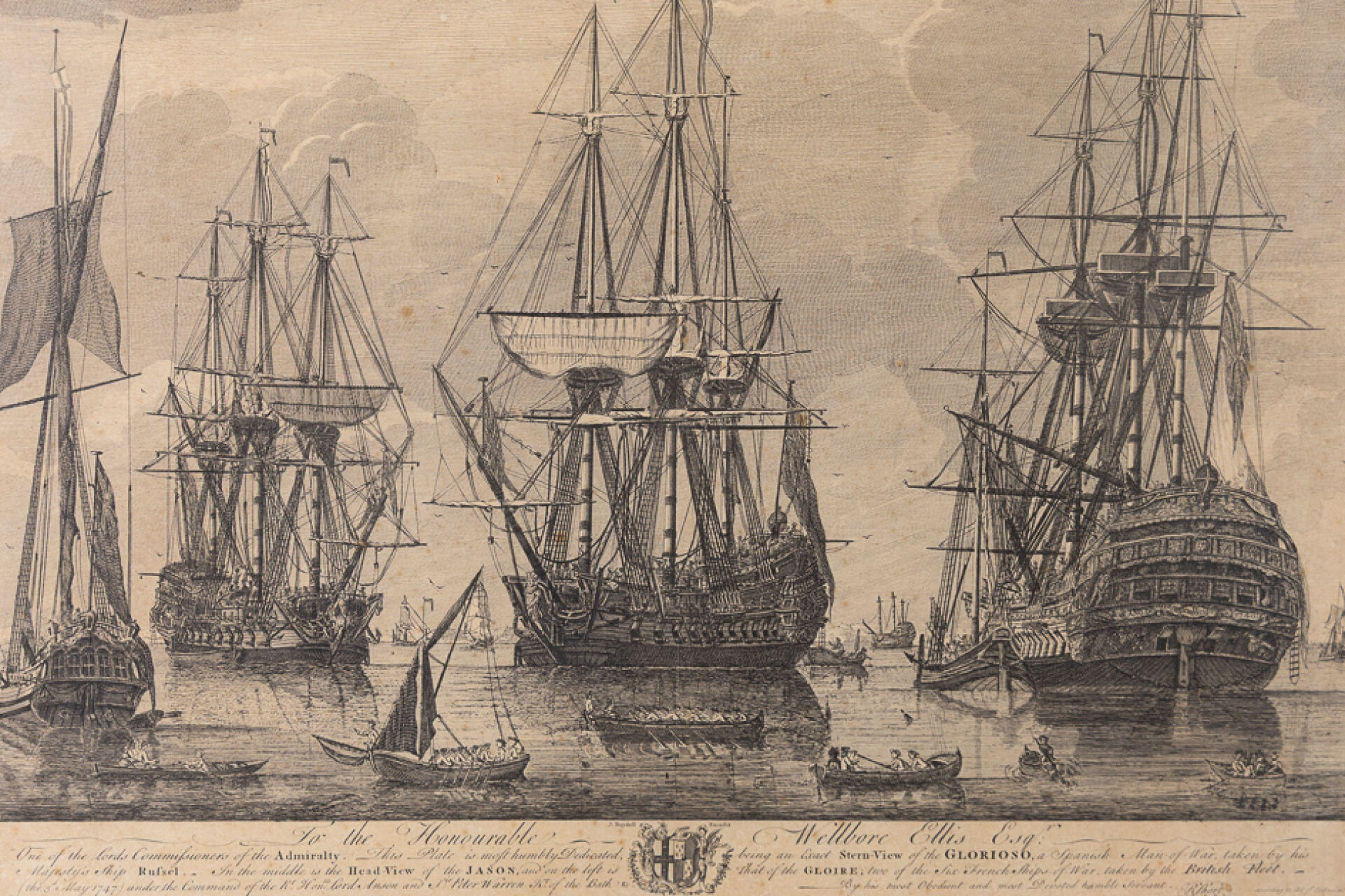 Gravé par John BOYDELL (1719-1804). Vaisseaux de lignes espagnol (el Glorioso) et français (le Gloire) capturés par la Royal Navy dont le Rusel le 3 mai 1747. Gravure en noir titrée "To the Honourable Wellbore Ellis". Dim. à vue : Haut. : 50.5 cm - Larg. : 61 cm