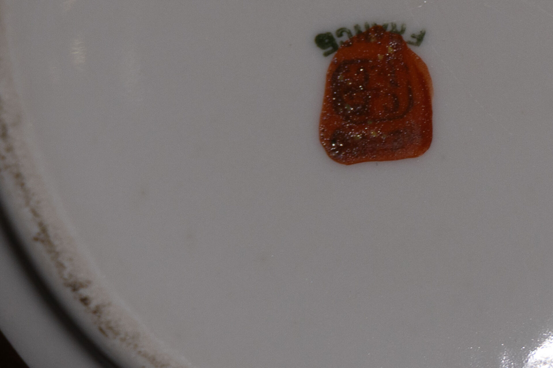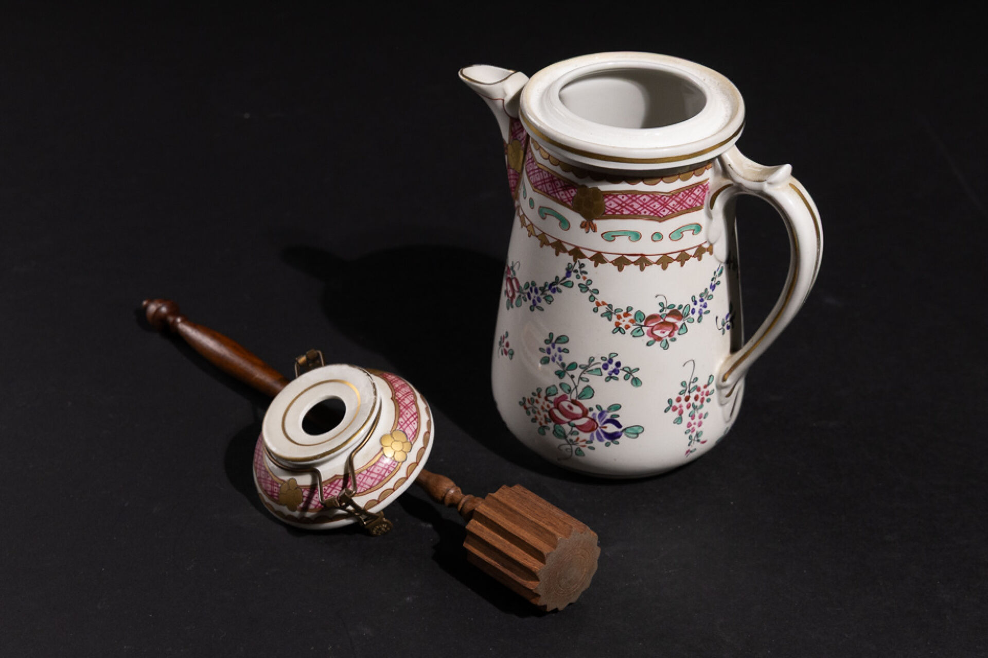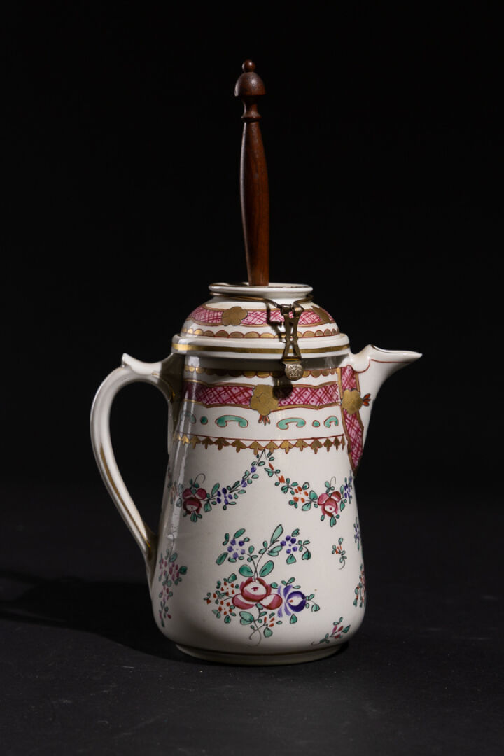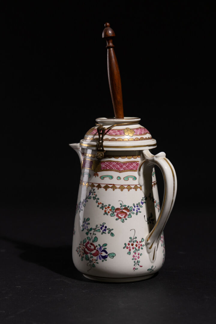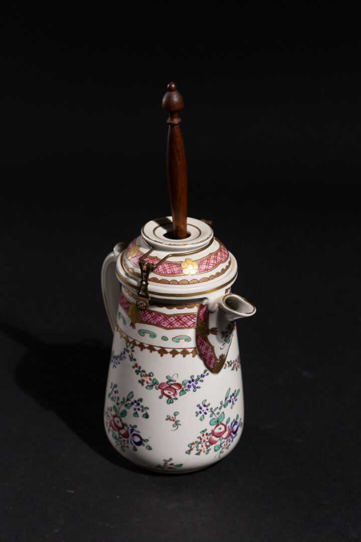 Manufacture de LIMOGES. Chocolatière en porcelaine à décor polychrome à l'imitation de la Compagnie des Indes, moussoir en bois. Circa 1950. Haut. : 19 cm