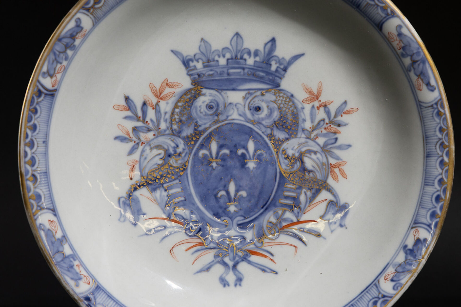 Plat circulaire en porcelaine bleu et or, le bassin orné des armes de France aux dauphins affrontés sous une couronne, l'aile à décor de fleurs, marqué au revers. Samson XXe siècle Diam. : 34 cm