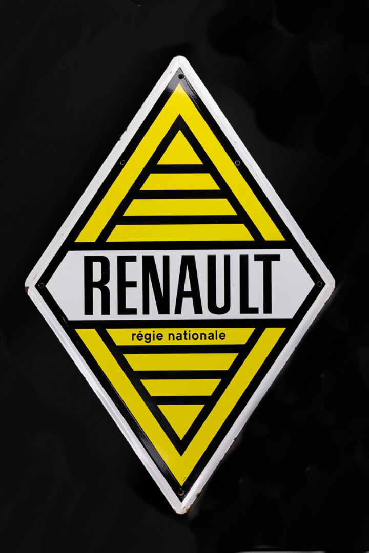 RENAULT - Émaillerie Alsacienne de Strasbourg. Plaque logo, émaillée jaune, blanche et noire, double faces de forme losangique. Marquée REGIE NATIONALE et EAS (sauts à l'émail). Haut. : 115 cm - Larg. : 78.5 cm Ce logo Renault a été utilisé de 1946 à 1958, période mythique de la firme qui verra sortir la DS, la 4CV , la Dauphine.
