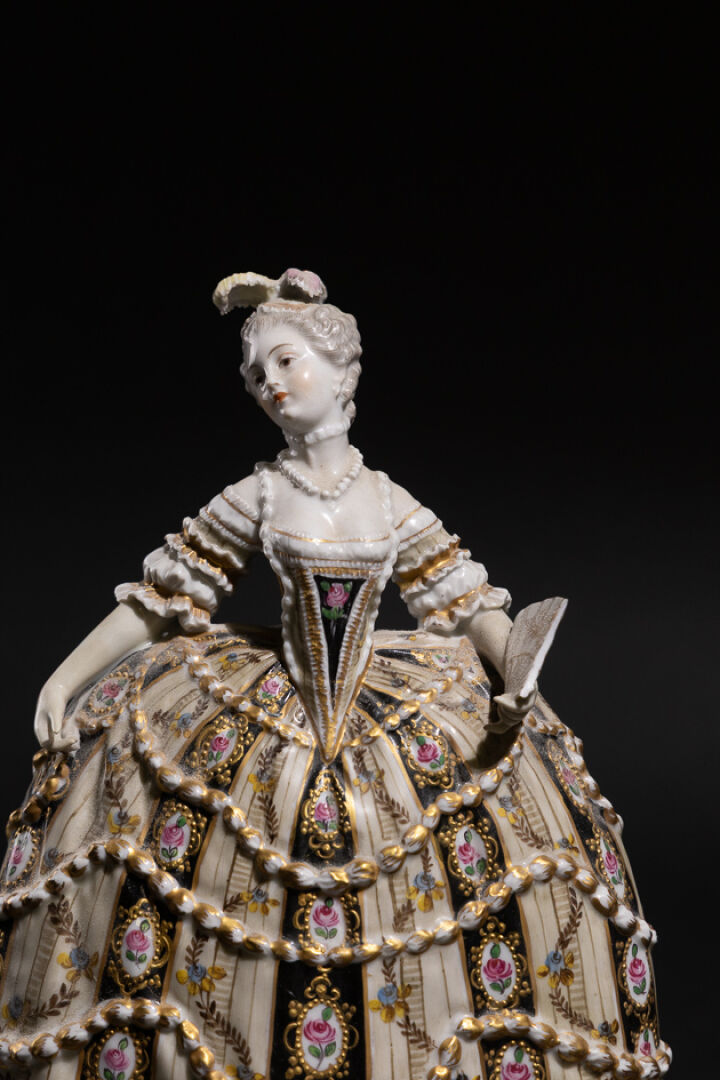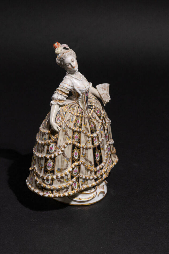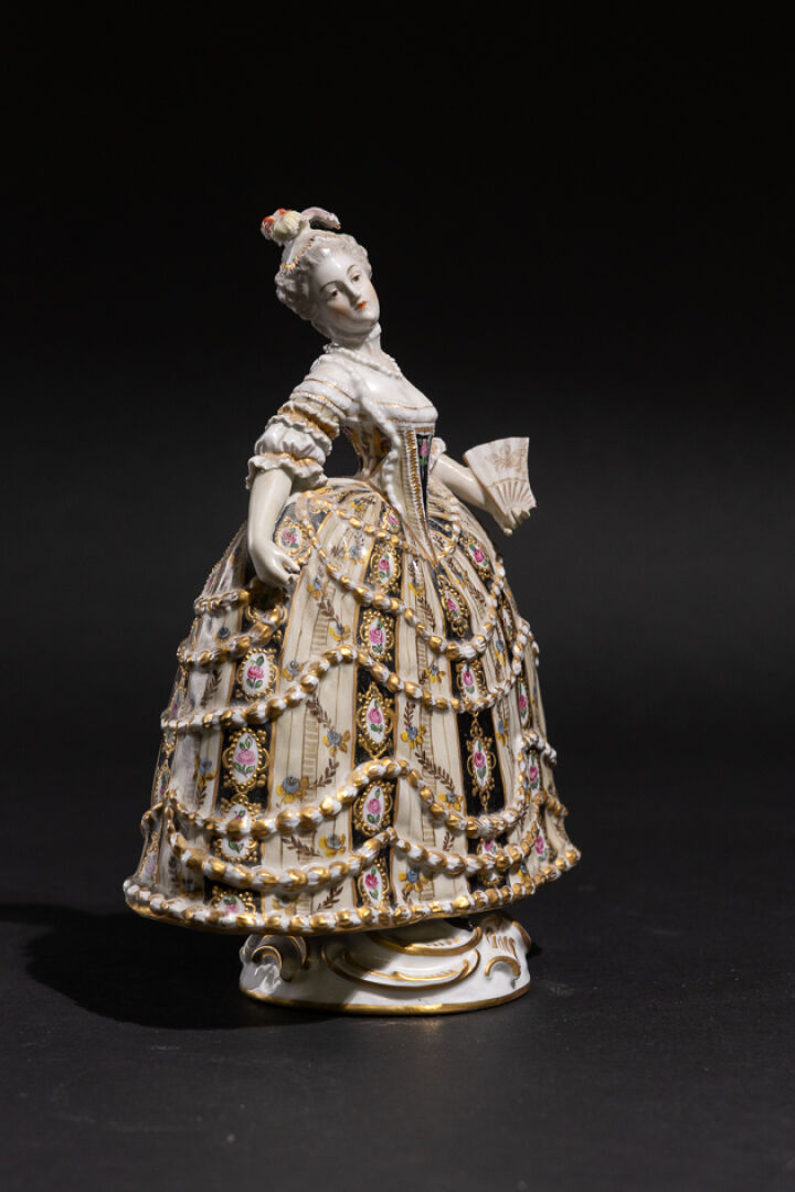 Dans le goût de Sèvres. Statuette figurant une femme à la large robe fleurie tenant un éventail (accidents et manques), marquée au revers et numérotée sous la base 802. Haut. : 25 cm