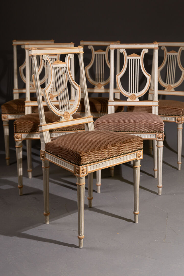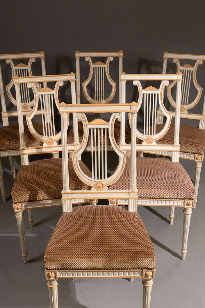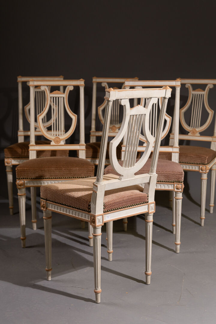 Suite de six chaises en bois mouluré laqué blanc, rechampis rouille, le dossier droit ajouré présente une lyre encadrée par des montants à colonnettes cannelées, reprenant les pieds, l'accoudoir à frise de perles. Style Louis XVI. Haut. : 93 cm - Larg. : 42 cm - Prof. : 37 cm