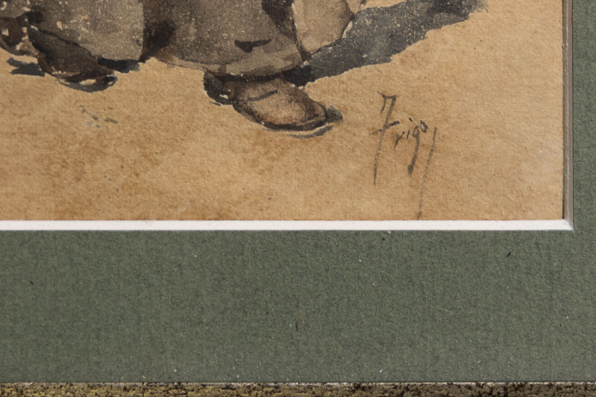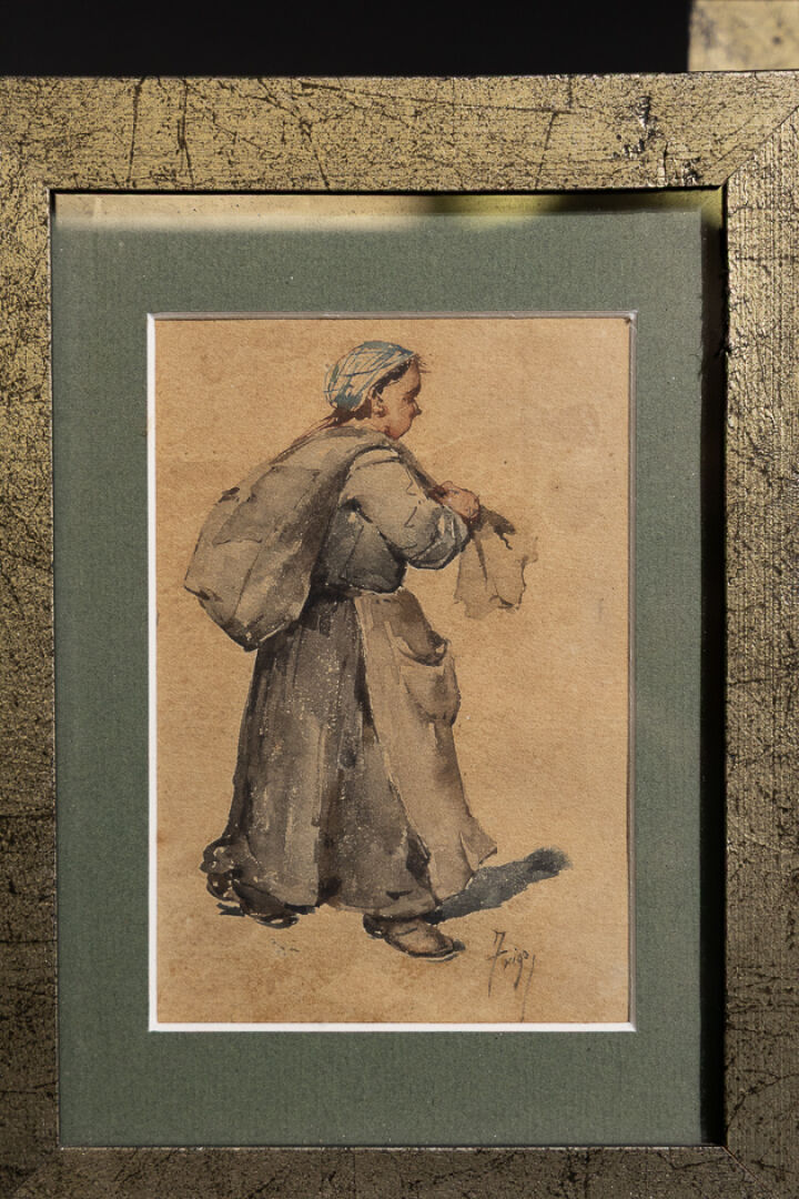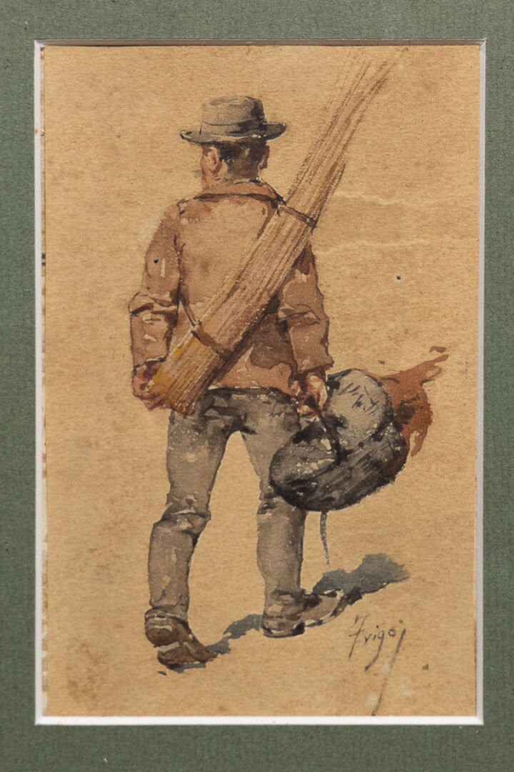 Pierre TRIGO (1850-1914). Cinq paysans au marché dont un homme portant des volailles, trois femmes au sac. Aquarelle signée. Haut. : 12.5 cm à 14, 5 cm - Larg. : 8 cm à 10 cm