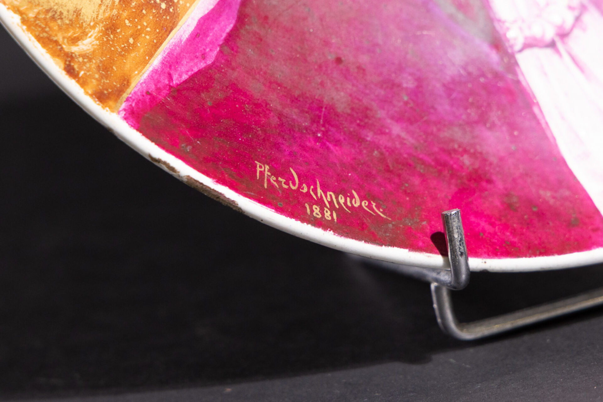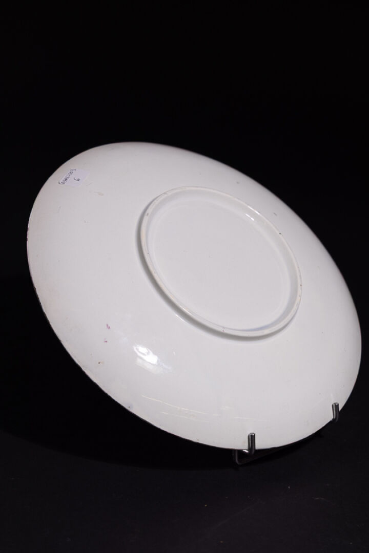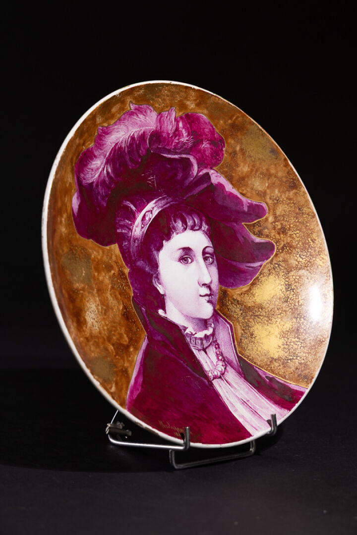 Manufacture MONTEREAU. Assiette en faïence à décor Renaissance d'une femme chapeautée en camaïeu violet sur fond brun or, marquée au revers. Diam. : 27 cm