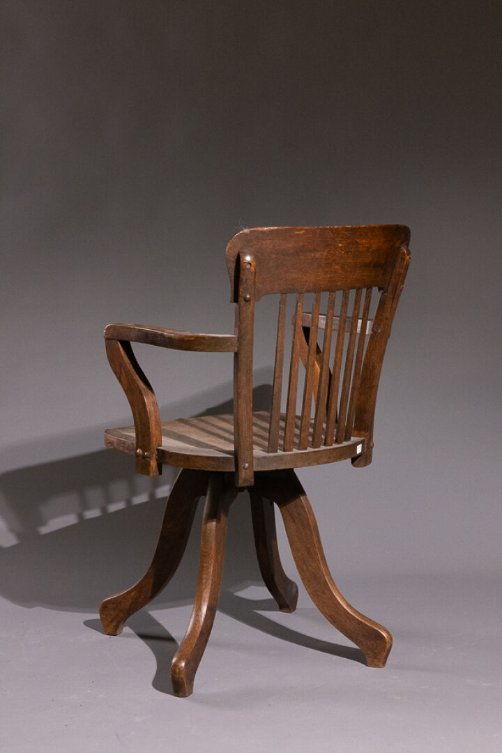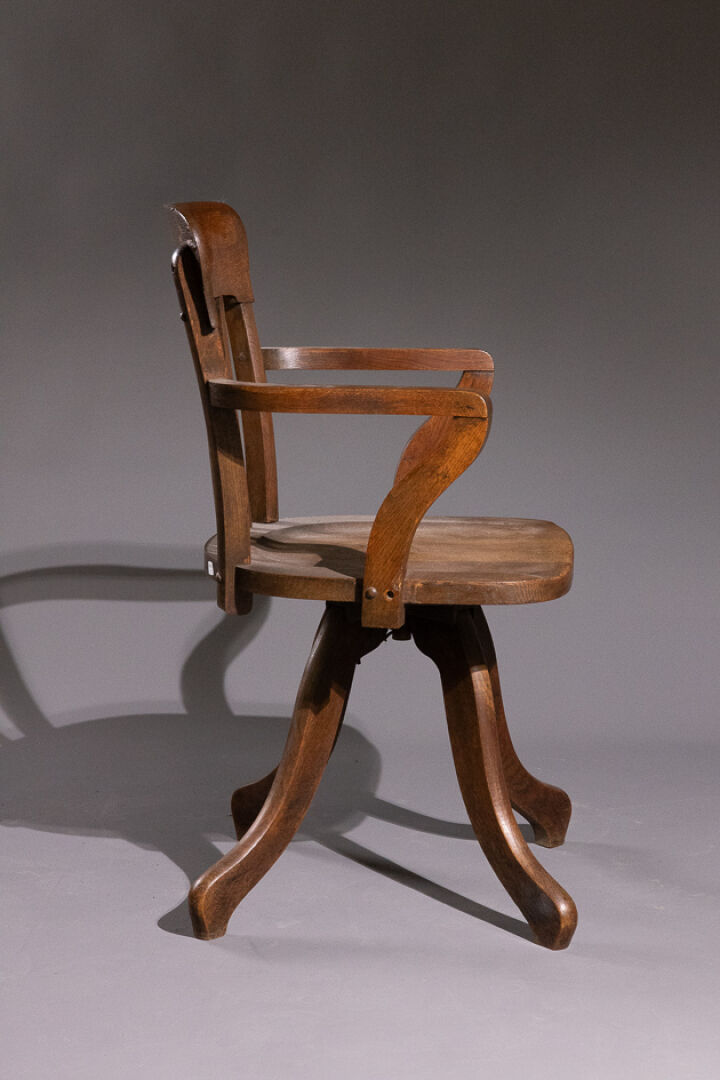 Chaise de bureau en chêne, le dossier bandeau à barreaux, l'assise tournante à cuvette repose sur quatre pieds sinueux. Début du XXe siècle. Haut. : 90 cm - Larg. : 54 cm - Prof. : 46 cm