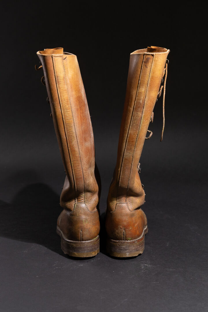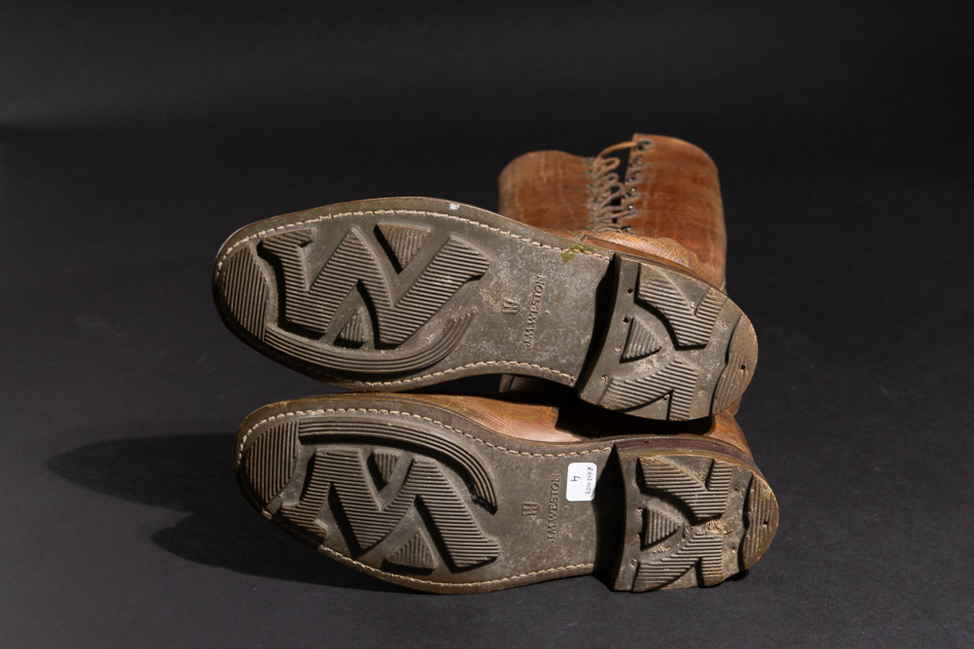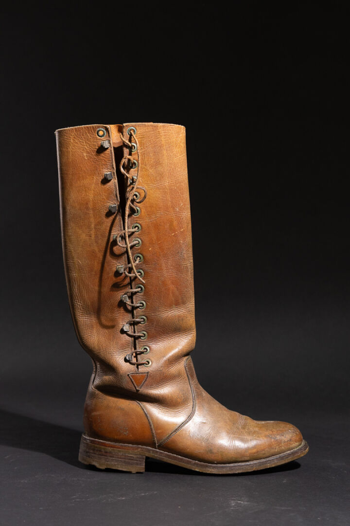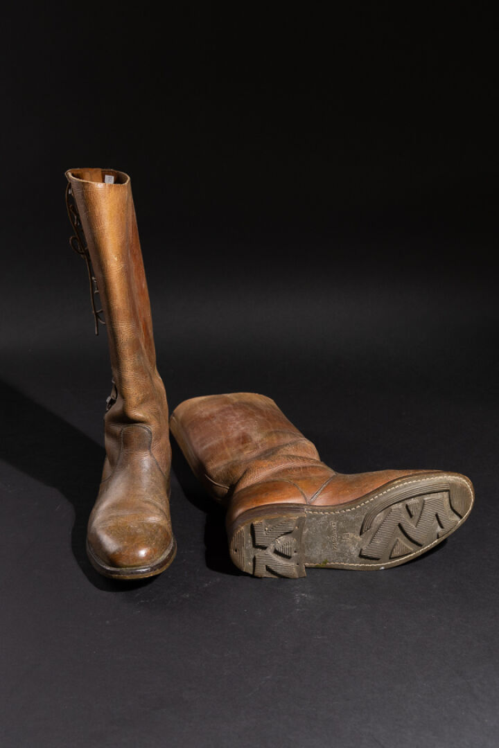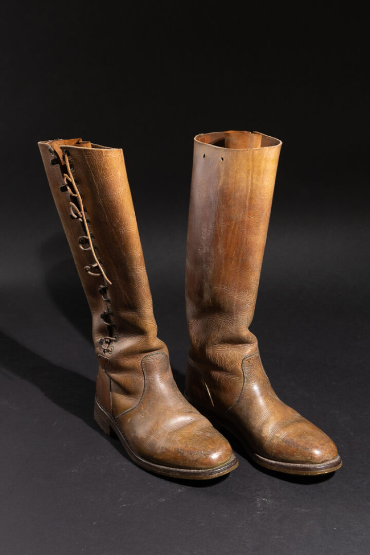 Maison J. M. WESTON. Paire de bottes probablement d'équitation ou d'officier aviateur en cuir marron à agrafes lacets (usures, petits accidents, probablement ressemelées. Première moitié du XXe siècle. Long. du pied : 30 cm - Haut. : 43 cm Fondée en 1891 à Limoges par Édouard Blanchard, la maison WESTON se développe grâce à son fils Eugène, parti aux États-Unis apprendre la technique du cousu Goodyear près de Boston. De retour en France, il crée officiellement J.M. Weston en 1922, avec Monsieur Viar. La marque ouvre des boutiques à Paris (rue de Courcelles puis sur les Champs-Élysées) et s'implante à New York en 1986, rendant hommage à son influence américaine. Son savoir-faire repose sur le cousu Goodyear, montage à trépointe reconnu pour sa solidité, son étanchéité et la possibilité de ressemelage. En 1946, la maison lance son modèle emblématique, le Mocassin 180, revisité notamment par Jean-Charles de Castelbajac. Aujourd'hui encore, la production est réalisée en France, et la Garde républicaine porte des souliers Weston — symbole d'excellence et de tradition. Expertise réalisée par Claire CHASSINE-LAMBERT.