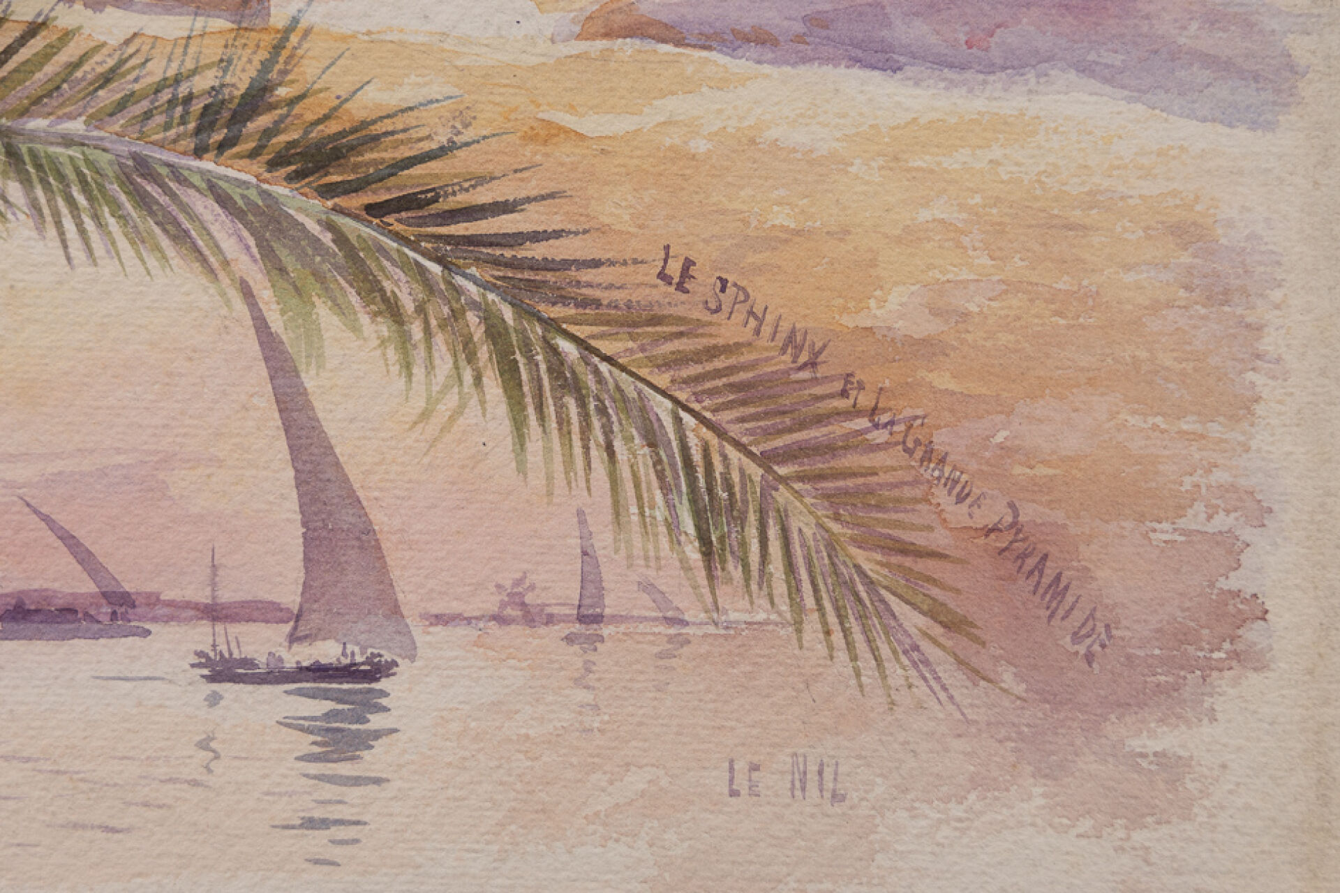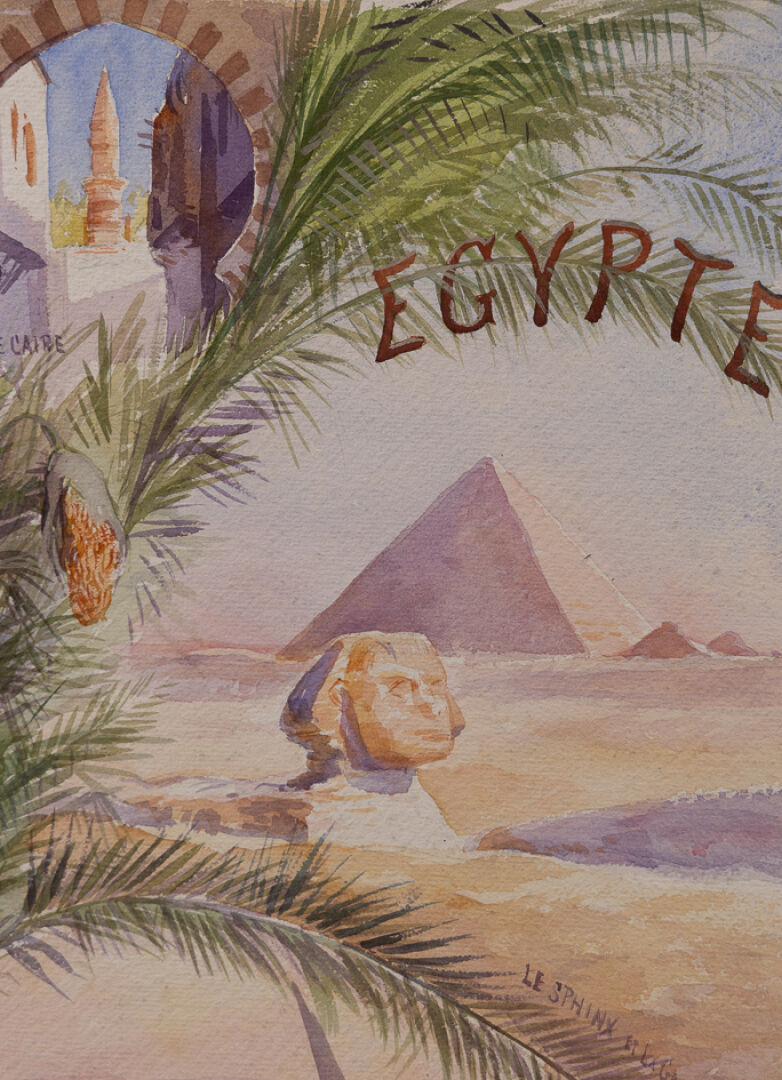 École vers 1900. Projet d'affiche titrée " Égypte " figurant le Sphinx, les pyramides, le Nil et ses felouques et la ville du Caire. Aquarelle (déchirures sur les bords). Haut. : 37 cm - Larg. : 27 cm