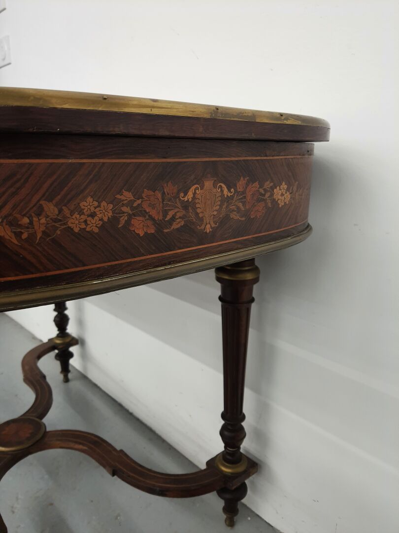 Table de milieu en placage de palissandre à décor marqueté de filet et large bouquet de fleurs sauvages, le plateau rectangulaire à petits côtes arrondis, souligné d'une lingotière, la ceinture ouvrant à un tiroir, les pieds fuselés, cannelés réunis par une entretoise en X, elle aussi entretoisée, petits pieds toupies (petits accidents et manques, auréoles). Époque Napoléon III. Haut. : 77 cm - Larg. : 117 cm