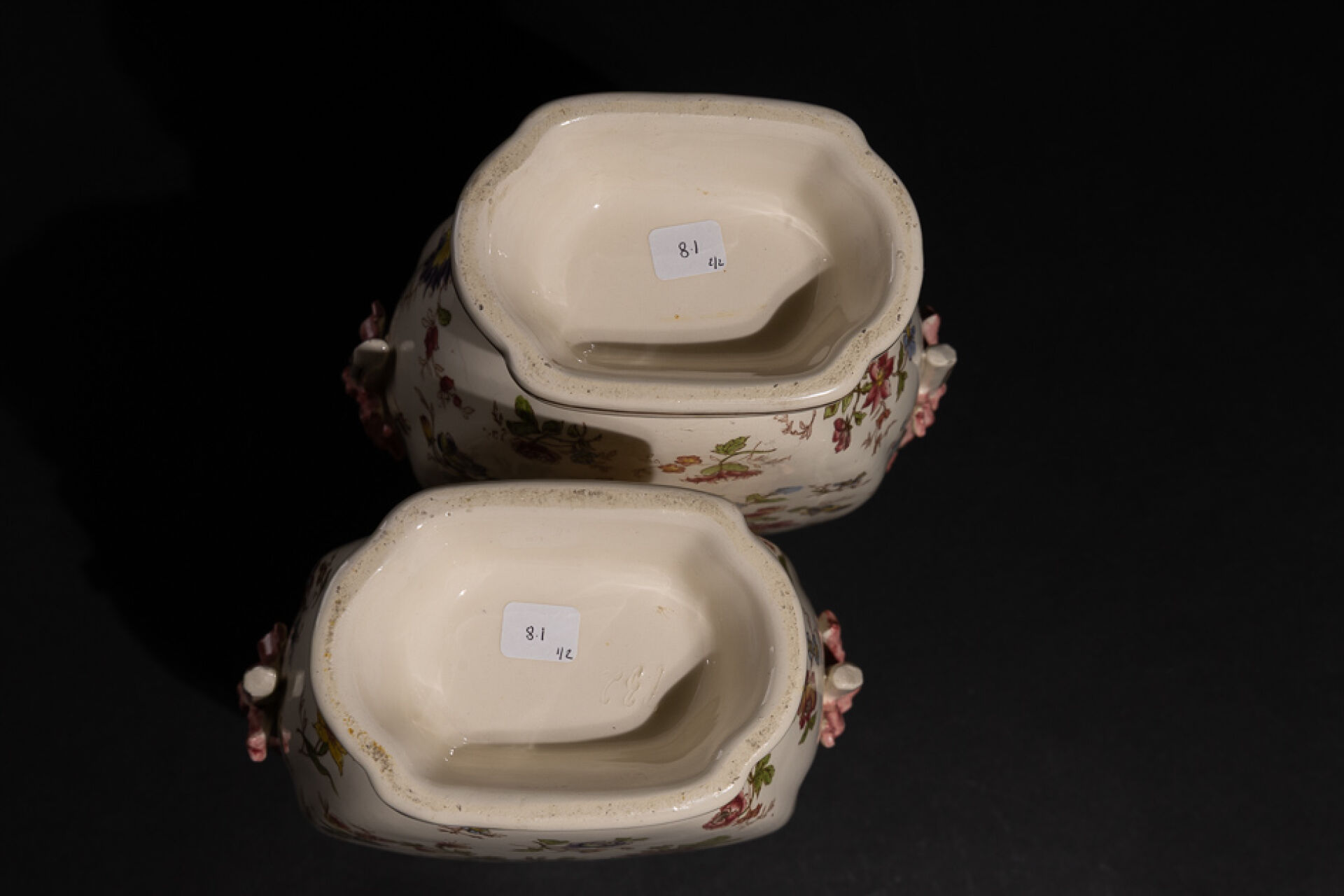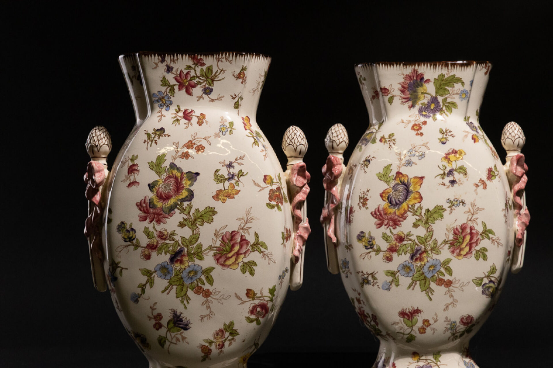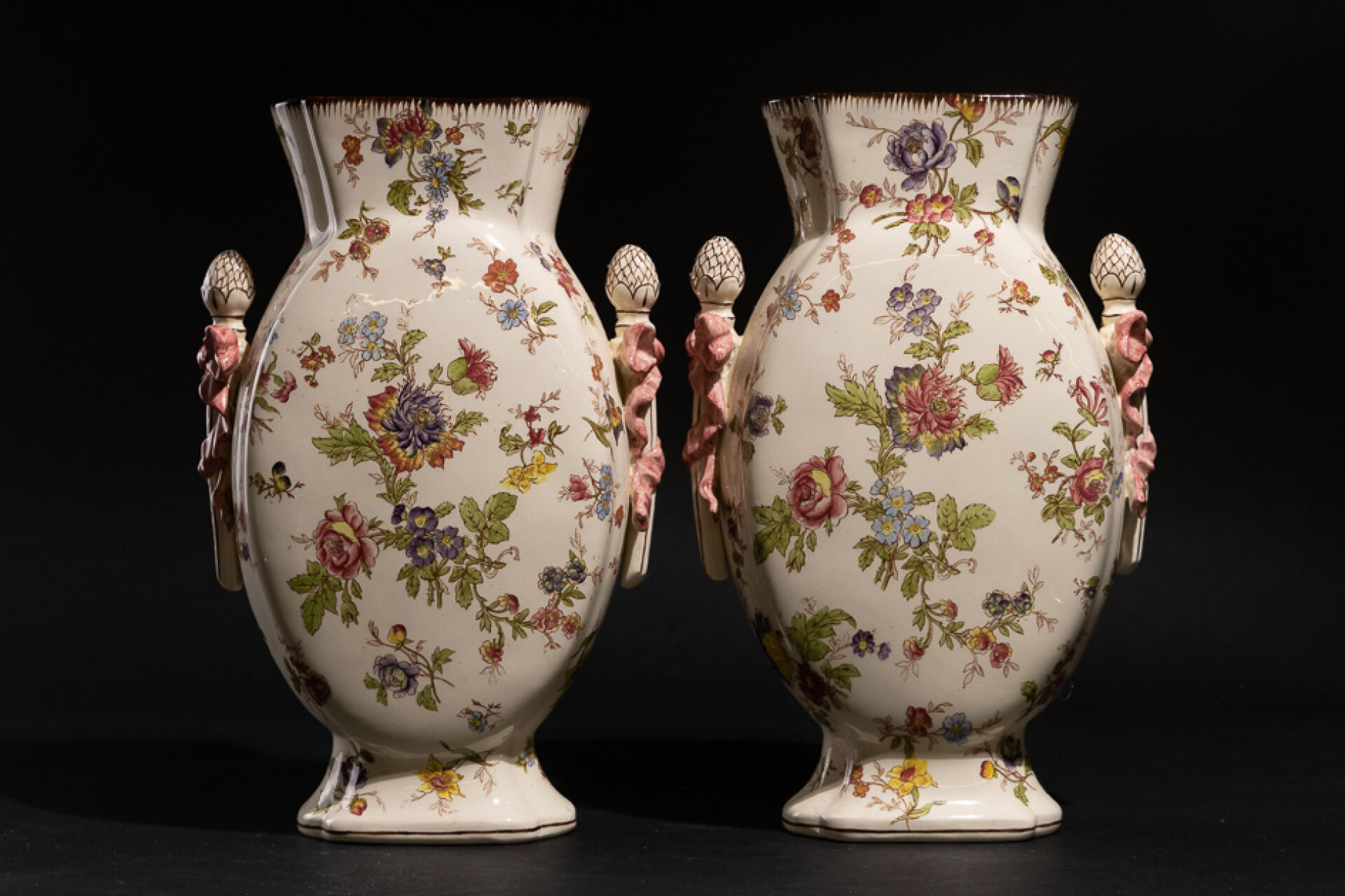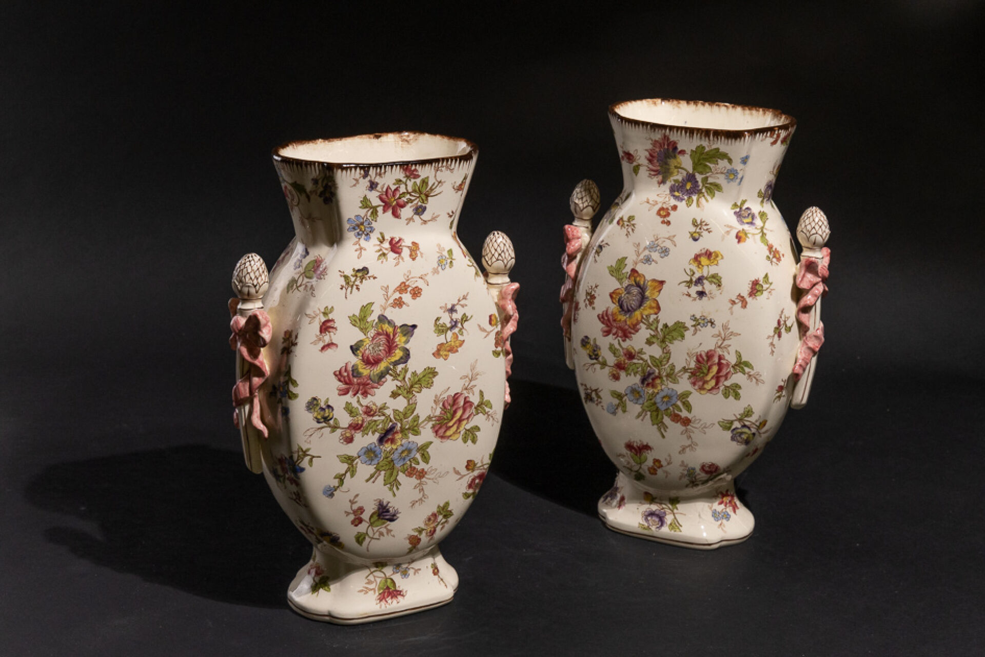 Manufacture de LONGCHAMPS. Paires de vases en faïence à décor décalcomanié de fleurs peintes au naturel, le col à ressaut laqué rose, les anses flanquées d'anses en thyrses à ruban noué rose, le pied quadrilobé, la panse aplatie. XXe siècle. Haut. : 35 cm - Larg. : 22.5cm