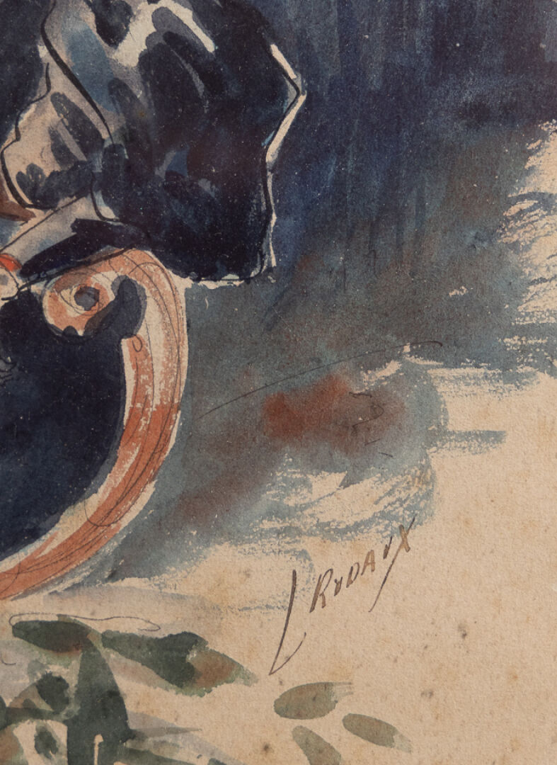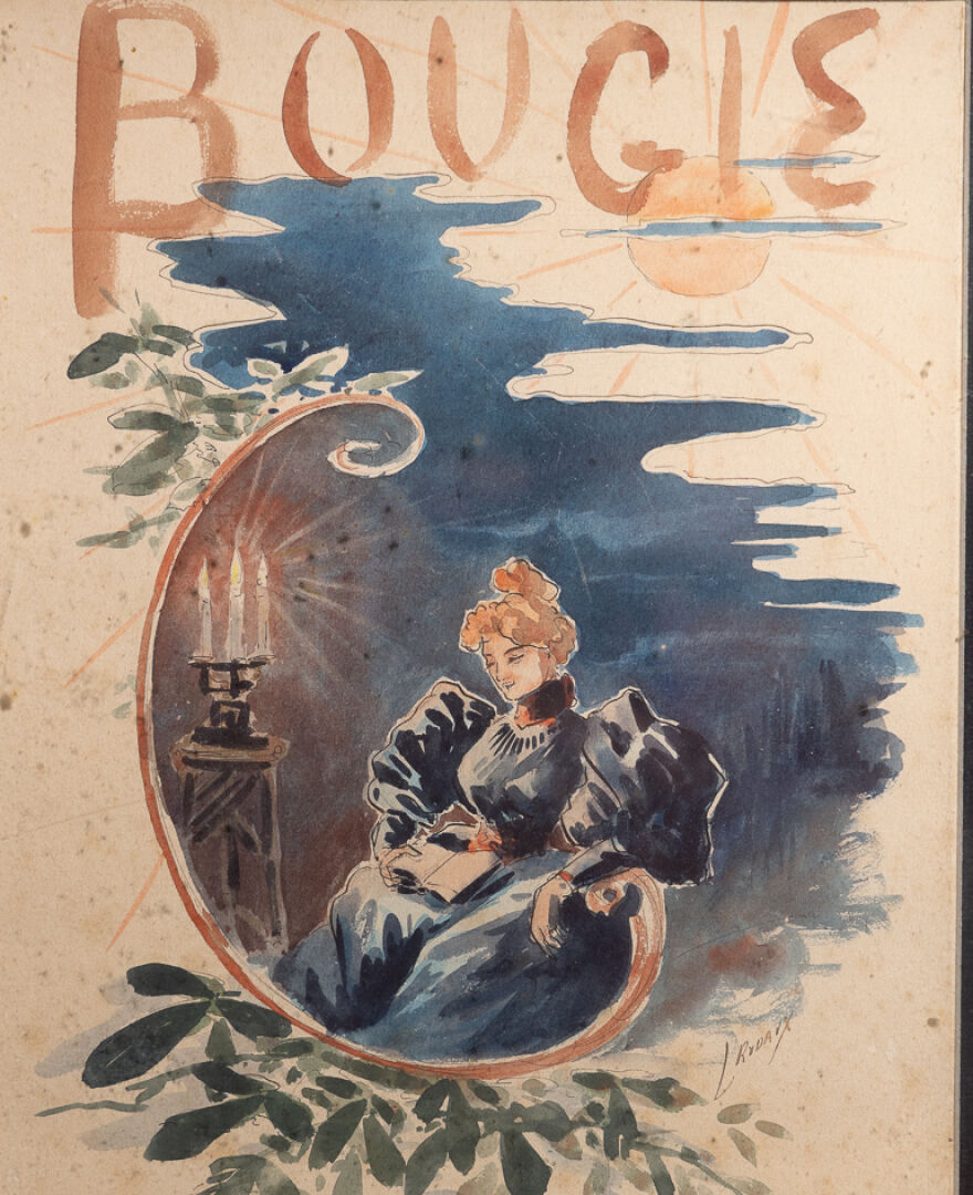 L. ROUAUX (XIX-XXe siècle). Femme à la lecture à la bougie. Projet aquarellé signé et marqué "BOUGIE ". Dim. à vue : Haut. : 29 cm - Larg. : 23 cm