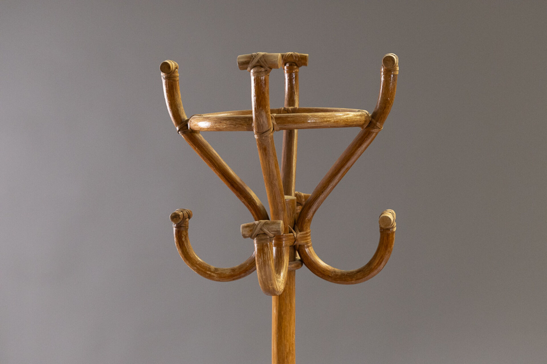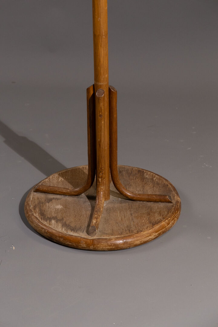 Porte-manteaux en bois thermoformé à huit paternes, le piètement circulaire (usures, état d'usage). Vers 1970. Haut. : 174 cm