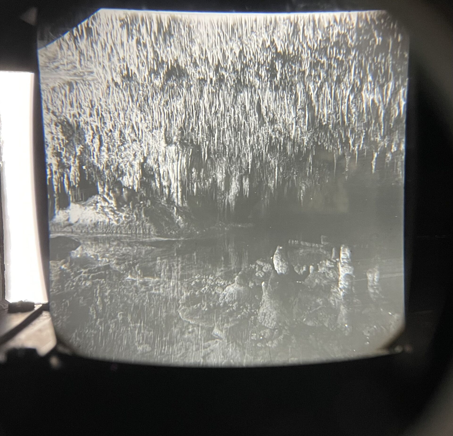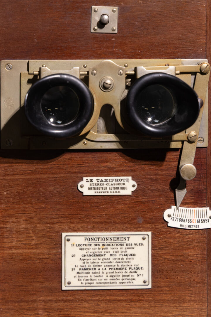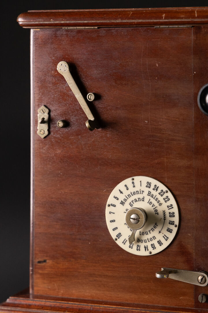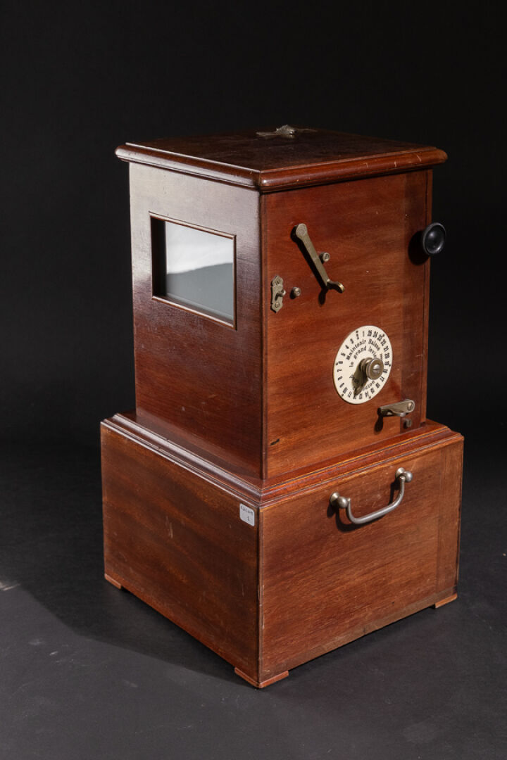 Vérascope dit Richard modèle Taxiphote en noyer, la partie basse à anses mobiles. Vers 1900. Haut. : 49.5 cm - Côté. : 28 cm On joint : Sept boîtes contenant des plaques en verre figurant Fontainebleau, châteaux de la Loire, Exposition Coloniale de Paris 193.