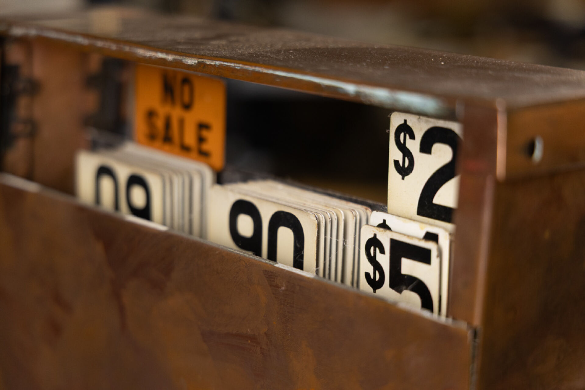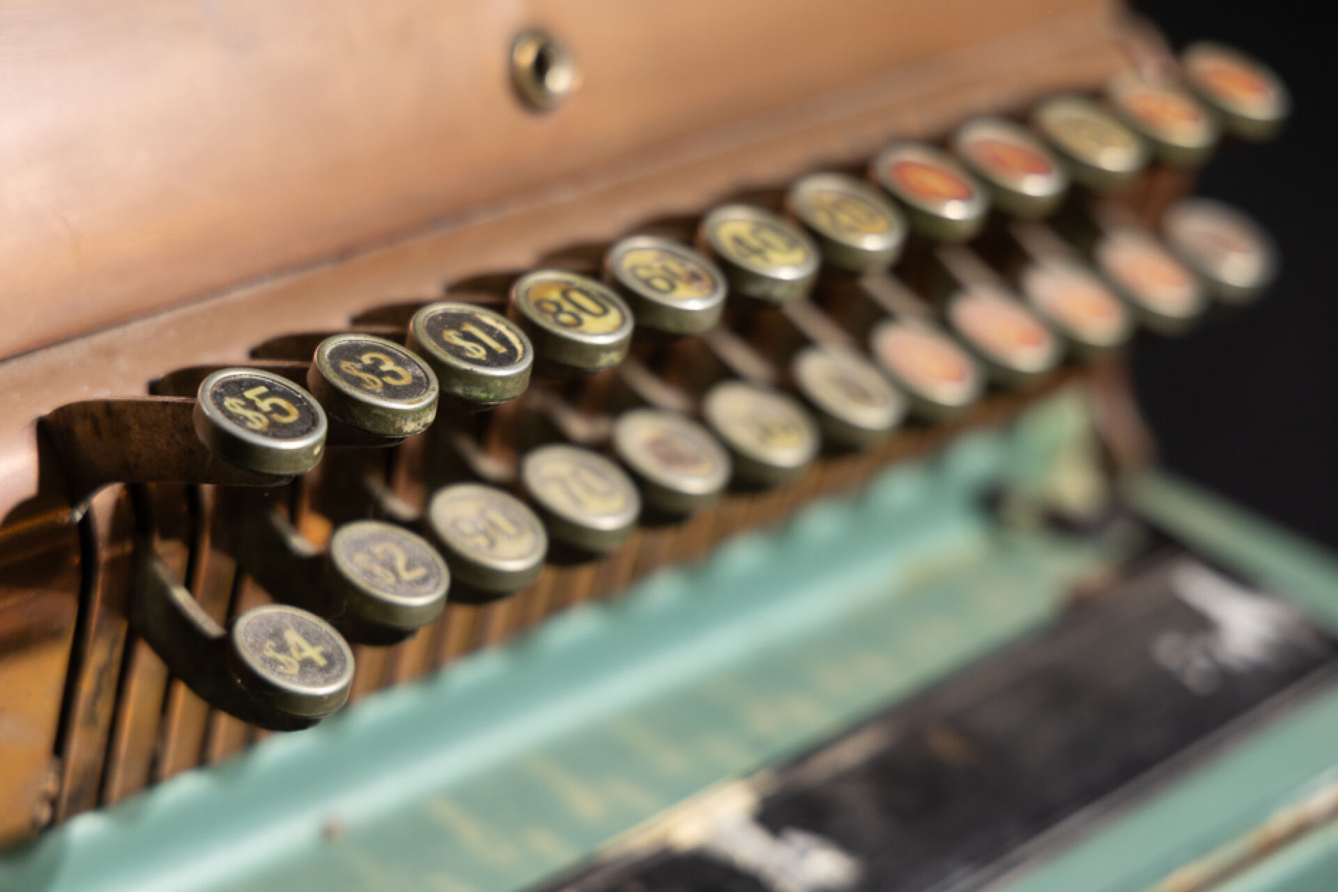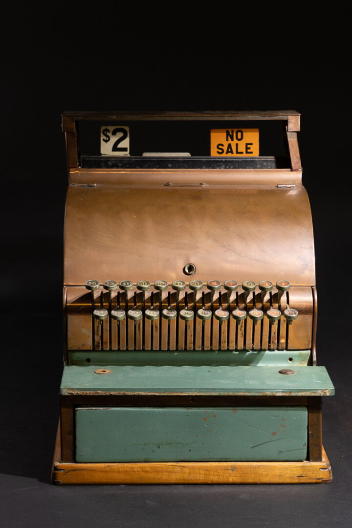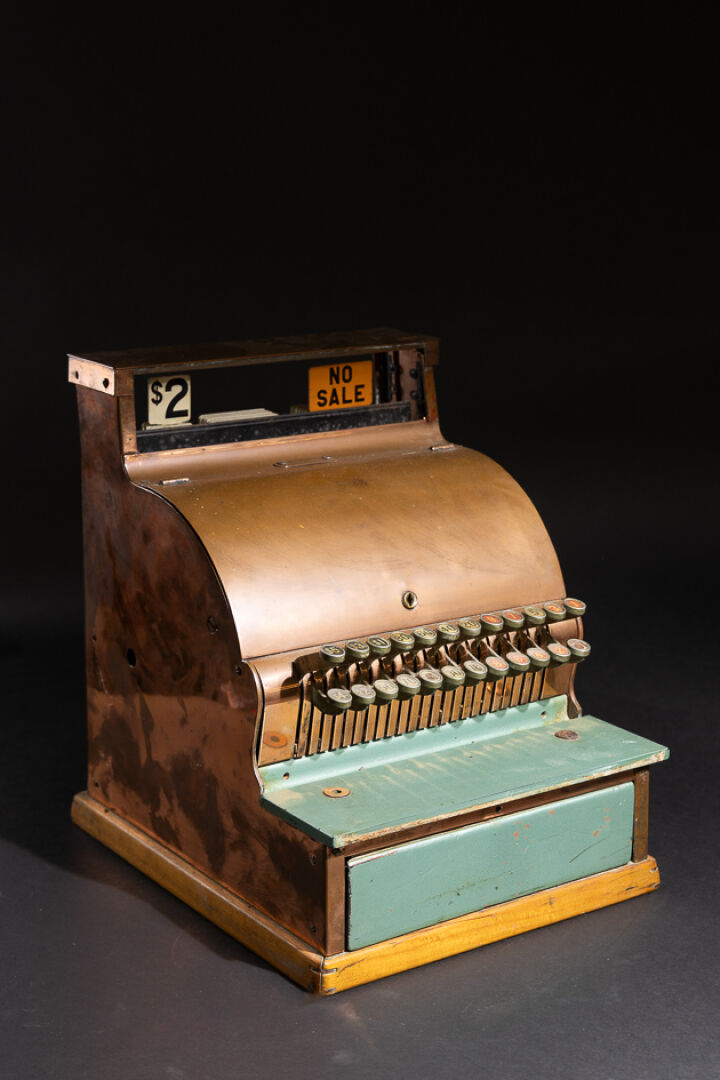 Attribuée à la NATIONAL CASH REGISTER. Caisse enregistreuse en métal, cuivre et bois, portant une plaque numérotée 2773512/722-T, avec afficheur publique, vingt-quatre touches à chiffre dont dollar (accidents, chocs, manques et tiroir caisse bloqué). États-Unis, vers 1920. Haut. : 45 cm - Larg. : 36 cm - Prof. 41 cm