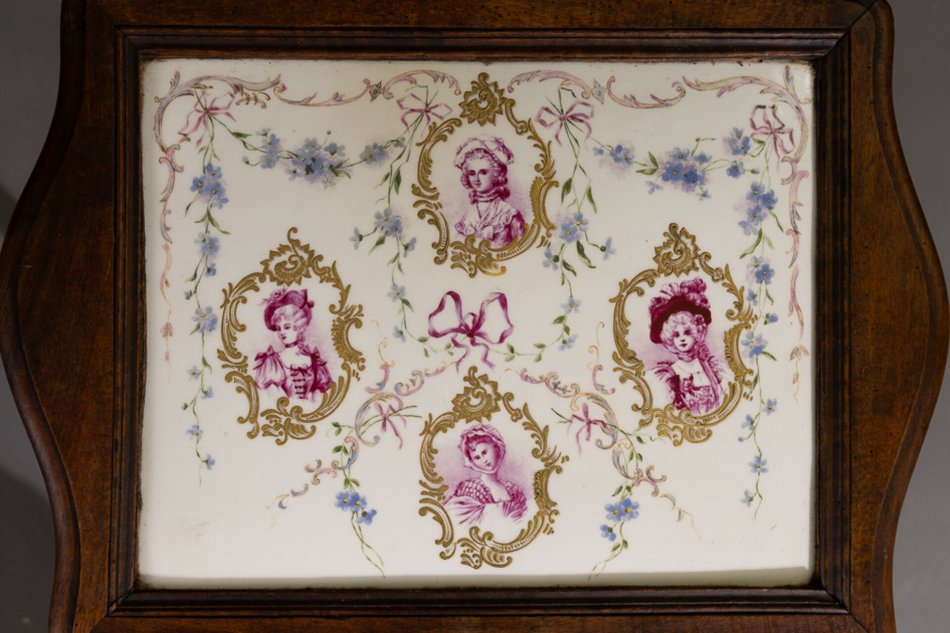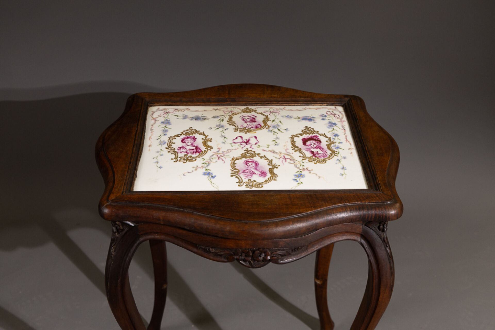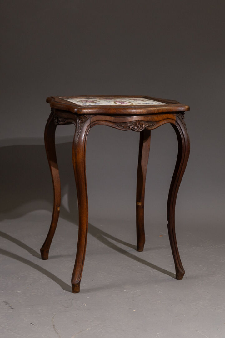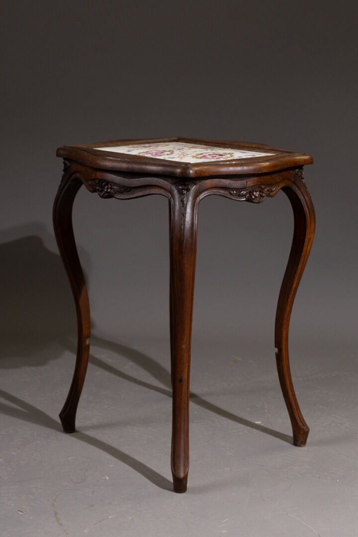 Table de salon en bois teinté, le plateau polylobé enchâsse une plaque en porcelaine à quatre bustes de femmes à la manière du XVIIIe siècle dans des entourages rocailles et fleurettes, la ceinture fleurie, les pieds sinueux (manque la tablette d'entretoise). Style Louis XV. Haut. : 75 cm - Larg. : 58 cm - Prof. : 52 cm