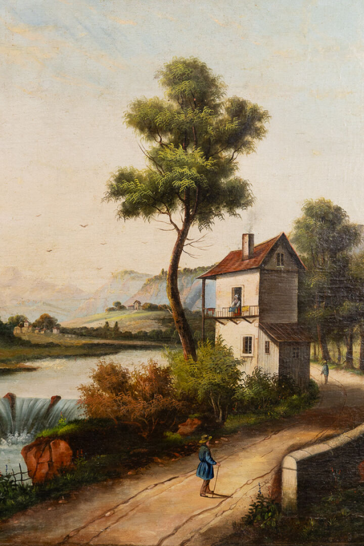 Trumeau en bois stuqué et redoré, la partie basse ornée d'un miroir, la partie haute tendue d'une toile peinte figurant un passant dans un paysage (petits accidents, restaurations) XIXe siècle. Haut. : 137 cm - Larg. : 76 cm