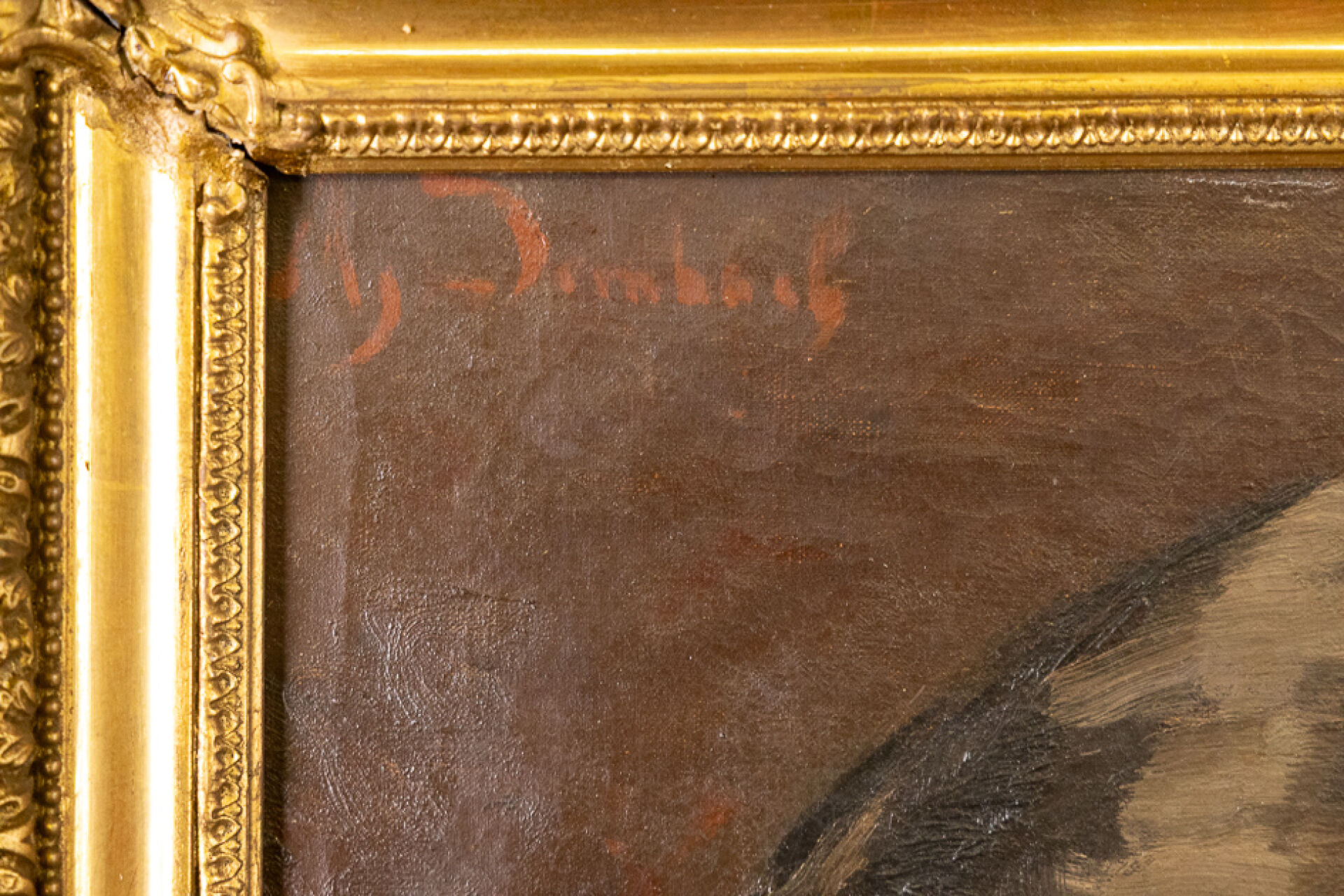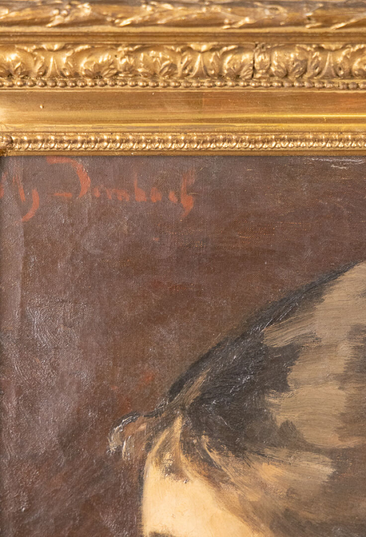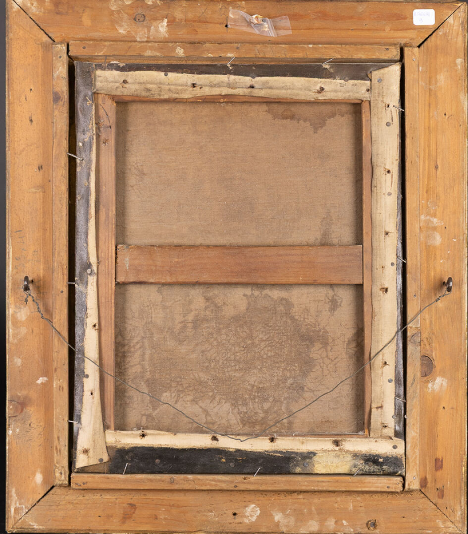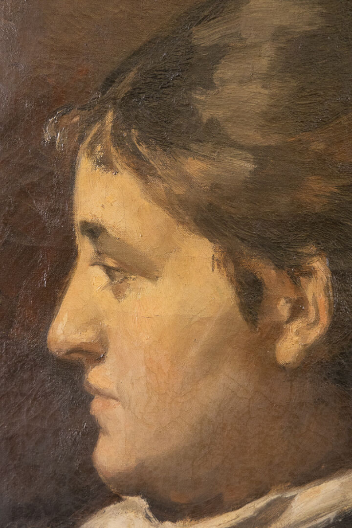 École du XIXe siècle. Portrait de femme au chignon, de profil. Huile sur toile, signée en haut à gauche (craquelures). Haut. : 41.5 cm - Larg. : 33 cm