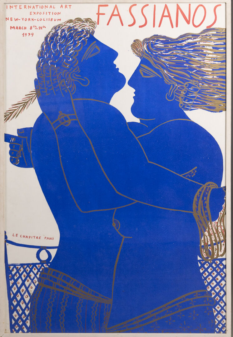 D'après Alexandre FASSIANOS (1935-2002). Couple de profil en bleu. Affiche de l'exposition International Art, New-York Coliseum Mars 8-12 1979 , annotée Le chapitre Paris. Haut. : 113 cm - Larg. : 75,5 cm