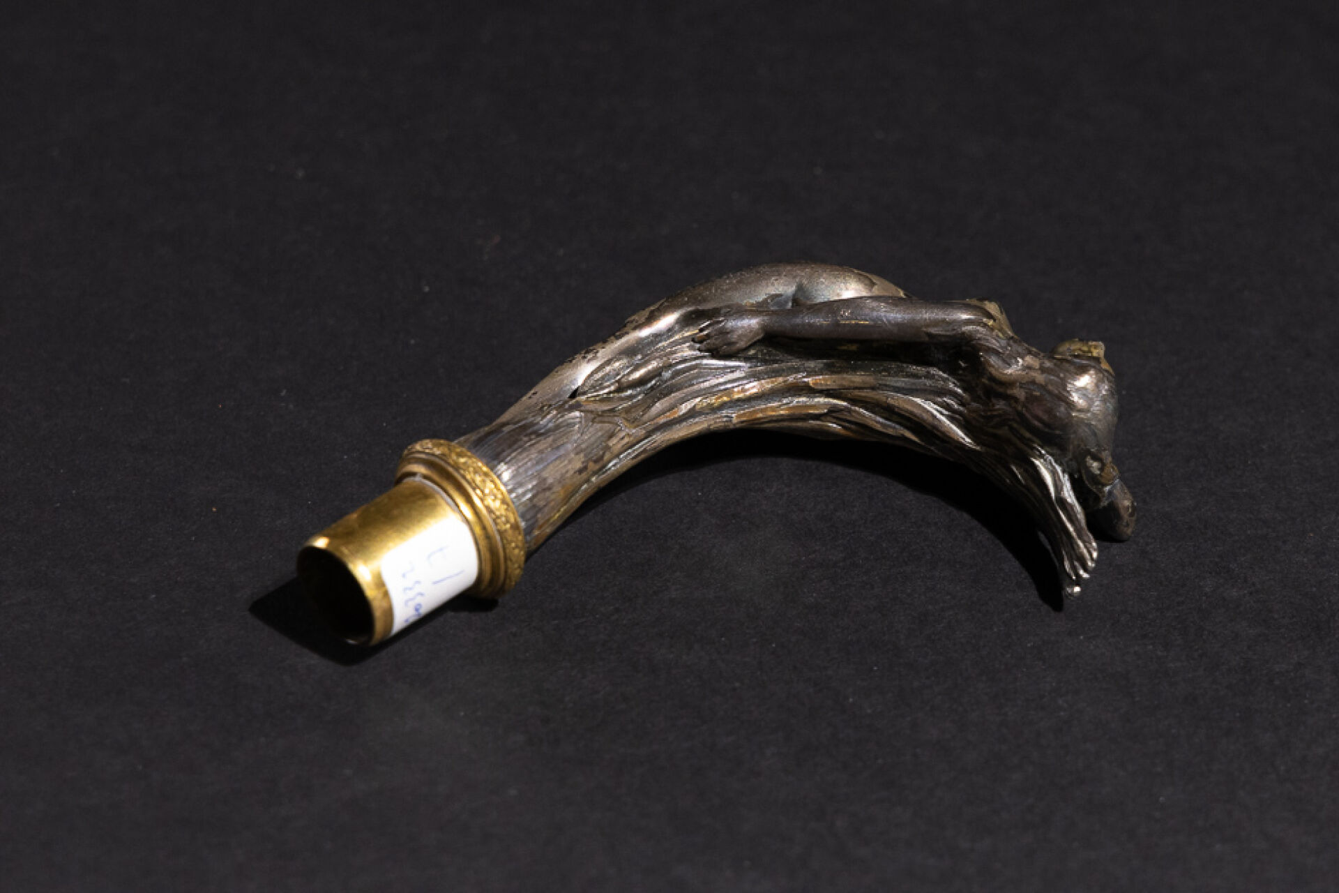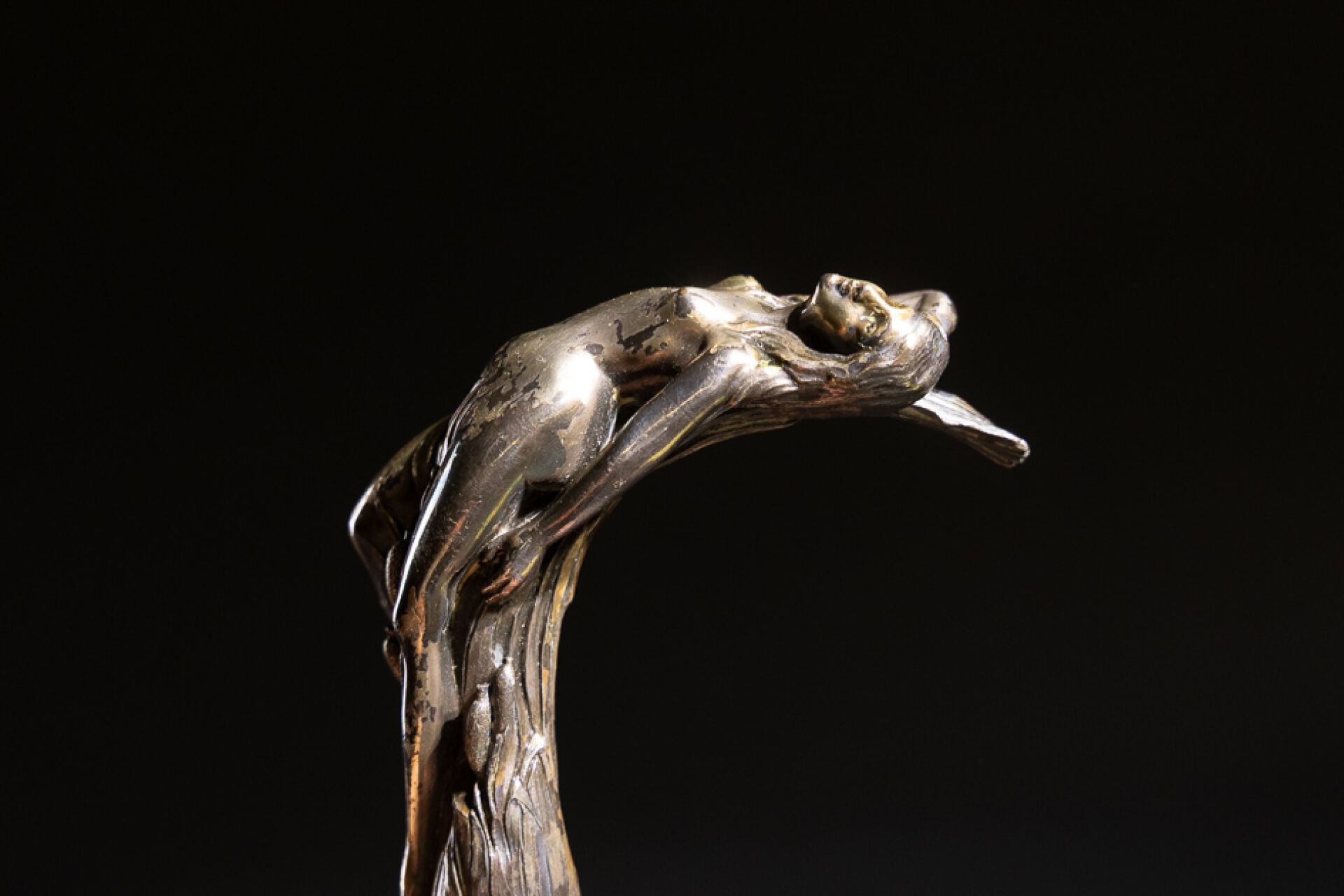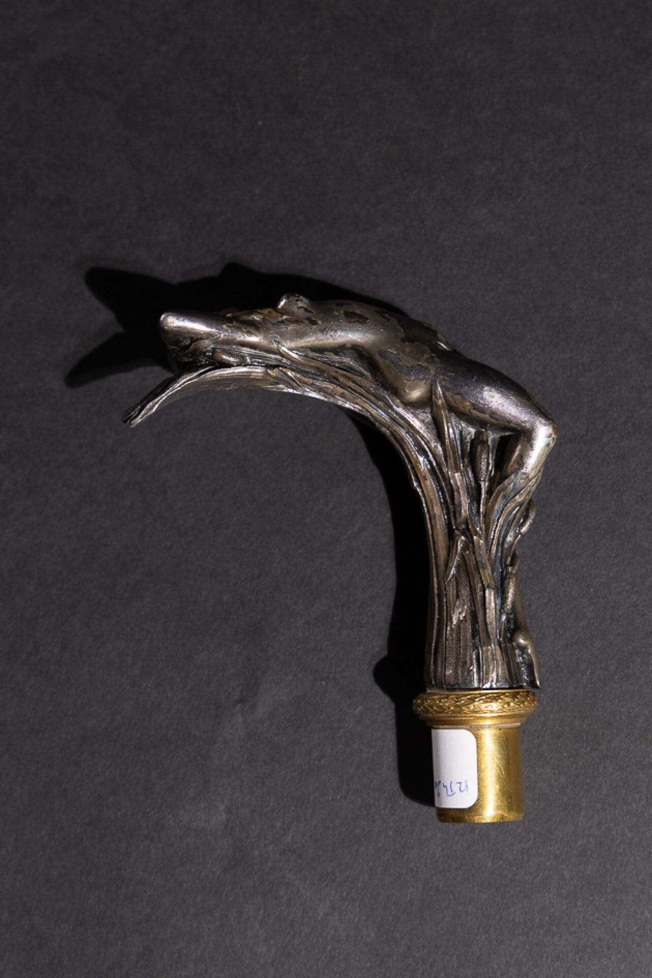 Pommeau de canne en bronze argenté figurant une jeune femme alanguie dans les roseaux (usures à la patine). Époque Art Nouveau. Haut. : 11.5 cm - Larg. : 9.5 cm