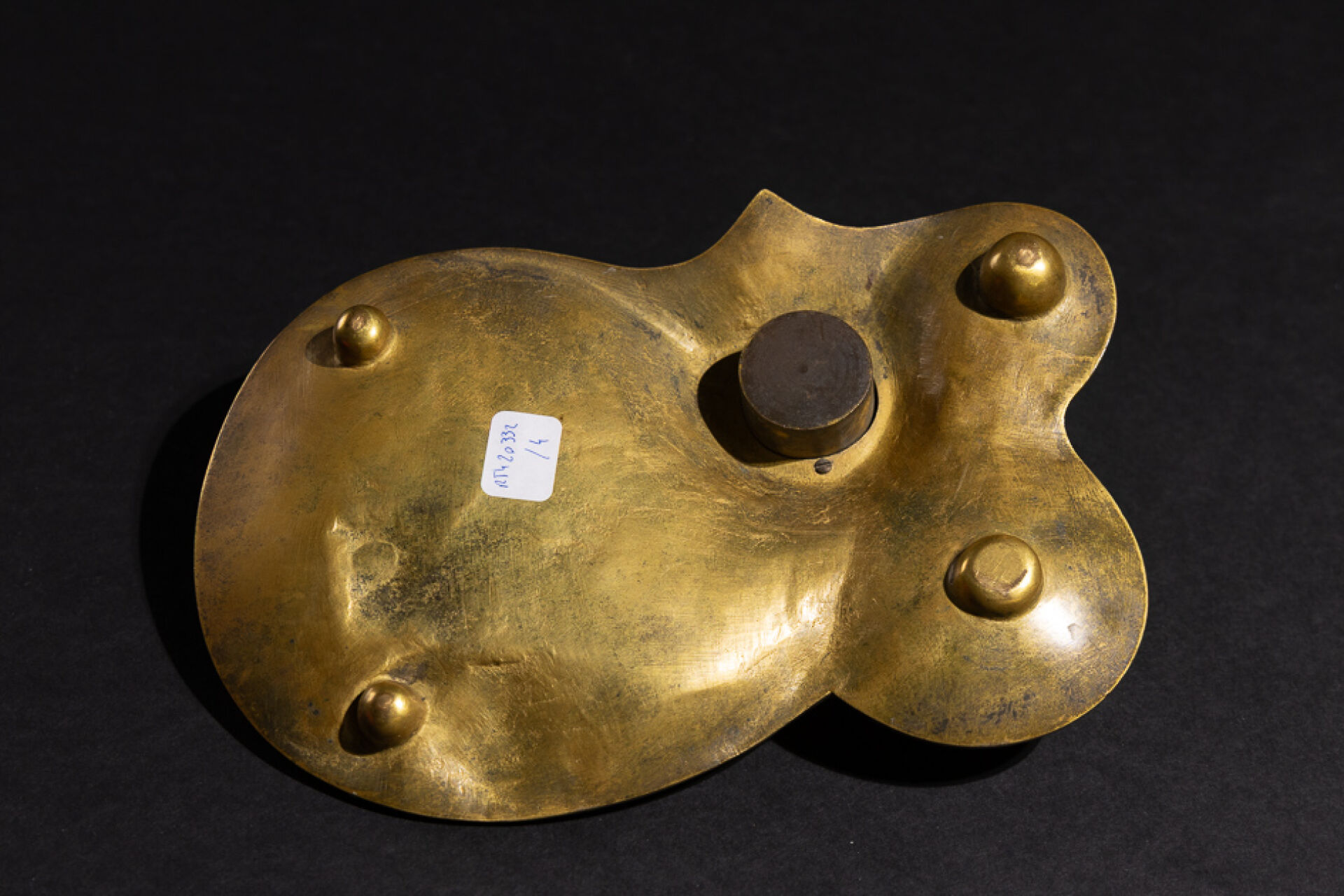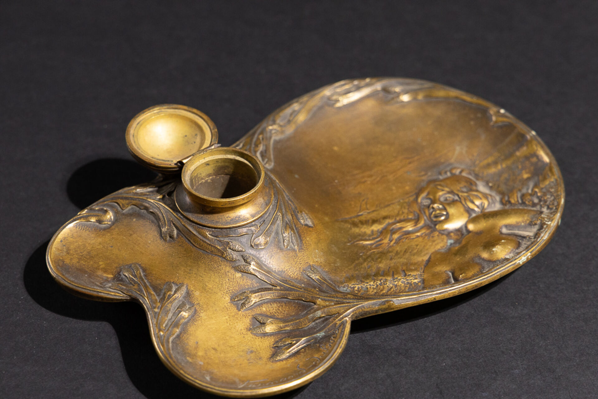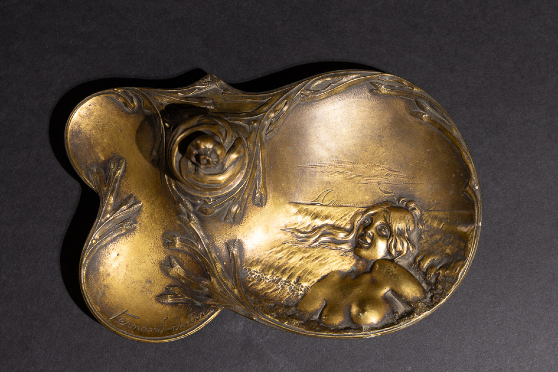 Fernand DUBOIS (XIXe siècle). Encrier en bronze ciselé à décor de naïade, l'encrier à bouton de fleurs, signé (manque la doublure en verre, anciennement patiné). Haut. : 7 cm - Larg. : 23 cm