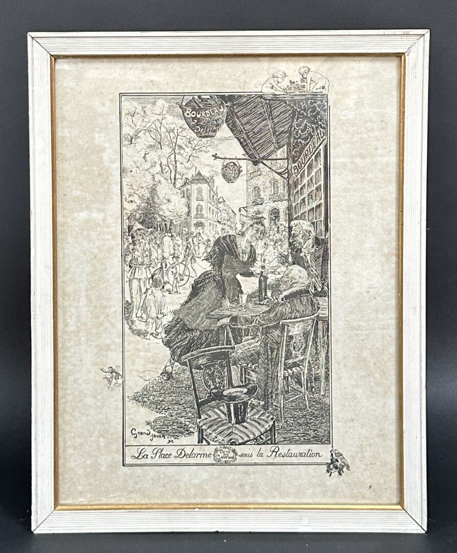 Jules GRANDJOUAN (1875-1968). "La cave des Gourmets". Gravure en noir, signée dans la planche, figurant la place Delorme sous la Restauration, à Nantes (mouillures). Dim. à vue : Haut. : 37,5 cm - Larg. : 28,5 cm