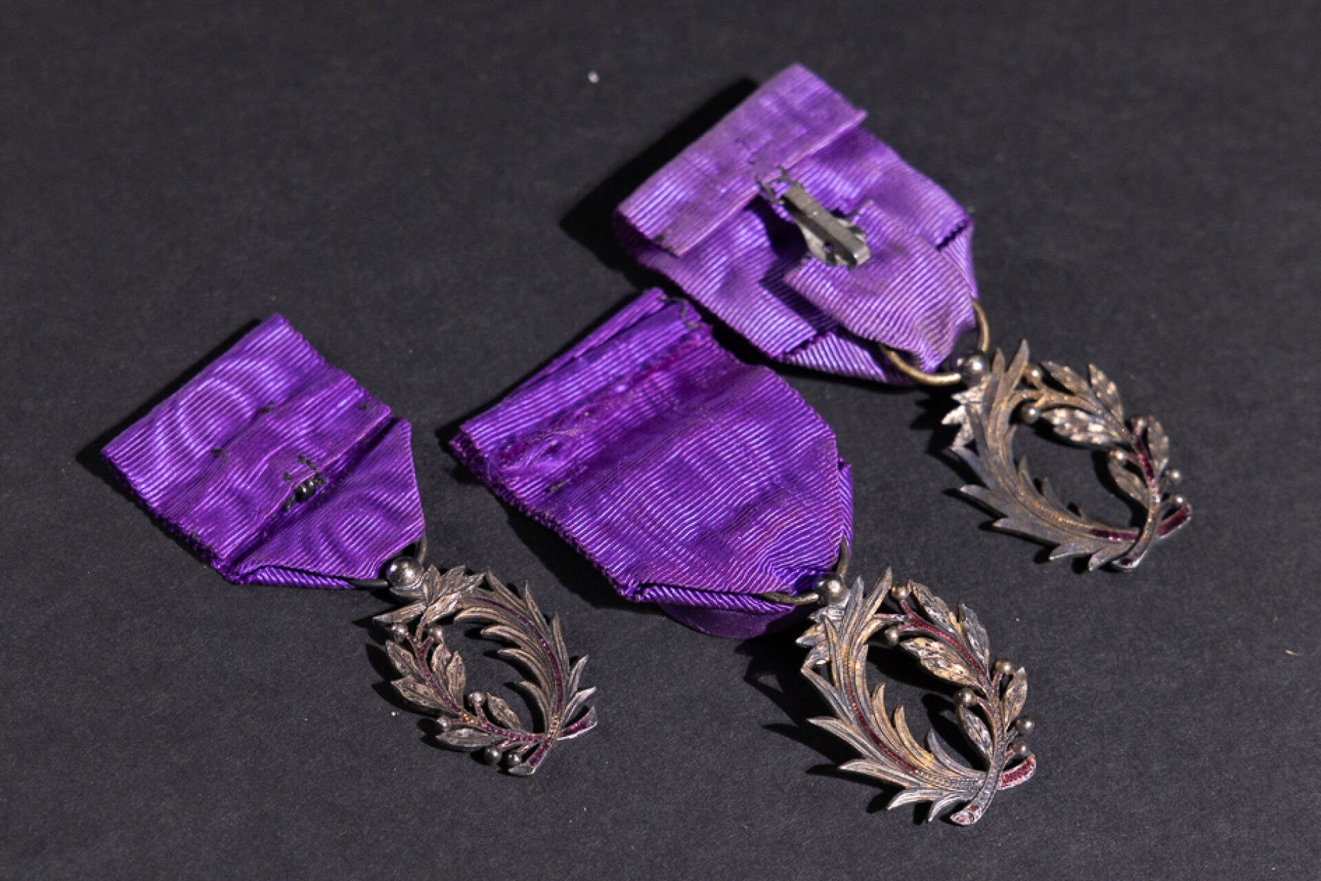 Trois médailles de Palmes Académiques en argent, partiellement émaillées, avec ruban. XXe siècle. Poids brut : 44 g