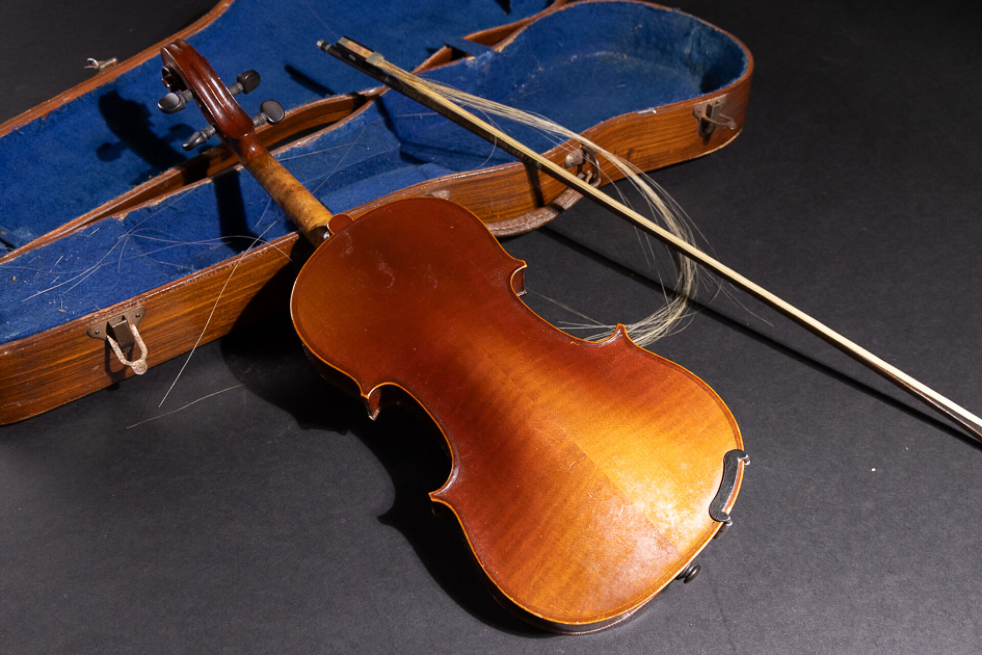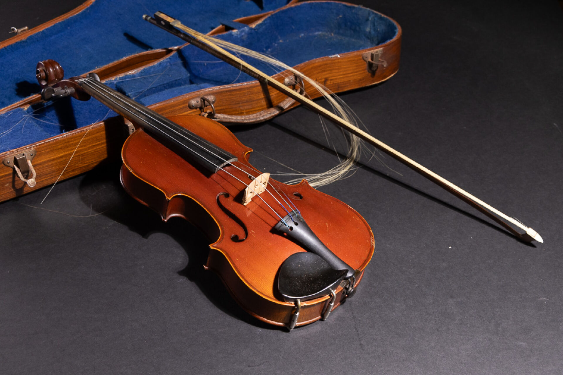 Violon d'étude en bois portant une étiquette COMPAGNON et I en chiffre romain (état d'usage, accidents). Long. violon : 50 cm On joint : - Archet (accidenté). Long. archet : 63 cm ; - Étui.