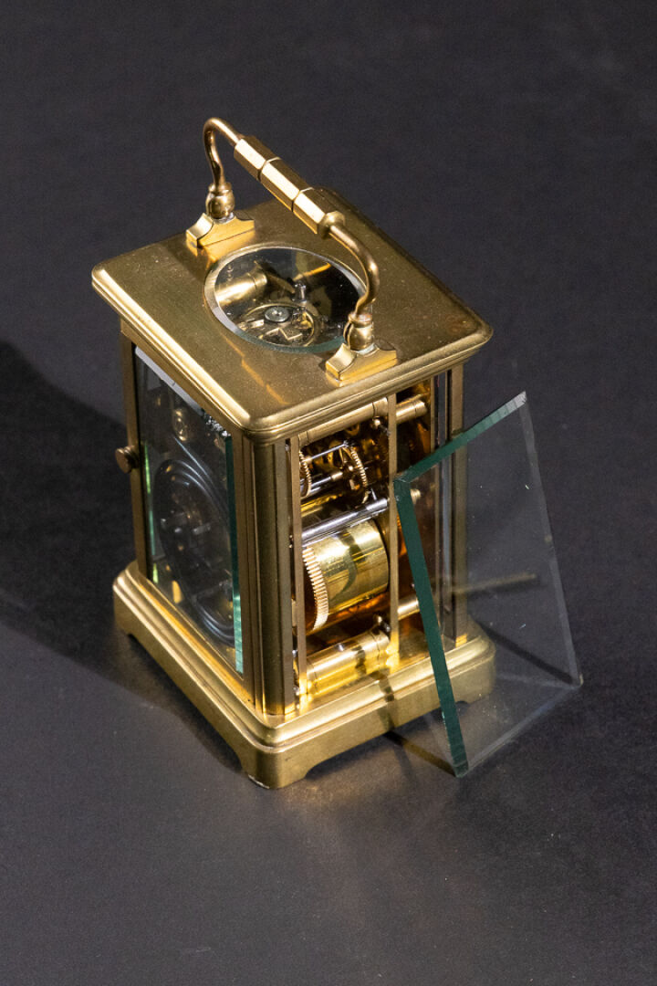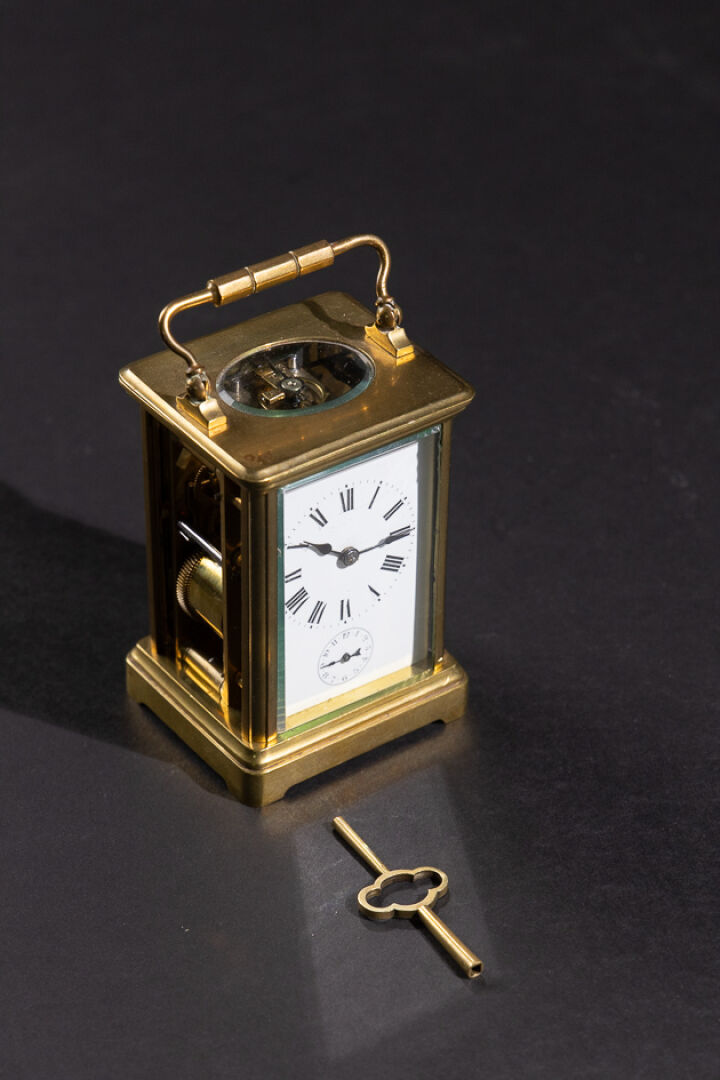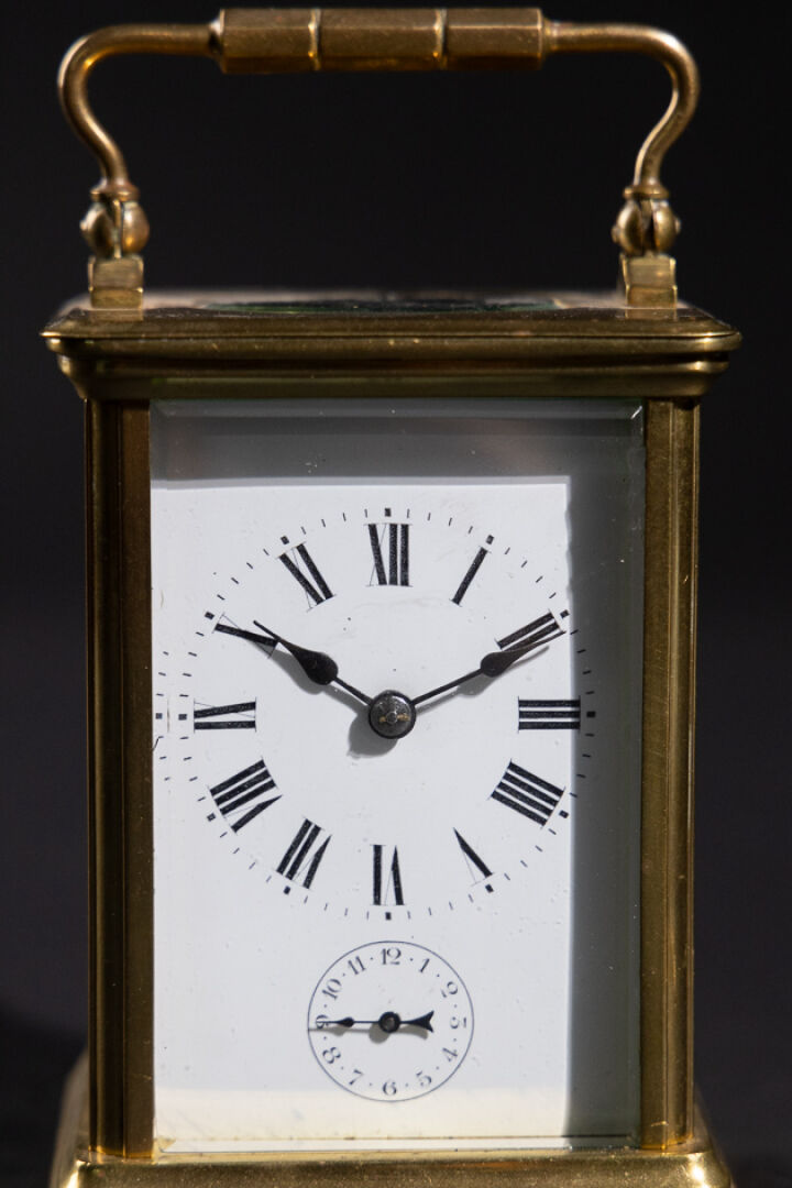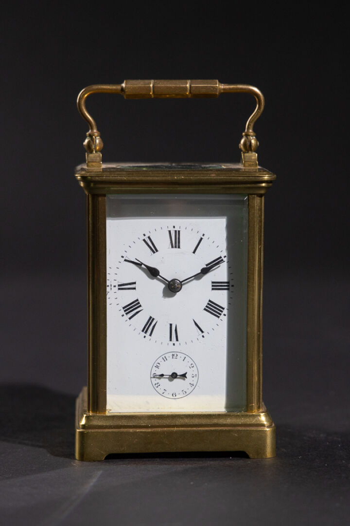 Pendulette de voyage en laiton et verre biseauté, le cadran émaillé blanc aux heures à chiffres romains, et les heures du réveil en chiffres arabes (petits accidents, une plaque en verre déchaussée), l'anse mobile. XXe siècle. Haut. : 11 cm - Larg. : 8 cm - Larg. : 7 cm