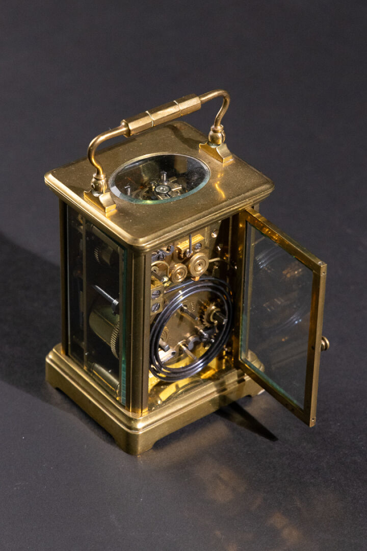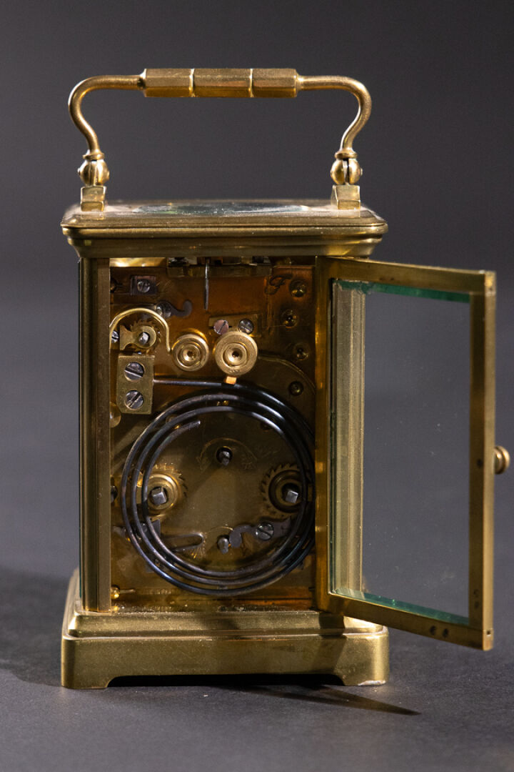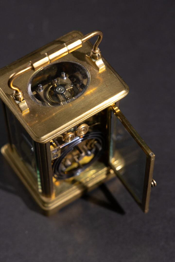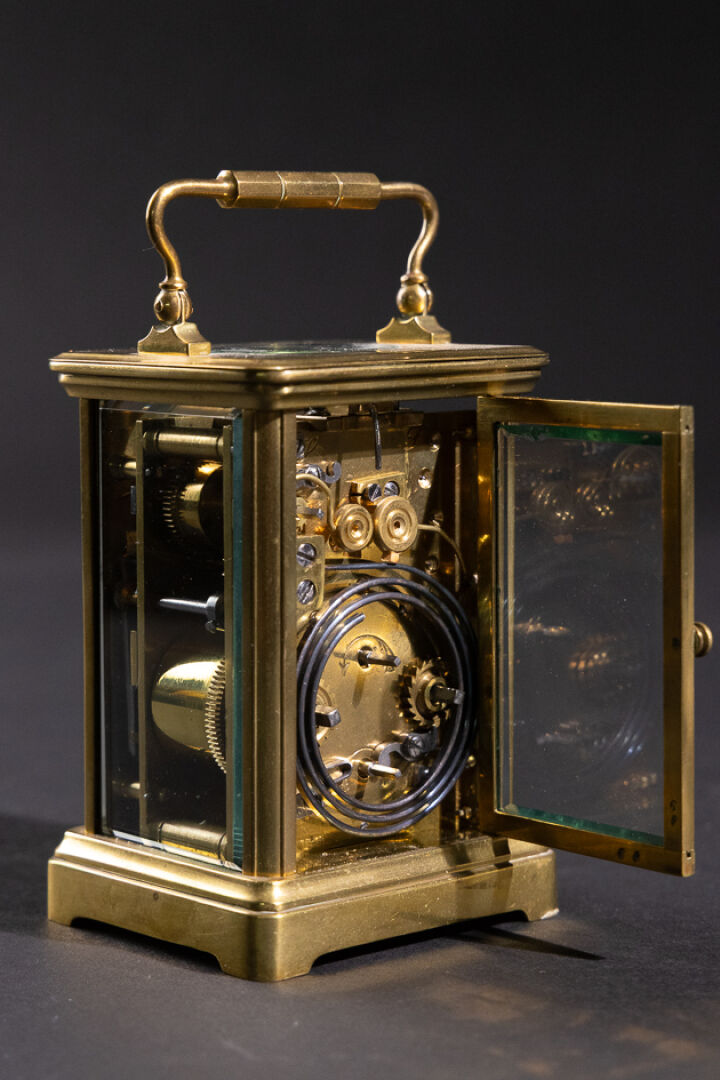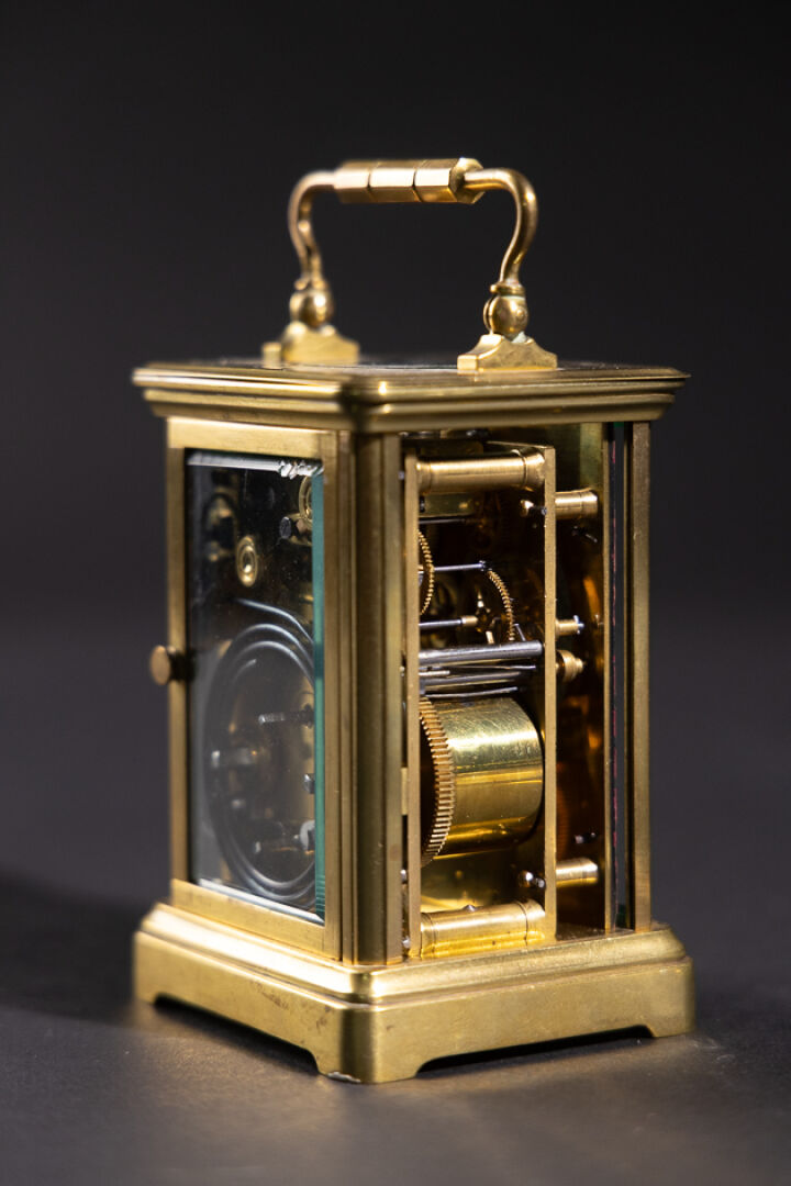 Pendulette de voyage en laiton et verre biseauté, le cadran émaillé blanc aux heures à chiffres romains, et les heures du réveil en chiffres arabes (petits accidents, une plaque en verre déchaussée), l'anse mobile. XXe siècle. Haut. : 11 cm - Larg. : 8 cm - Larg. : 7 cm