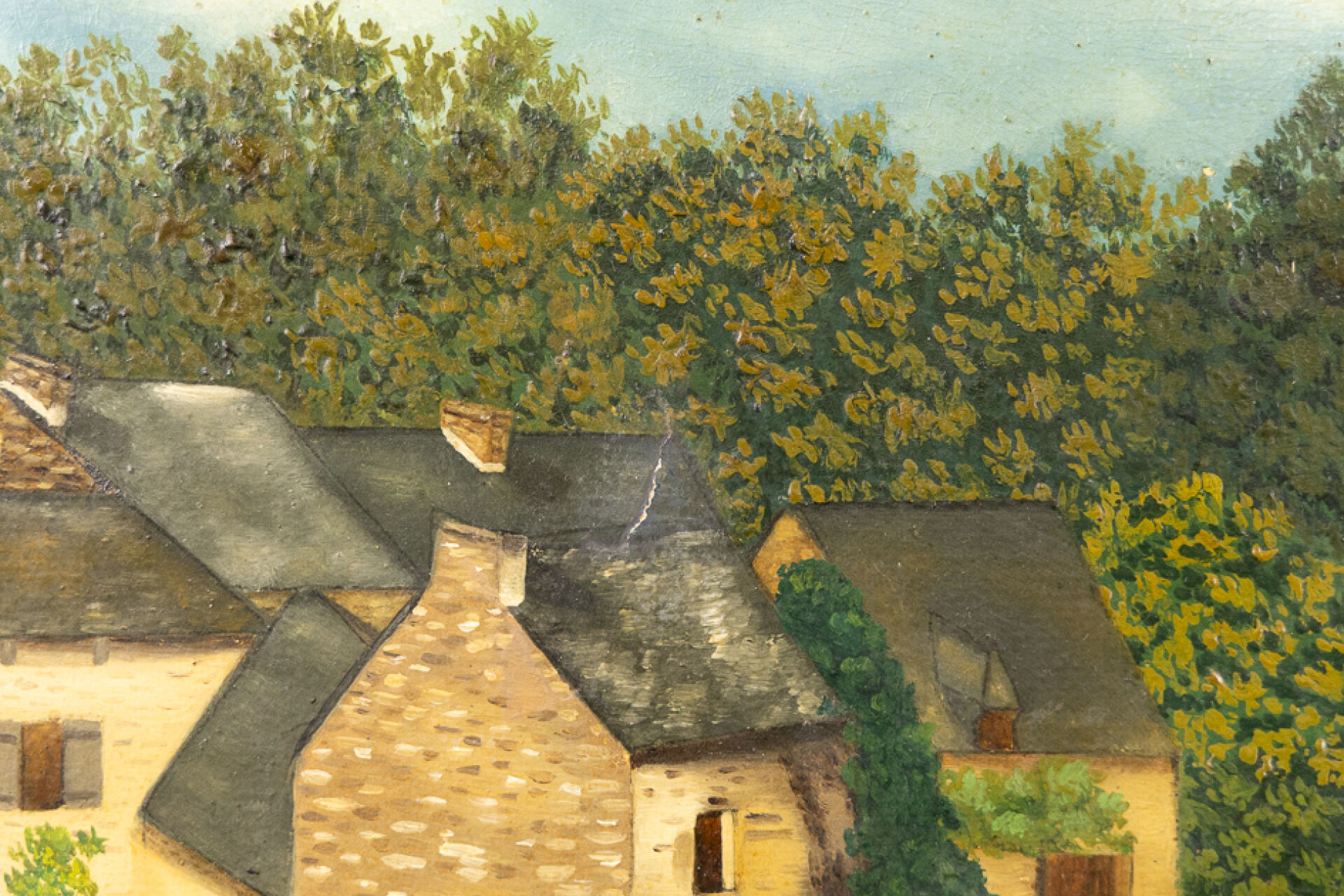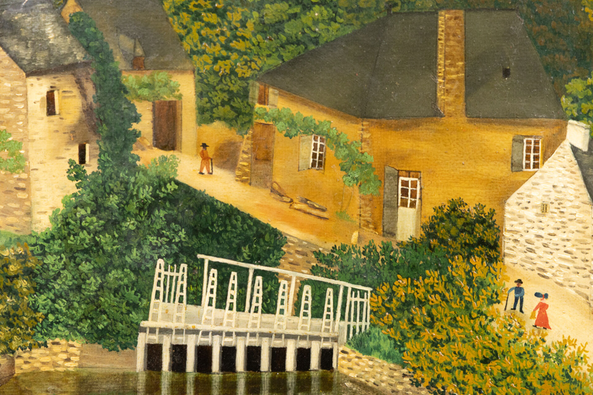 École du XXe siècle. Paysage animé à l'écluse. Huile sur toile (restaurations). Haut. : 32 cm - Larg. : 40 cm