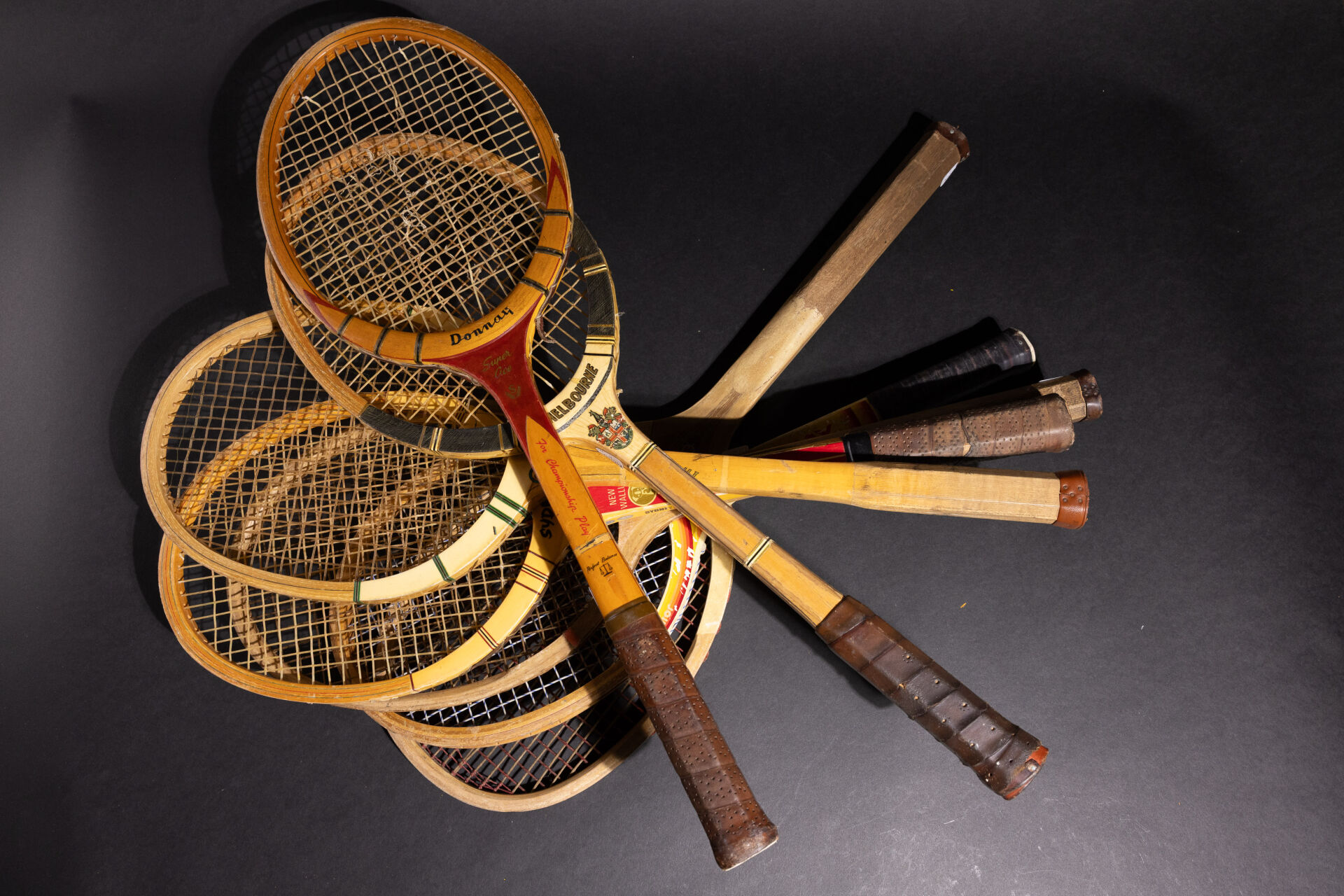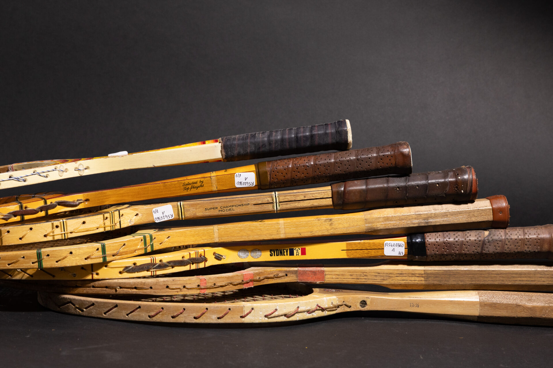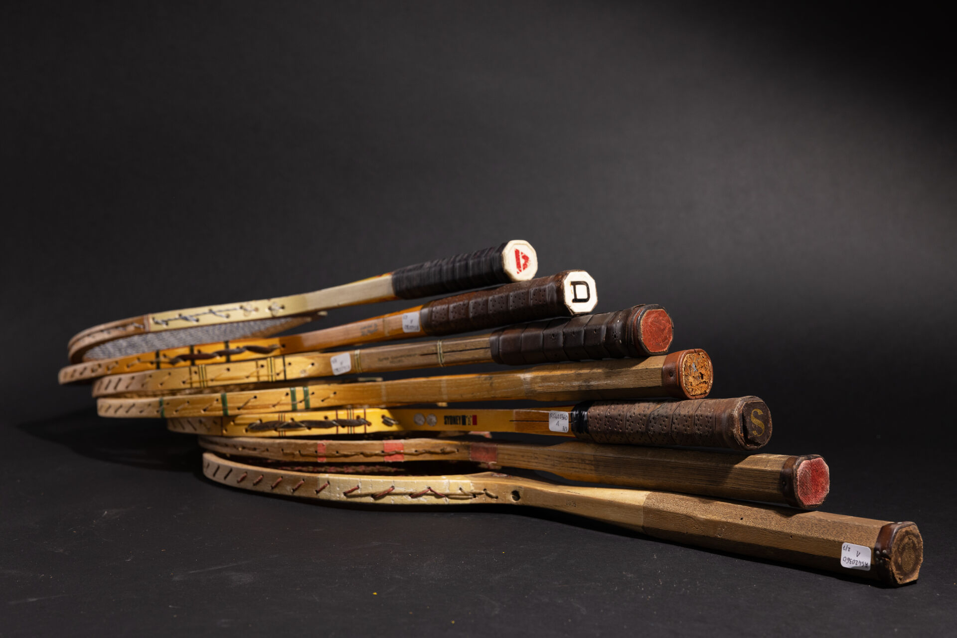 Ensemble de sept raquettes de tennis en bois, diverses marques (accidents). Long. moyenne : 69 cm