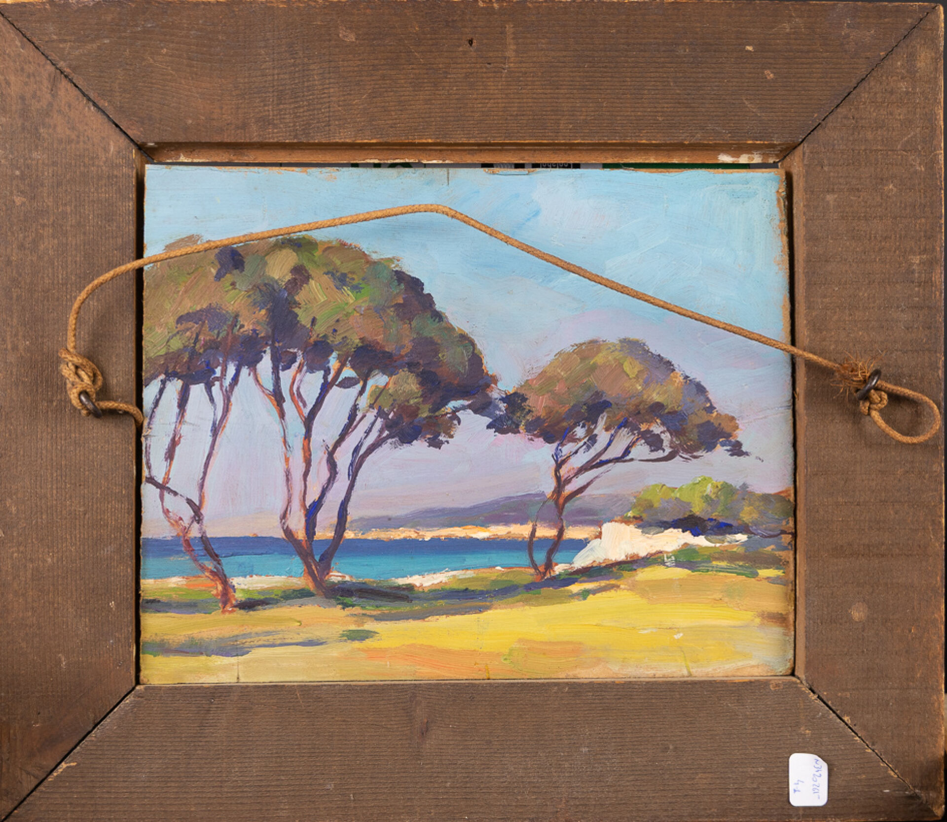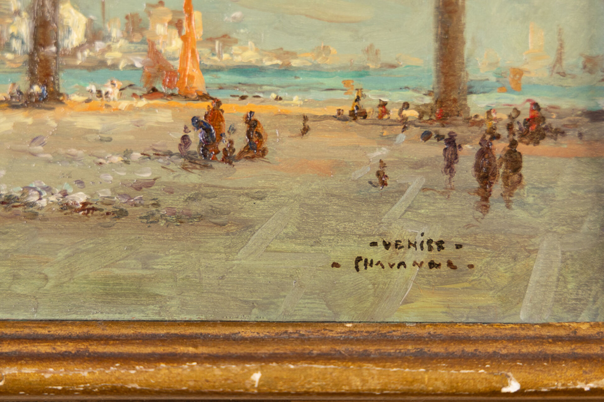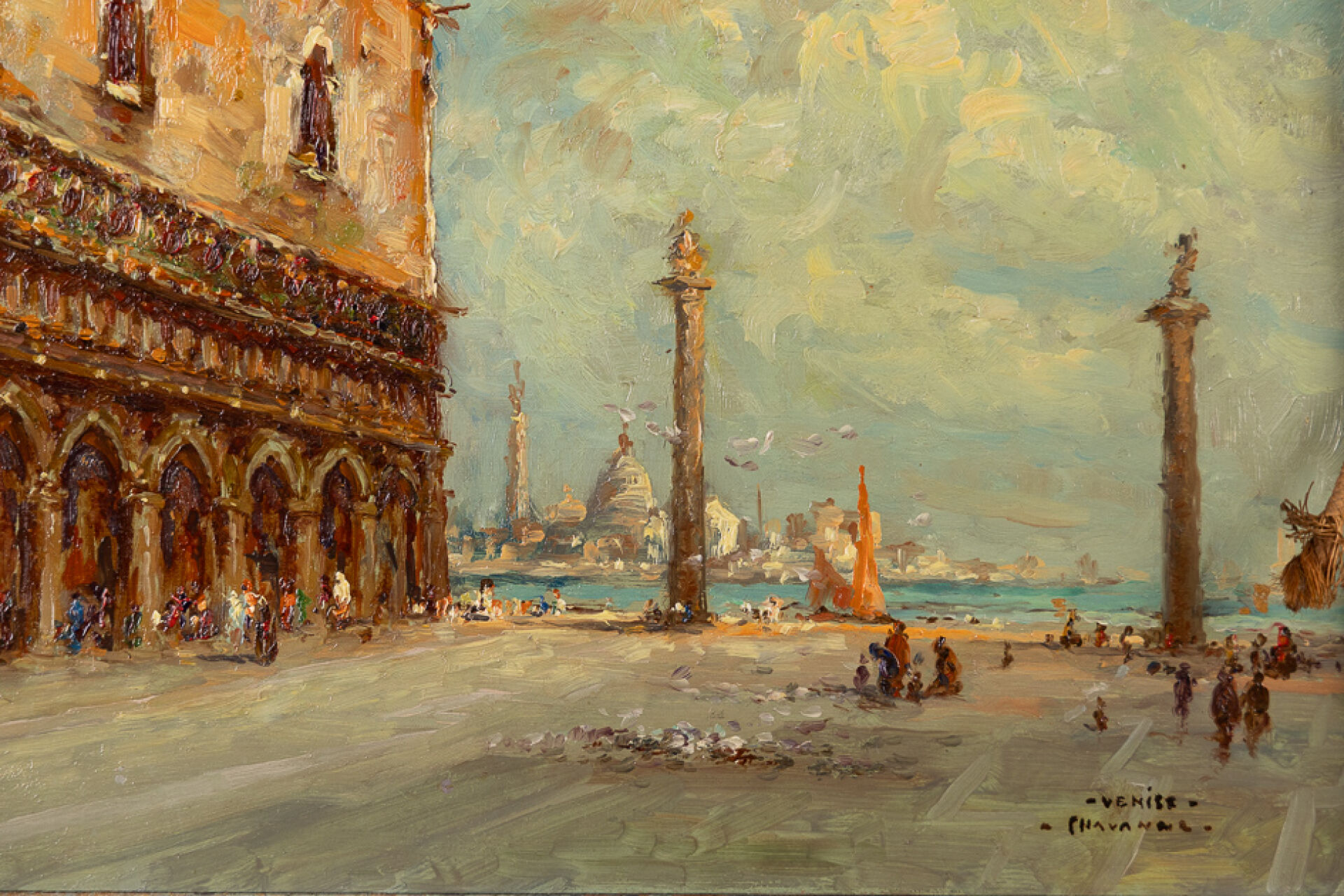 CHAVANNE (XXe siècle). Vue du Palais des Doges de Venise, de la place Saint Marc, Santa Maria della Salute en arrière-plan. Toile contre-collée sur panneau, signée et située en bas à droite, un paysage au bord de mer aux pins au revers. Haut. : 21 cm - Larg. : 27 cm