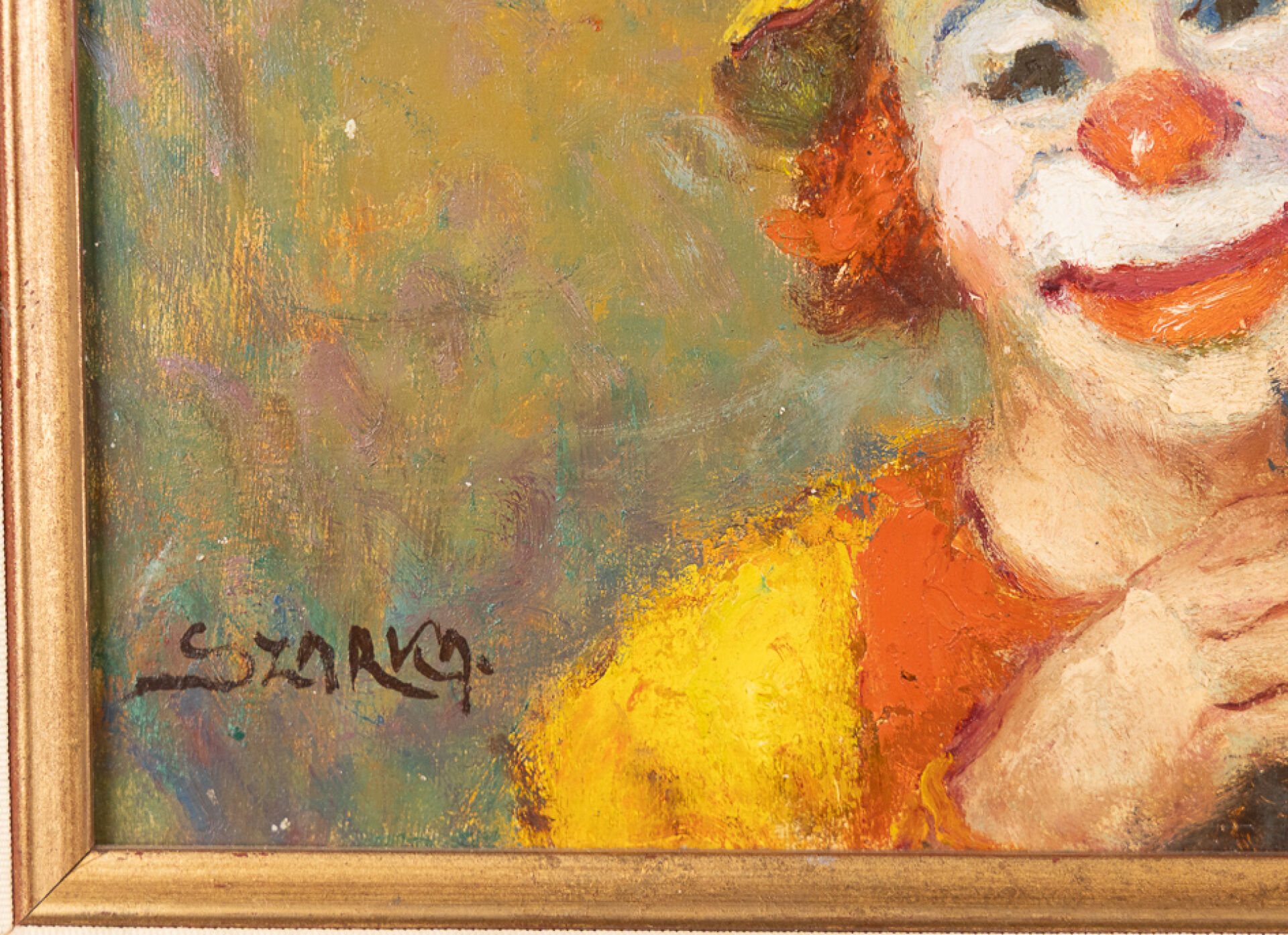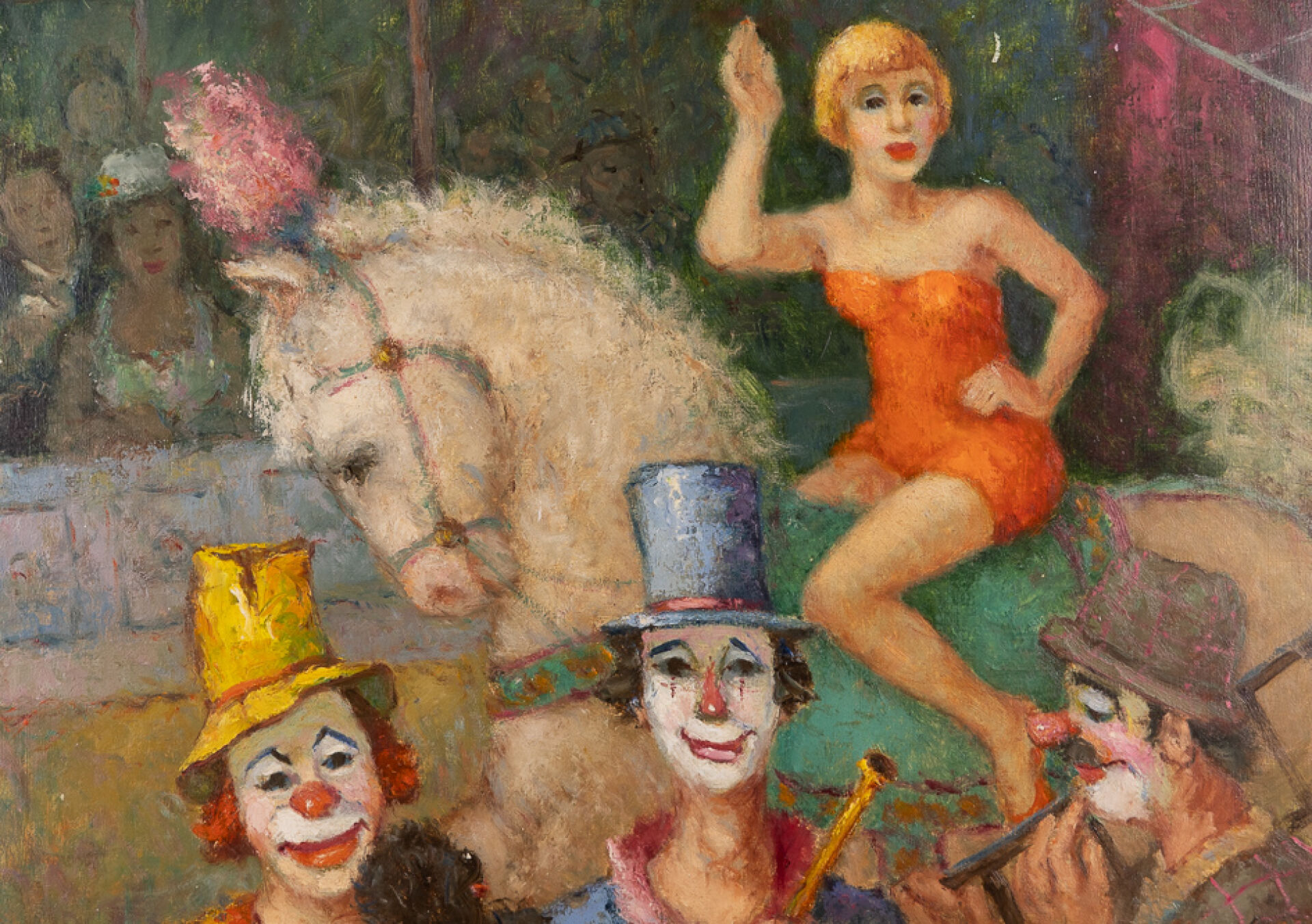 Hajnacka SZARKA (XXe siècle). Scène de cirque aux clowns et à la voltigeuse. Huile sur panneau, signée en bas à gauche. Haut. : 60 cm - Larg. : 51 cm
