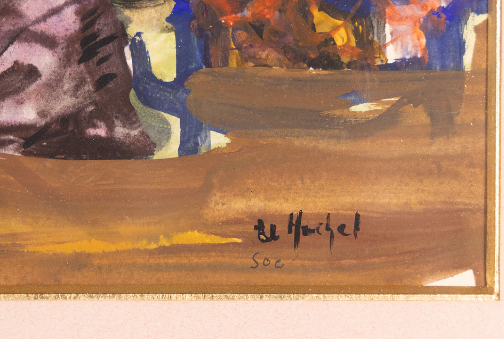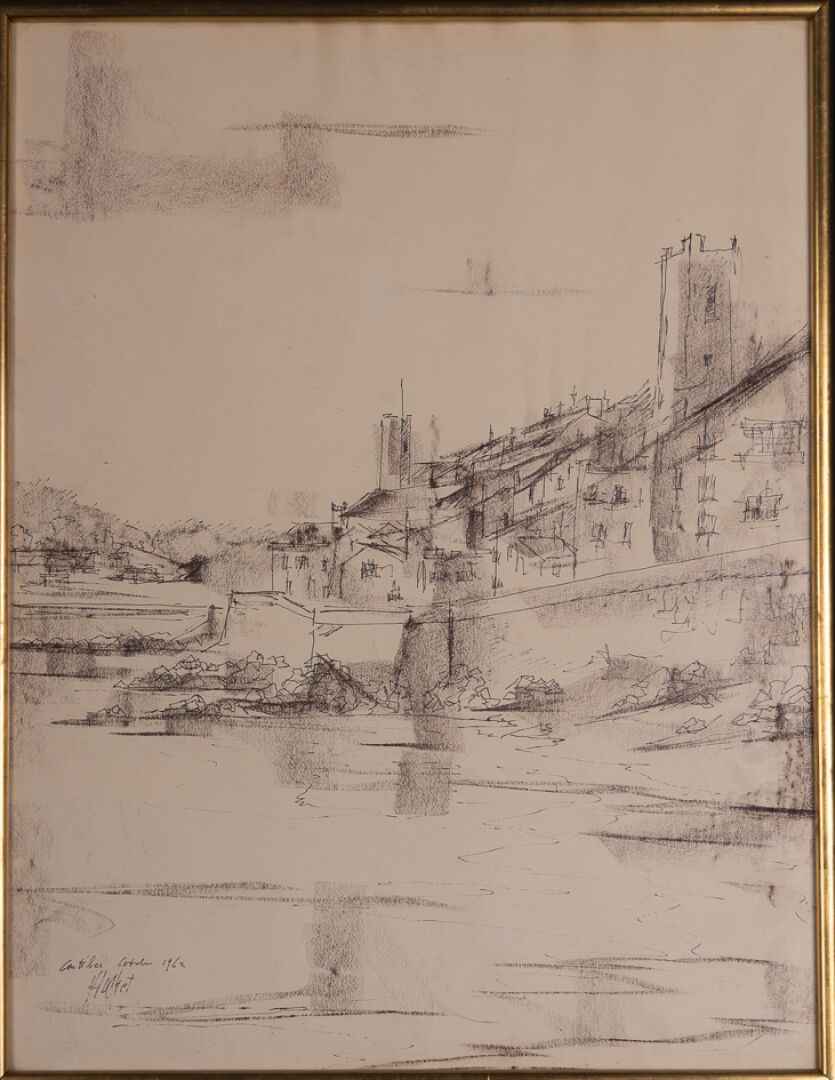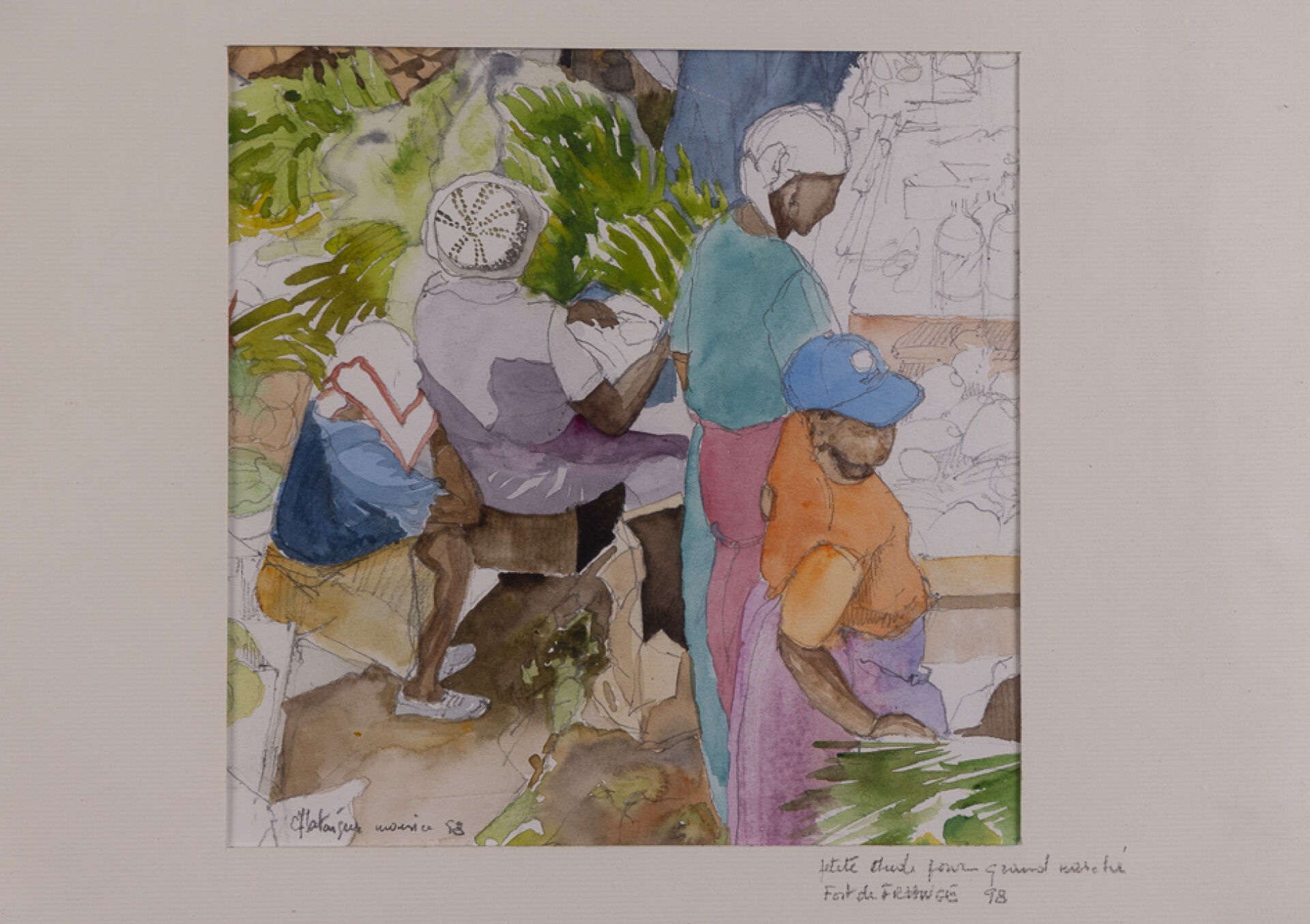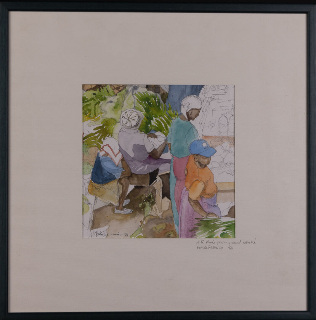 Urbain HUCHET (1930-2014). Scène de vie mexicaine. Aquarelle gouachée, contresignée en bas à droite et titrée aux deux tiers à droite "OAXACA (Mexique 28/06/64)". Haut. : 41.5 cm - Larg. : 28 cm Urbain HUCHET (1930-2014). Vue du port d'Antibes. Dessin au fusain et encre de chine, signé, situé et daté "1962" en bas à gauche. Haut. : 64 cm - Larg. : 48 cm Scène au grand marché de Fort de France, titrée "Petite étude pour Grand marché à Fort de France" et datée 98 en bas à droite, signée en bas à gauche "Maurice CHATAIGNER (né en 1941)?". Crayon aquarellé. Dim. à vue : Haut. : 20 cm - Larg. : 20 cm Attribué à Urbain HUCHET (1930-2015). Femme allongée sur la plage au maillot de bain bleu. Huile sur toile. Dim. à vue : Haut. : 19 cm - Larg. : 27 cm