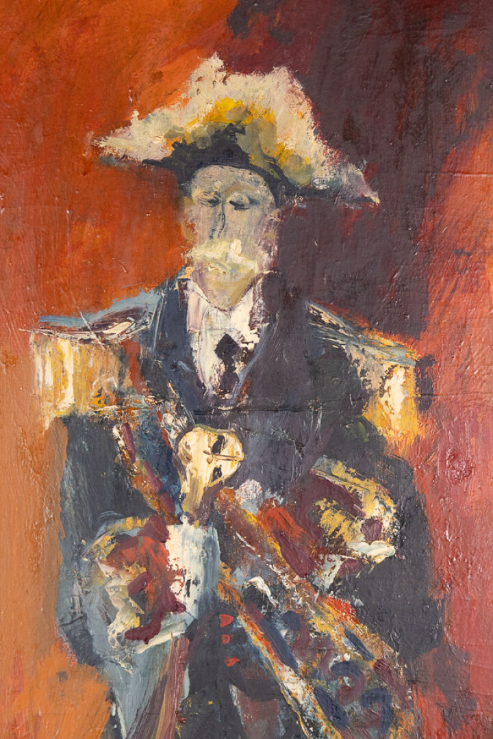 Urbain HUCHET (1930-2014). Tambour major. Huile sur toile, signée en bas à droite . Haut. : 100 cm - Larg. : 50 cm