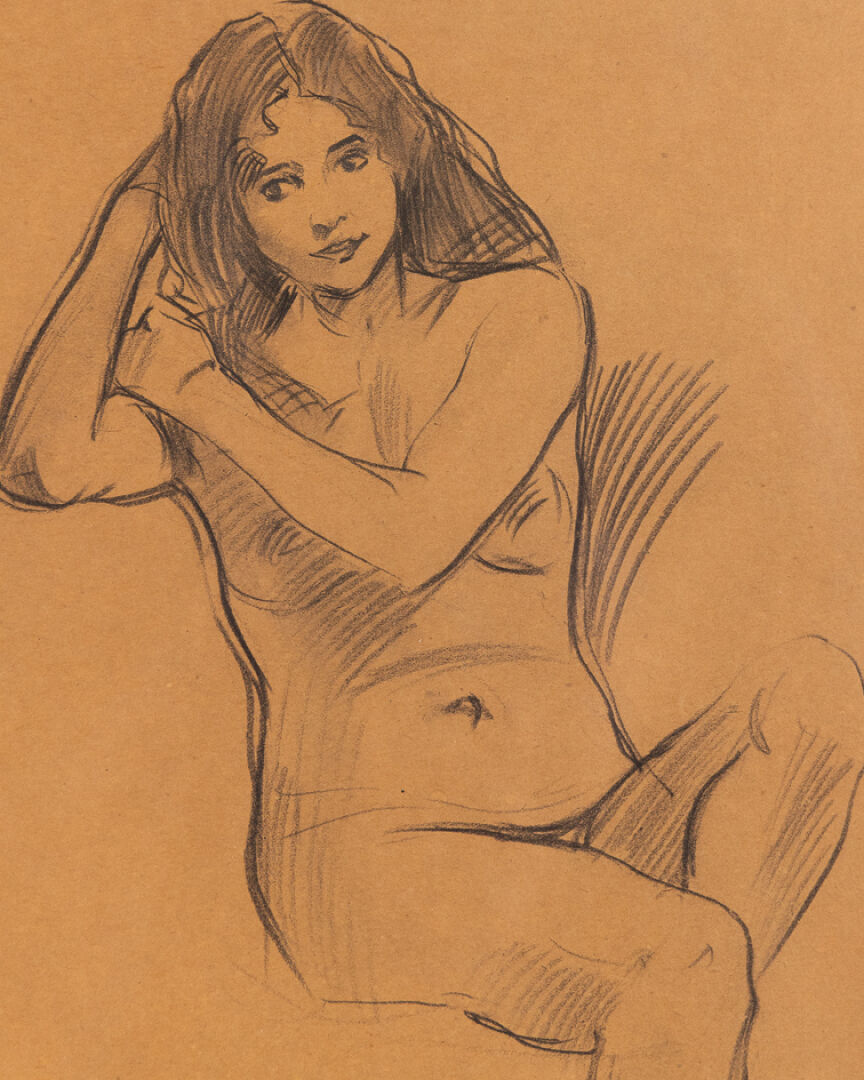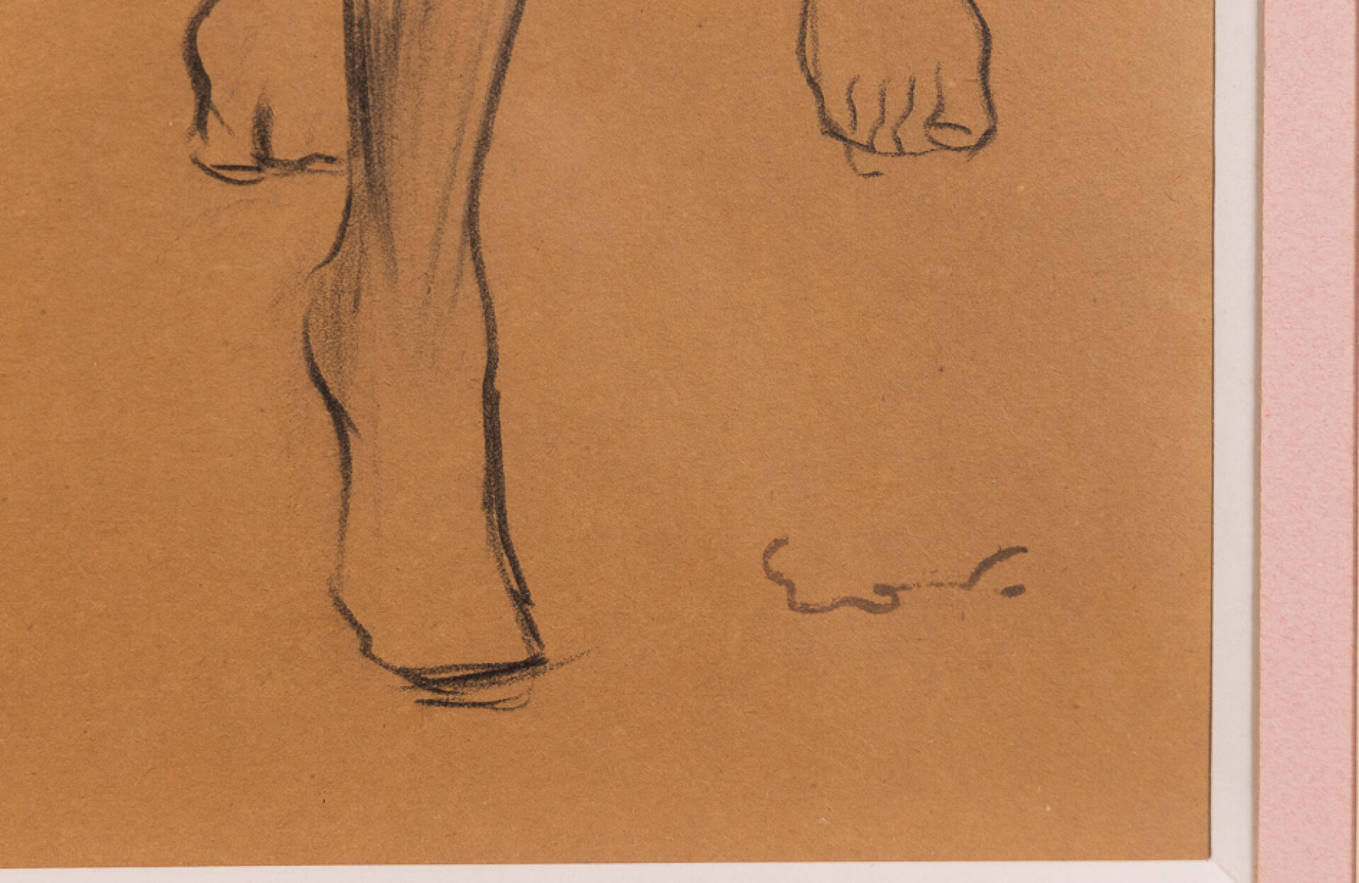 École du XXe siècle. Étude de femme nue assise, un pied étudié. Dessin, signé en partie basse '(insolation). Haut. : 41 cm - Larg. : 29 cm