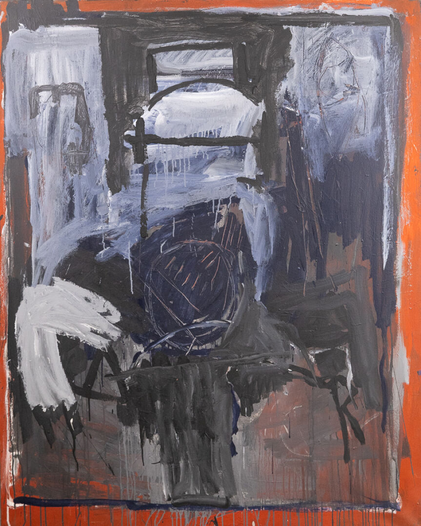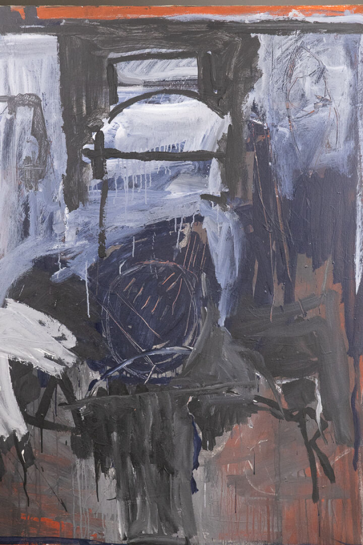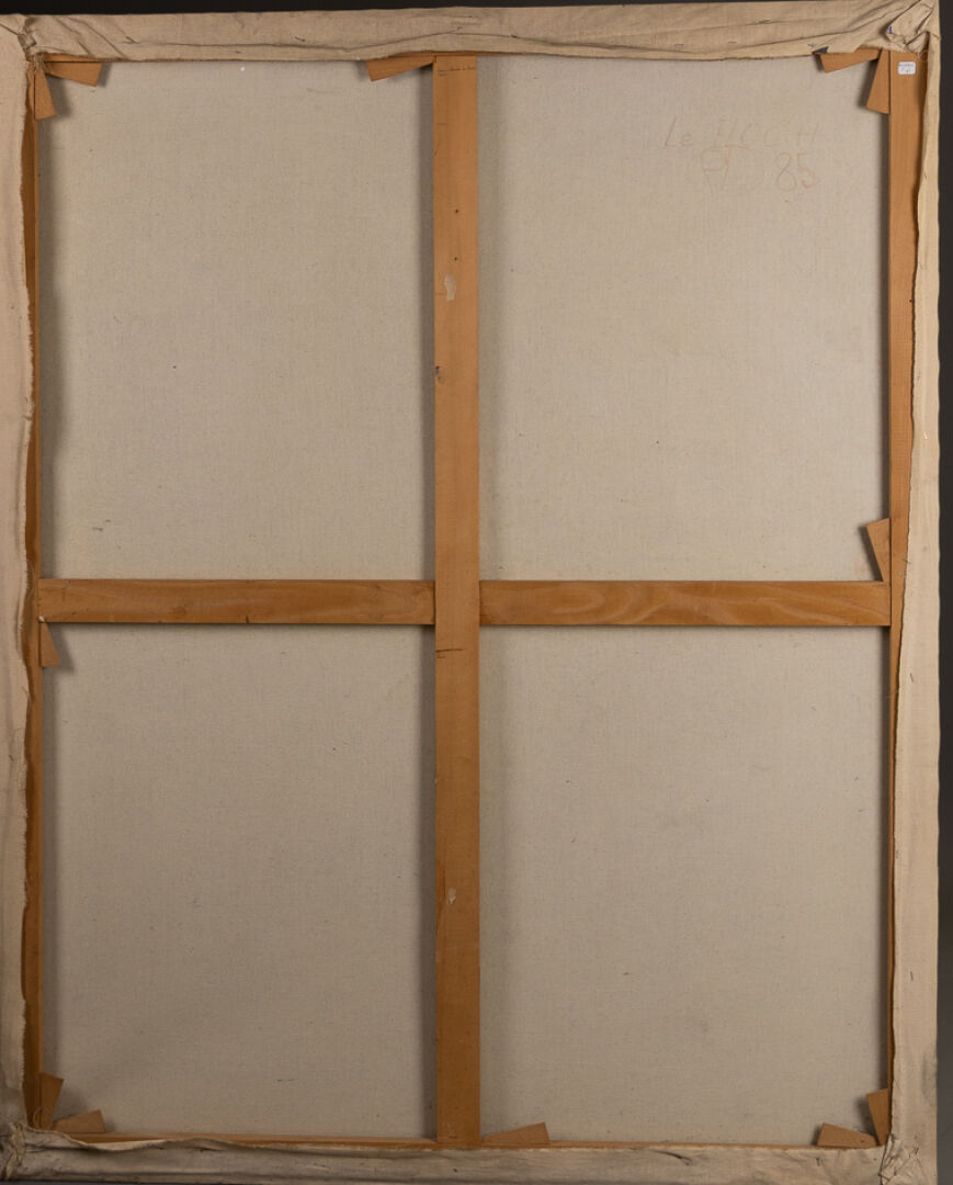 Jean-Claude LE FLOC'H (1945-2009). Composition abstraite dans les tons bleu, noir et rouge. Huile sur toile, signée et datée 1985 au dos. Haut. : 163 cm - Larg. : 130 cm