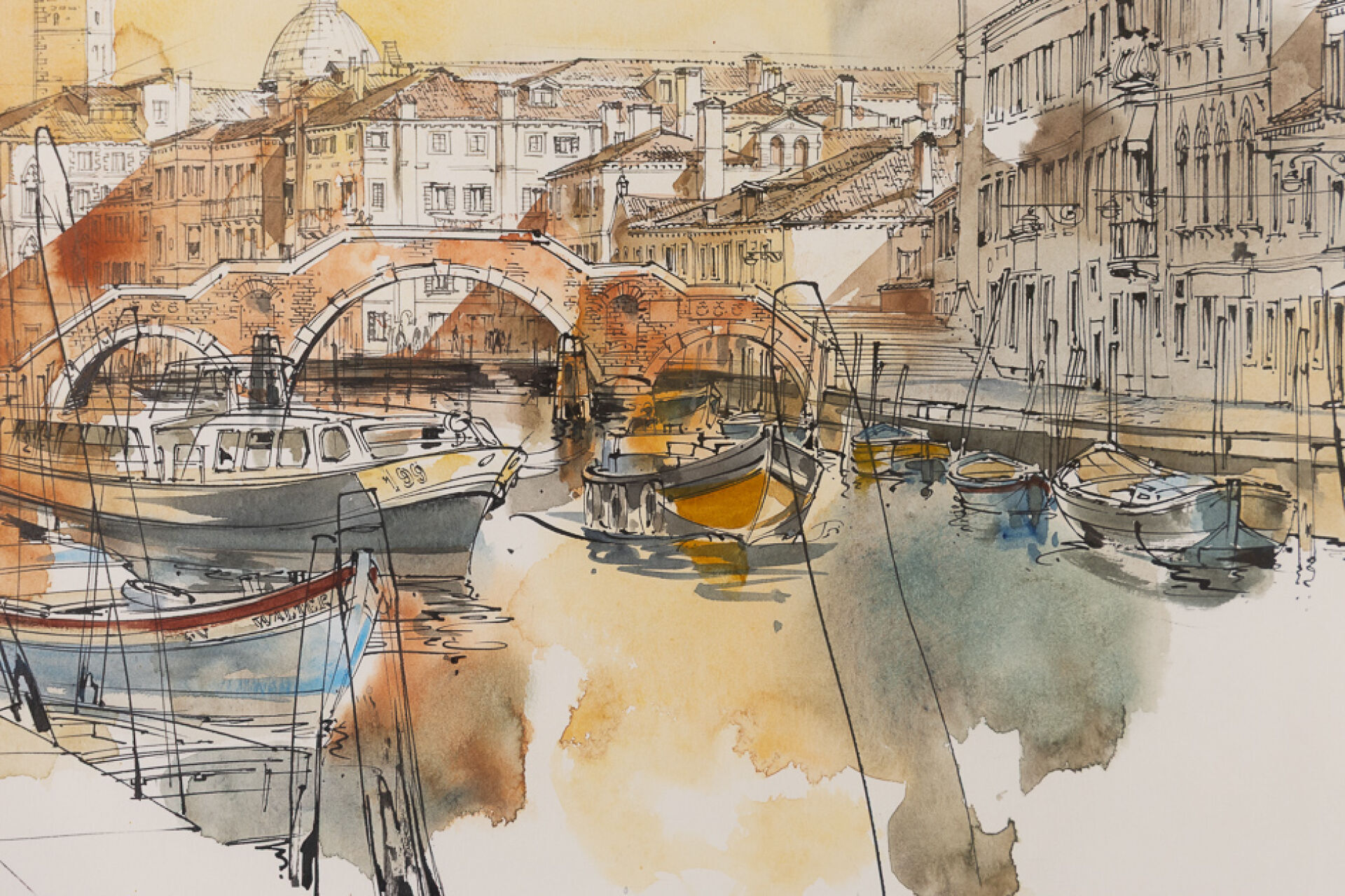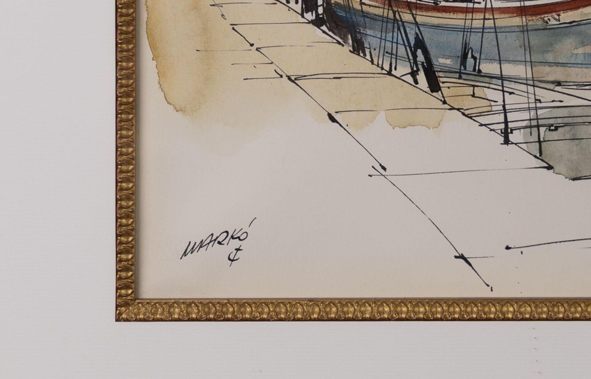 Serge MARKO (1926-2014). Vue des quais de Venise. Dessin à l'encre aquarellé, signé en bas à gauche. Dim. à vue : Long. : 48 cm - Haut. : 31 cm