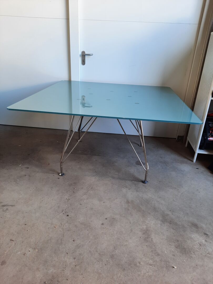 Table carrée, plateau verre brossé et piètement métal gris style SPOUTNIK. 140x140 cm