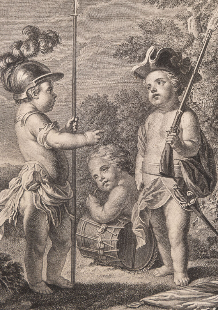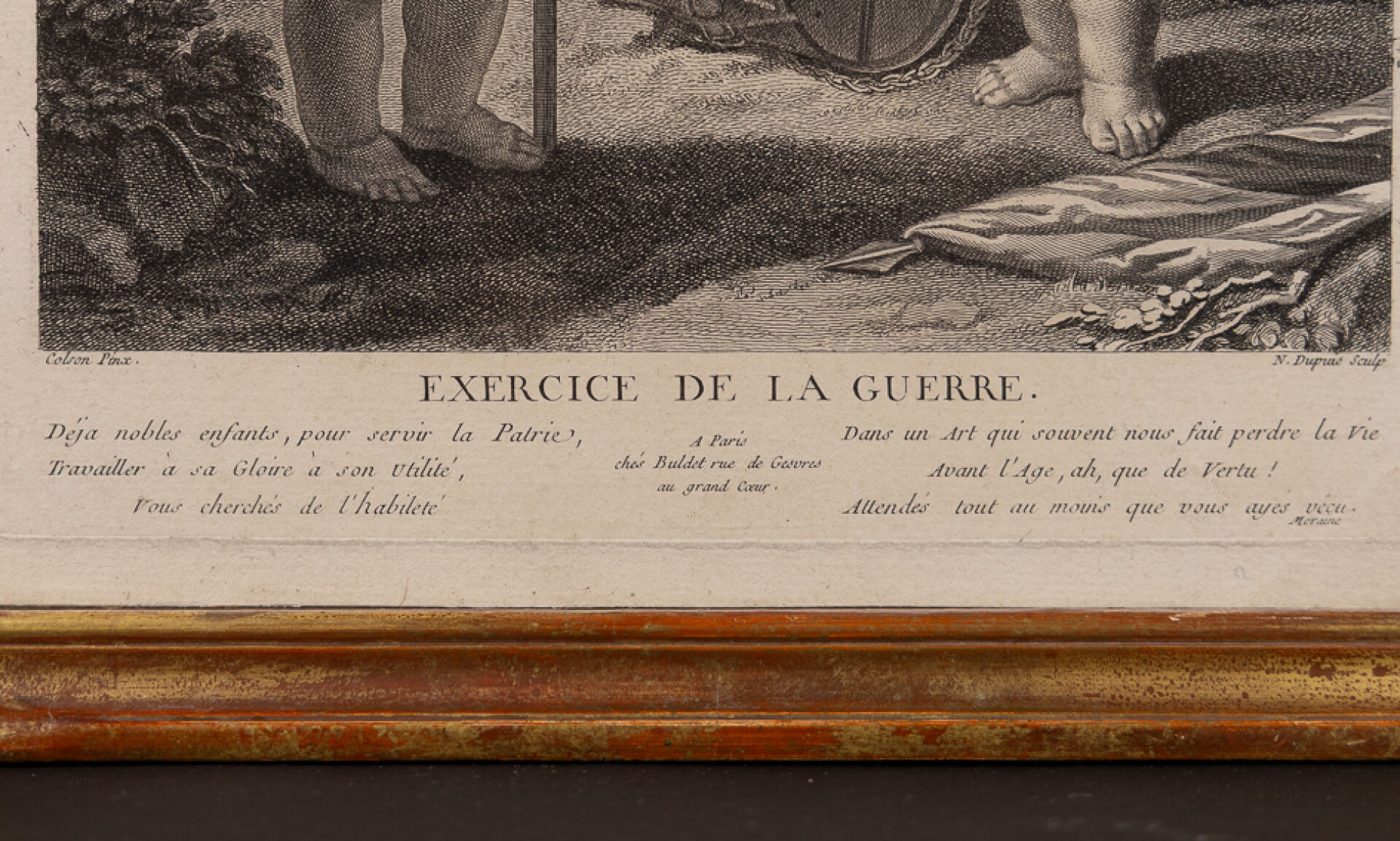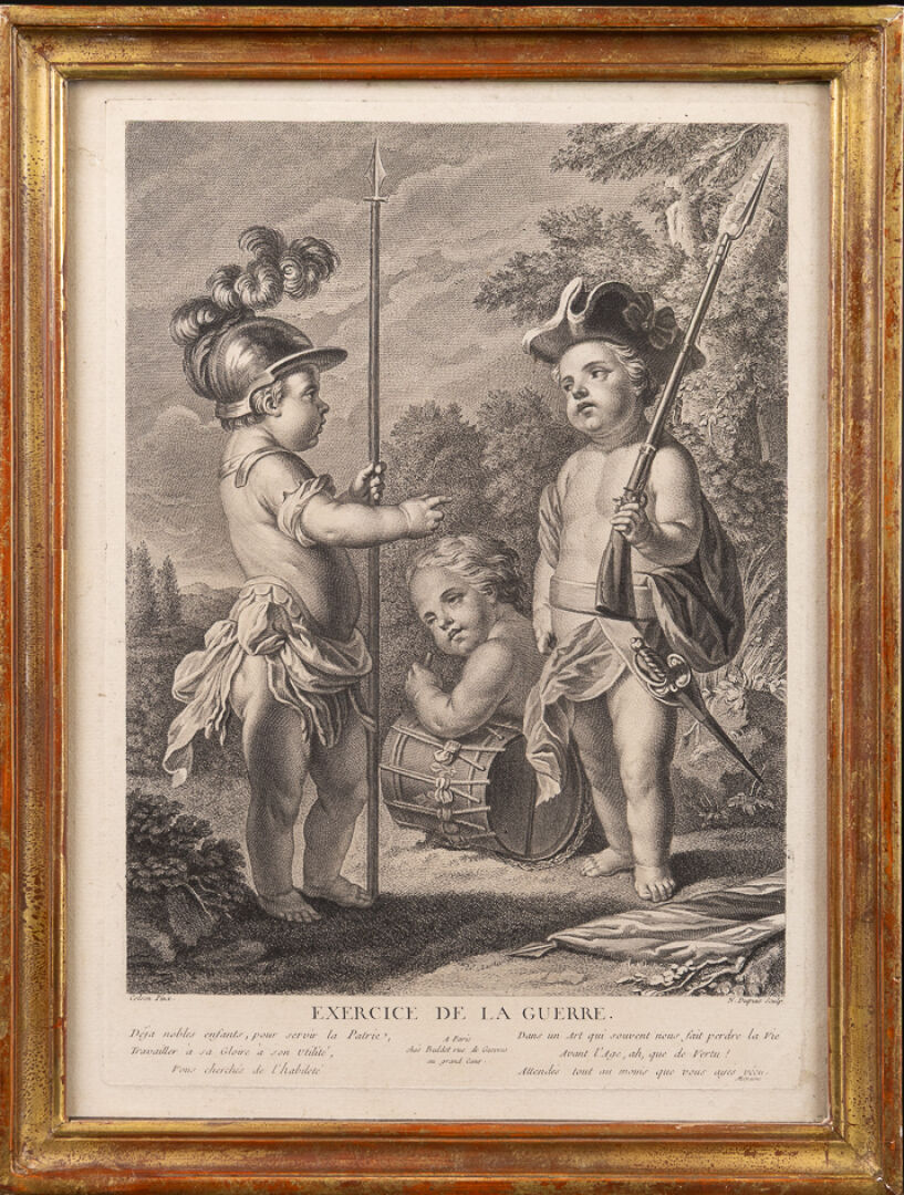 D'après Jean-François COLSON (1733-1803) gravée par Nicolas-Gabriel DUPUIS (1698-1711). "Exercices de la guerre" - Trois enfants grimés en soldat, l'un à la mode de l'antique, l'autre à la mode du XVIIIe siècle. Eau-forte en noir, annotée en partie basse d'un poème de Moraine. Dim. du sujet : Haut. : 28 cm - Larg. : 21 cm