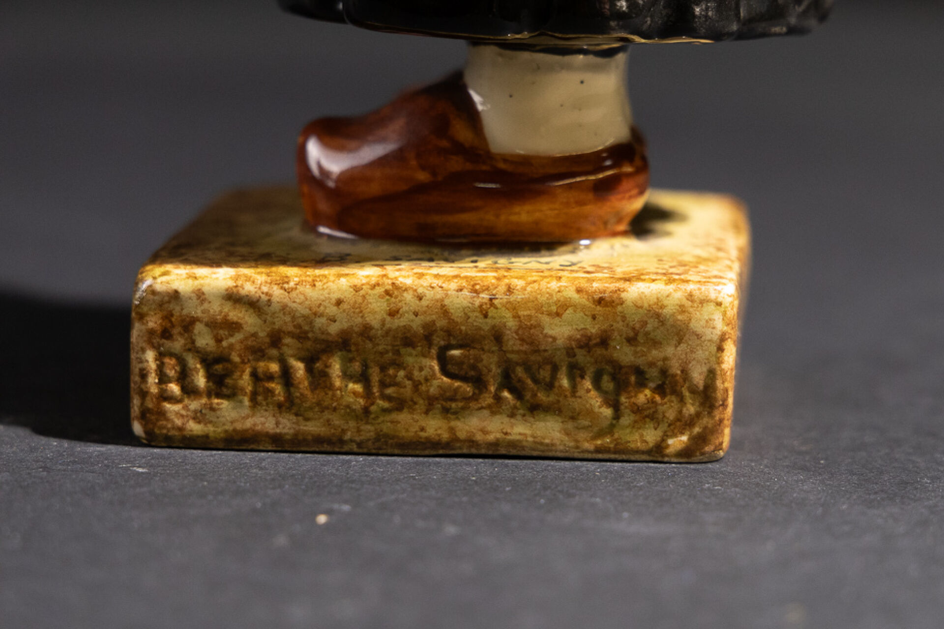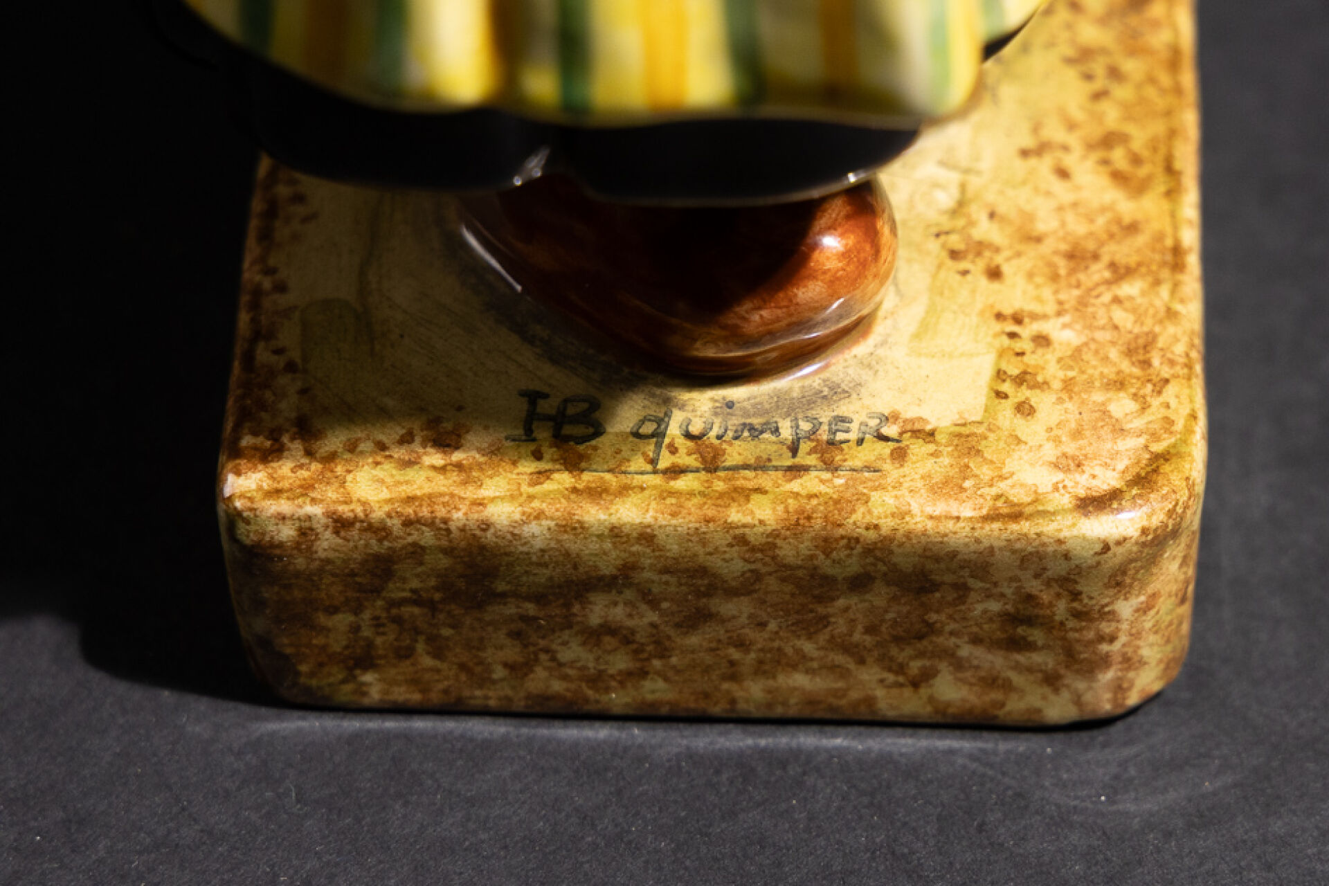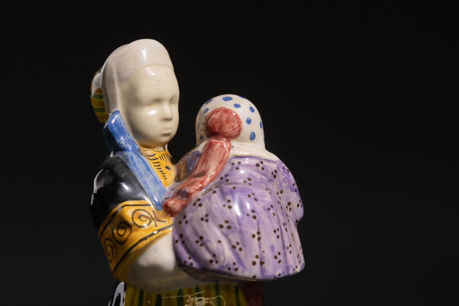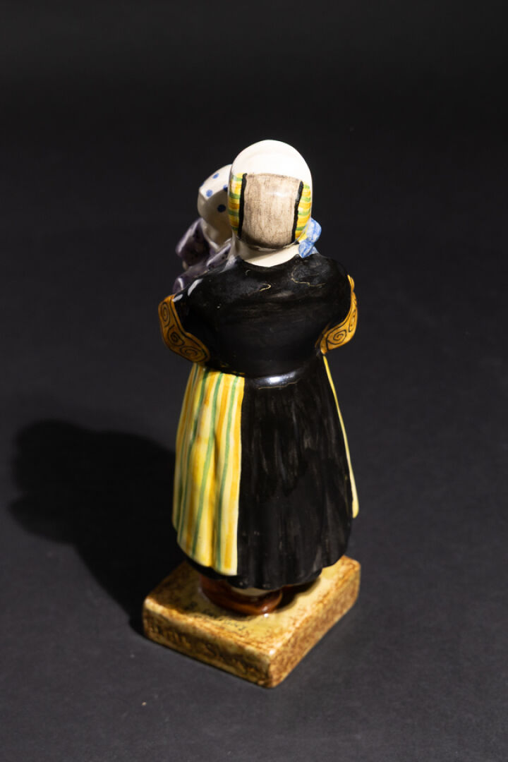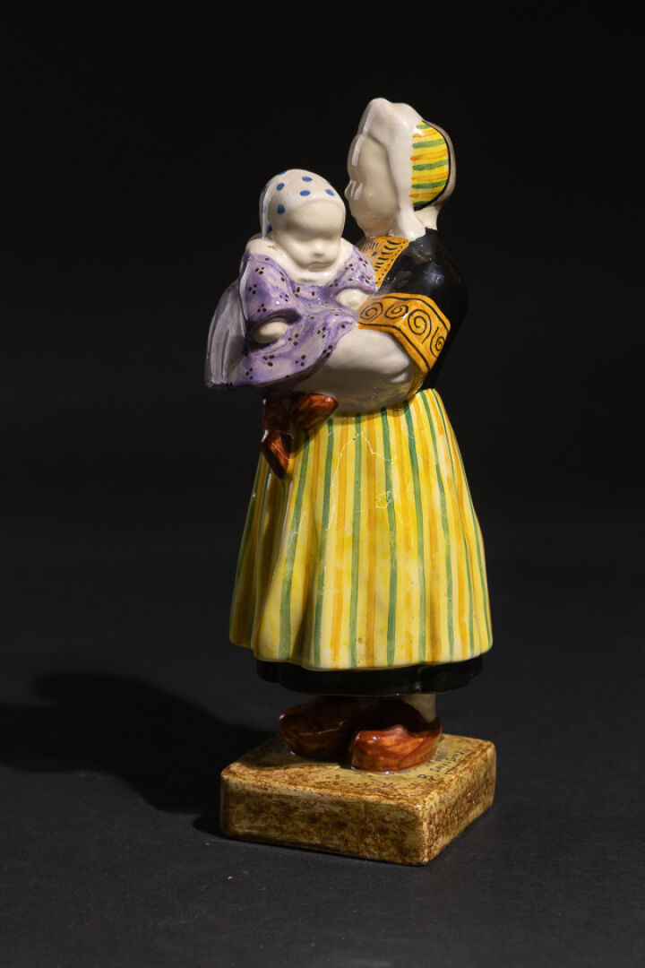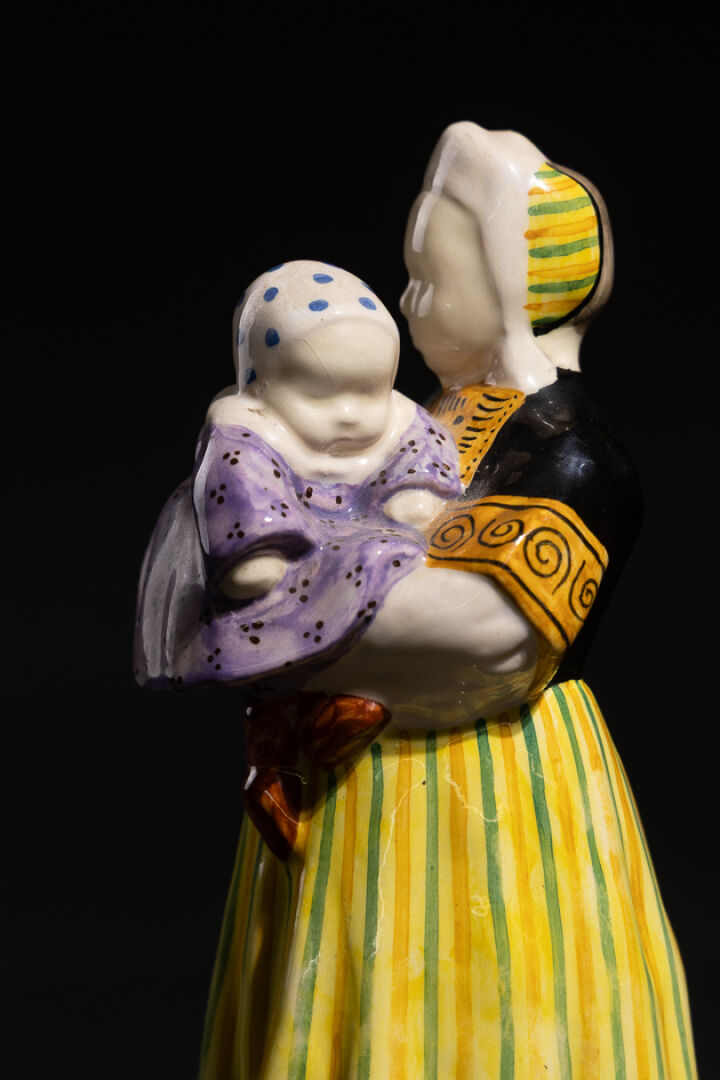 Berthe SAVIGNY (1882-1958) pour la Manufacture HB à Quimper. Bigoudène à l'enfant. Statuette en faïence émaillée polychrome dans les tons jaune, vert, noir et violet. Signée sur la base et en creux sur les côtés de la base. Vers 1940. Haut. : 28 cm
