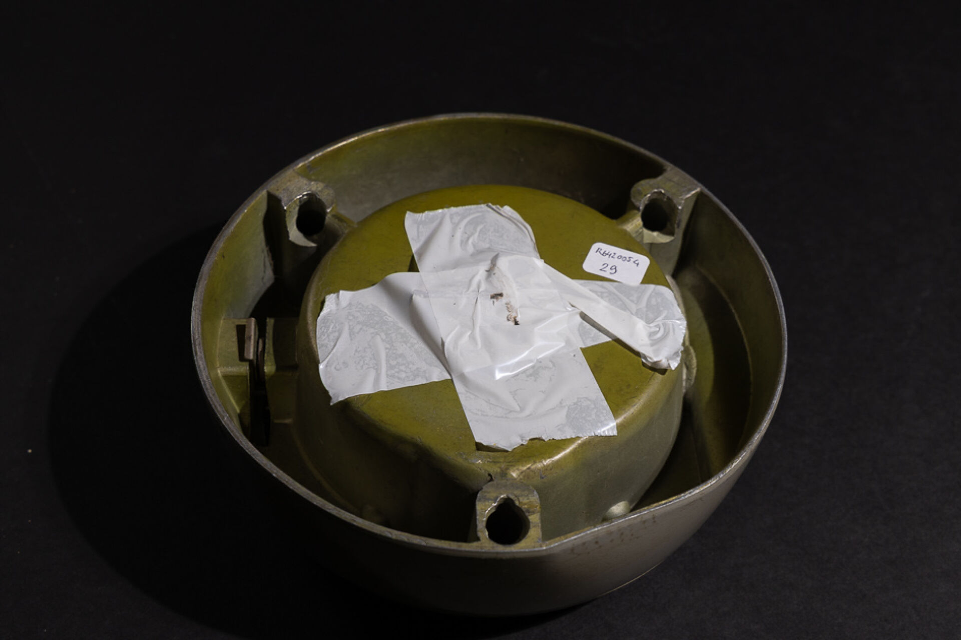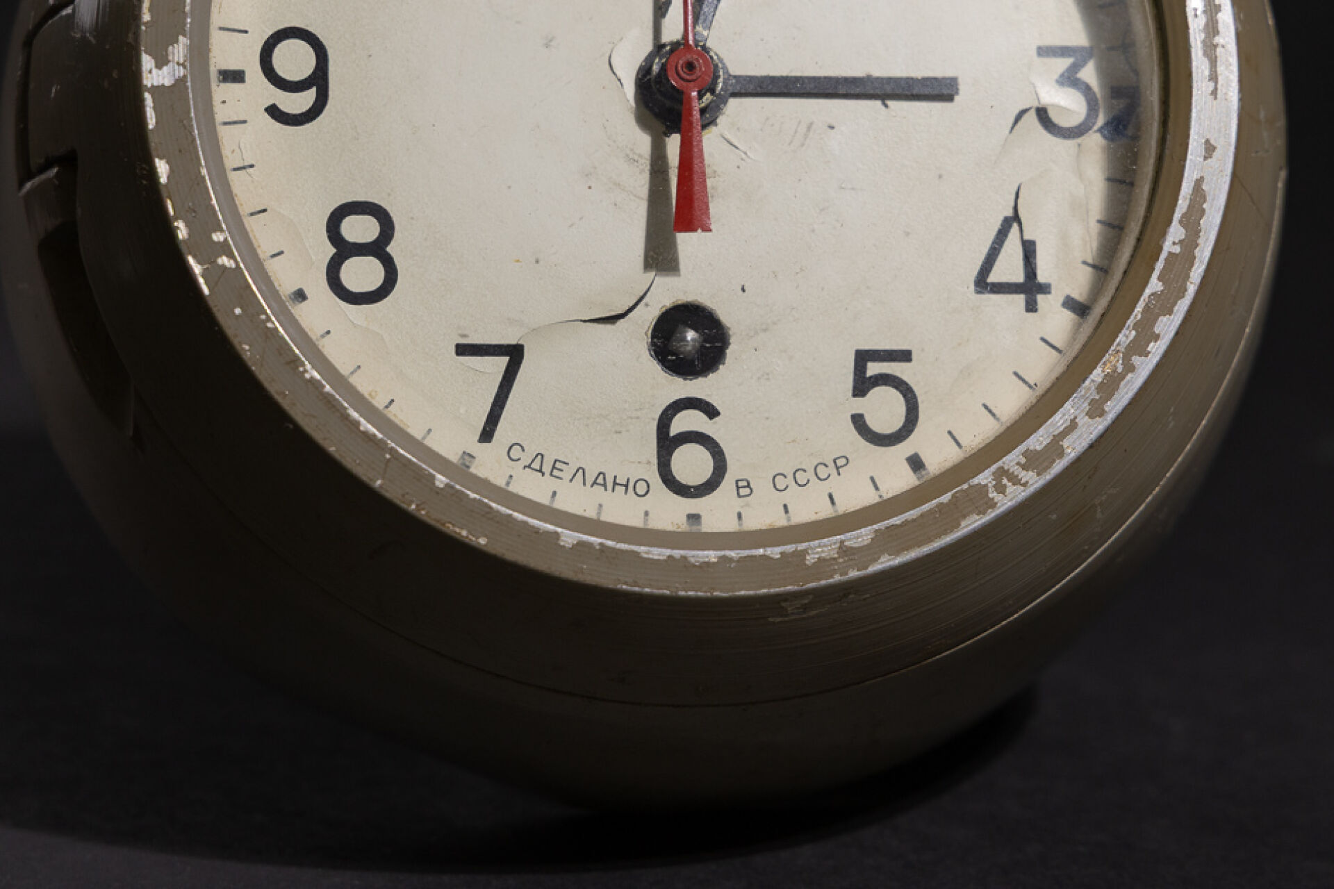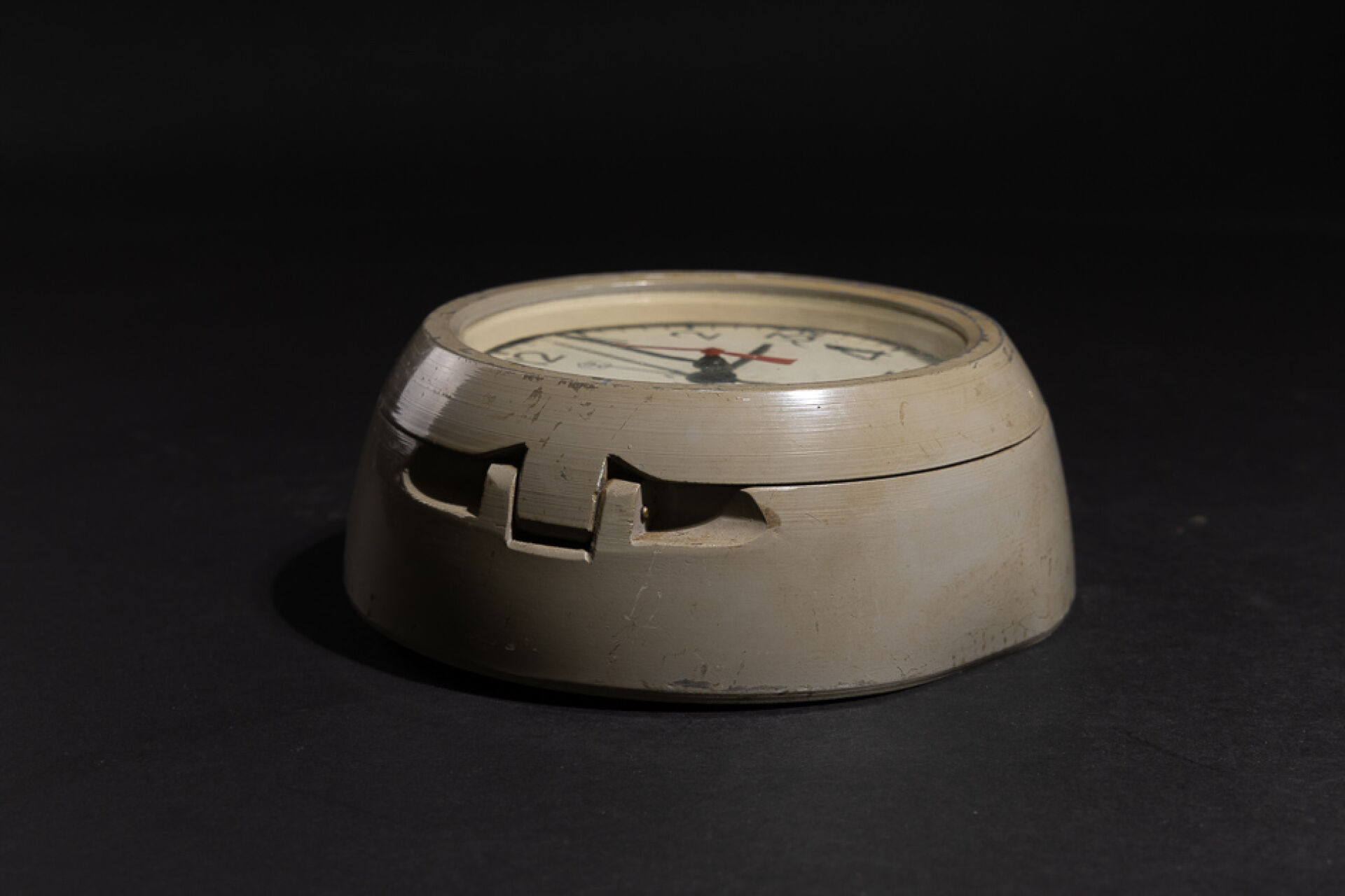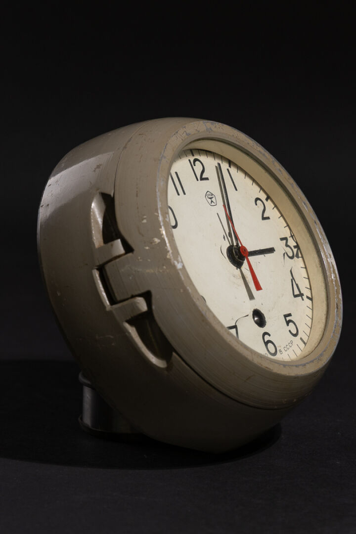 Horloge de marine d'applique circulaire en métal laqué gris, le cadran émaillé blanc indique les heures à chiffres romains, marquée CCCP et annotée d'écritures en cyrillique (chocs, soulèvement au cadran). Travail soviétique, seconde moitié du XXe siècle. Diam. : 20 cm