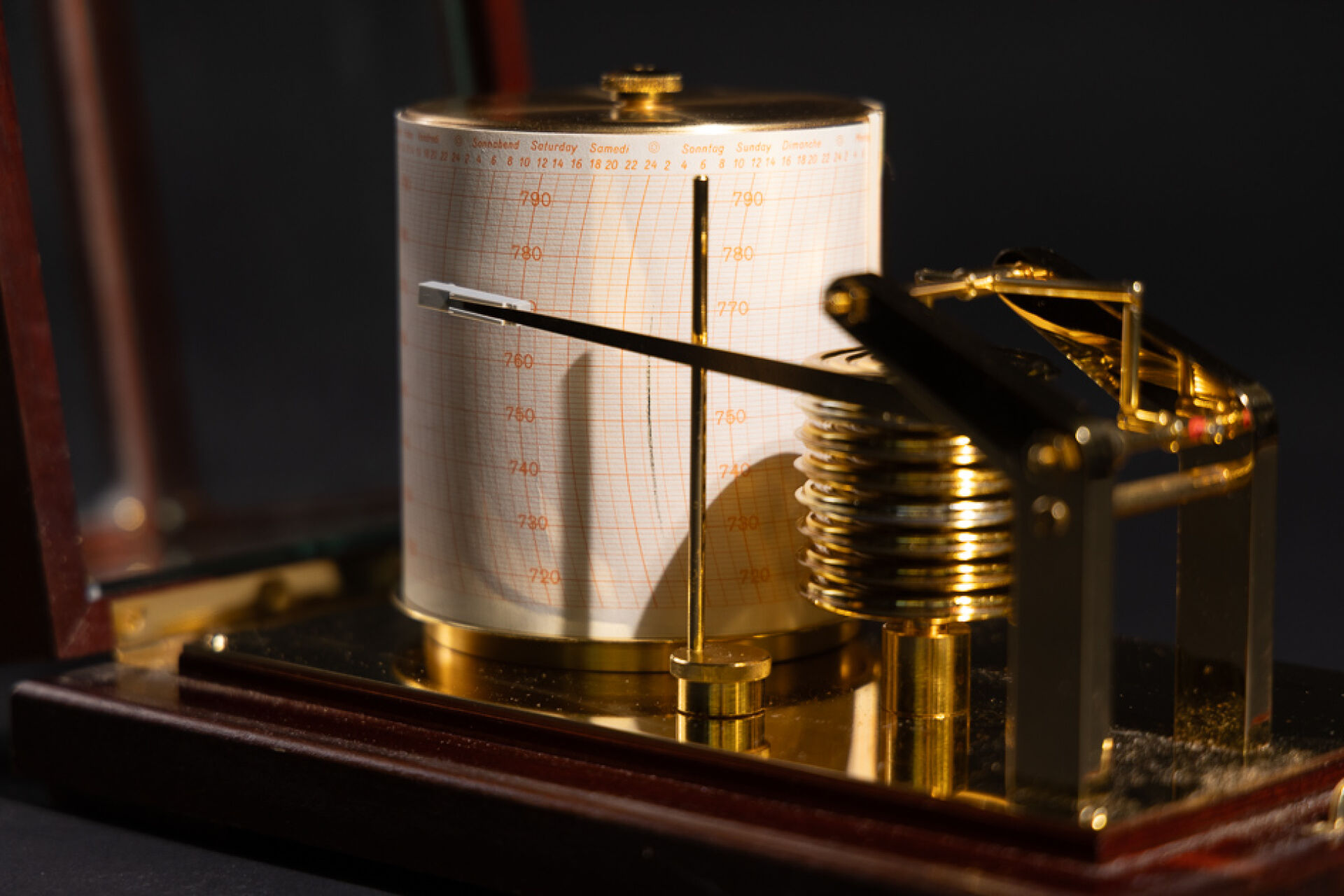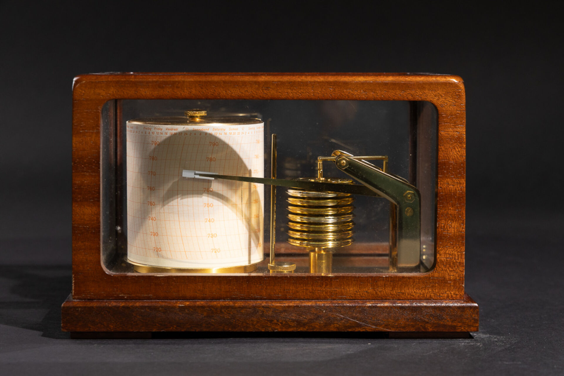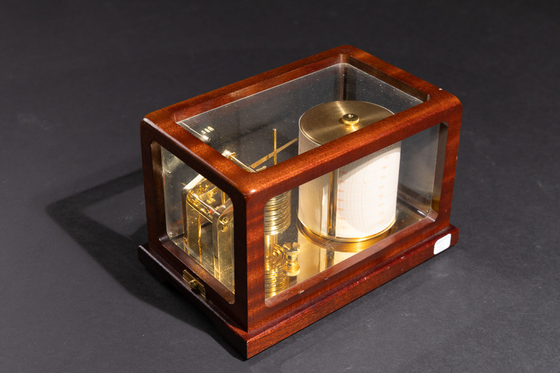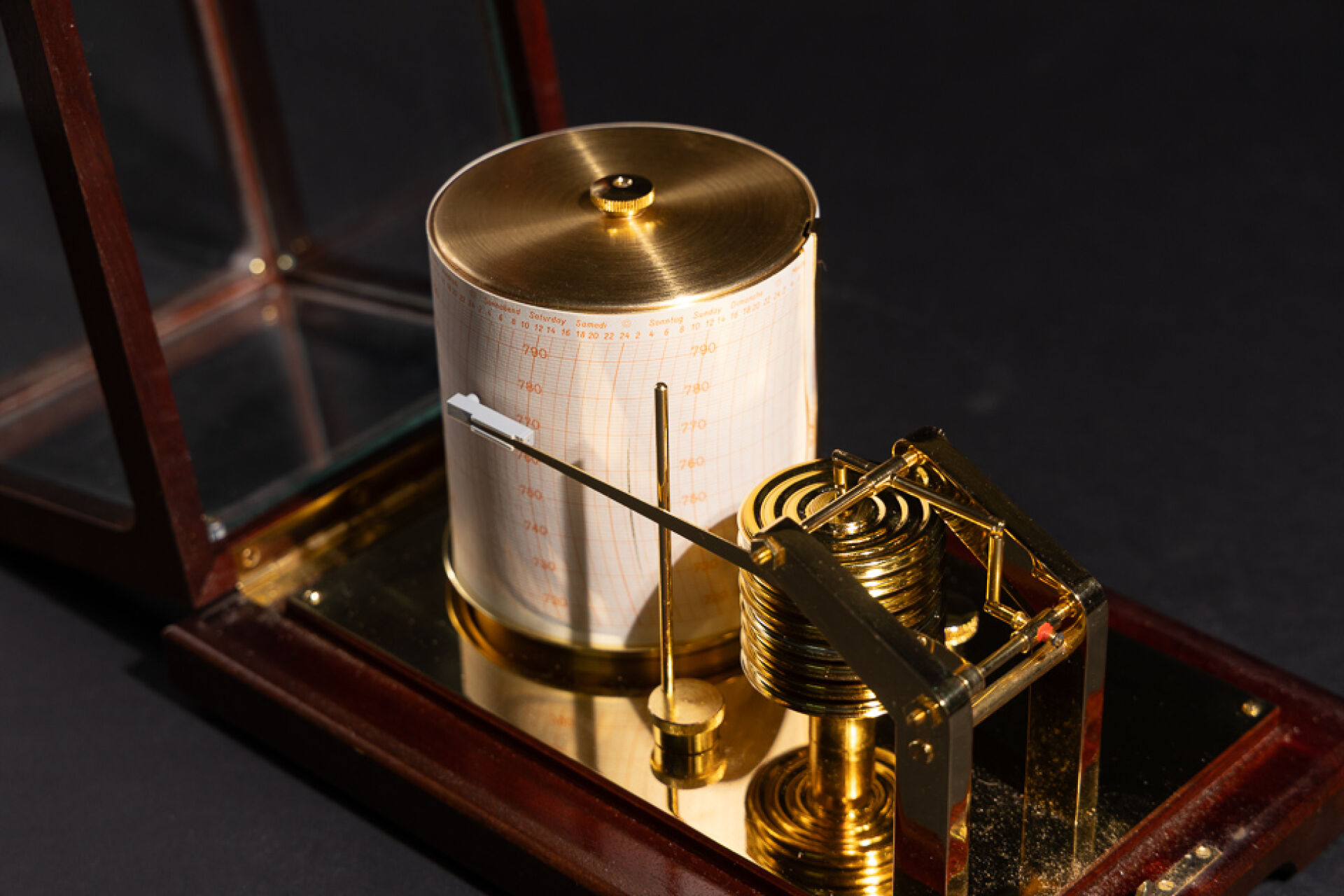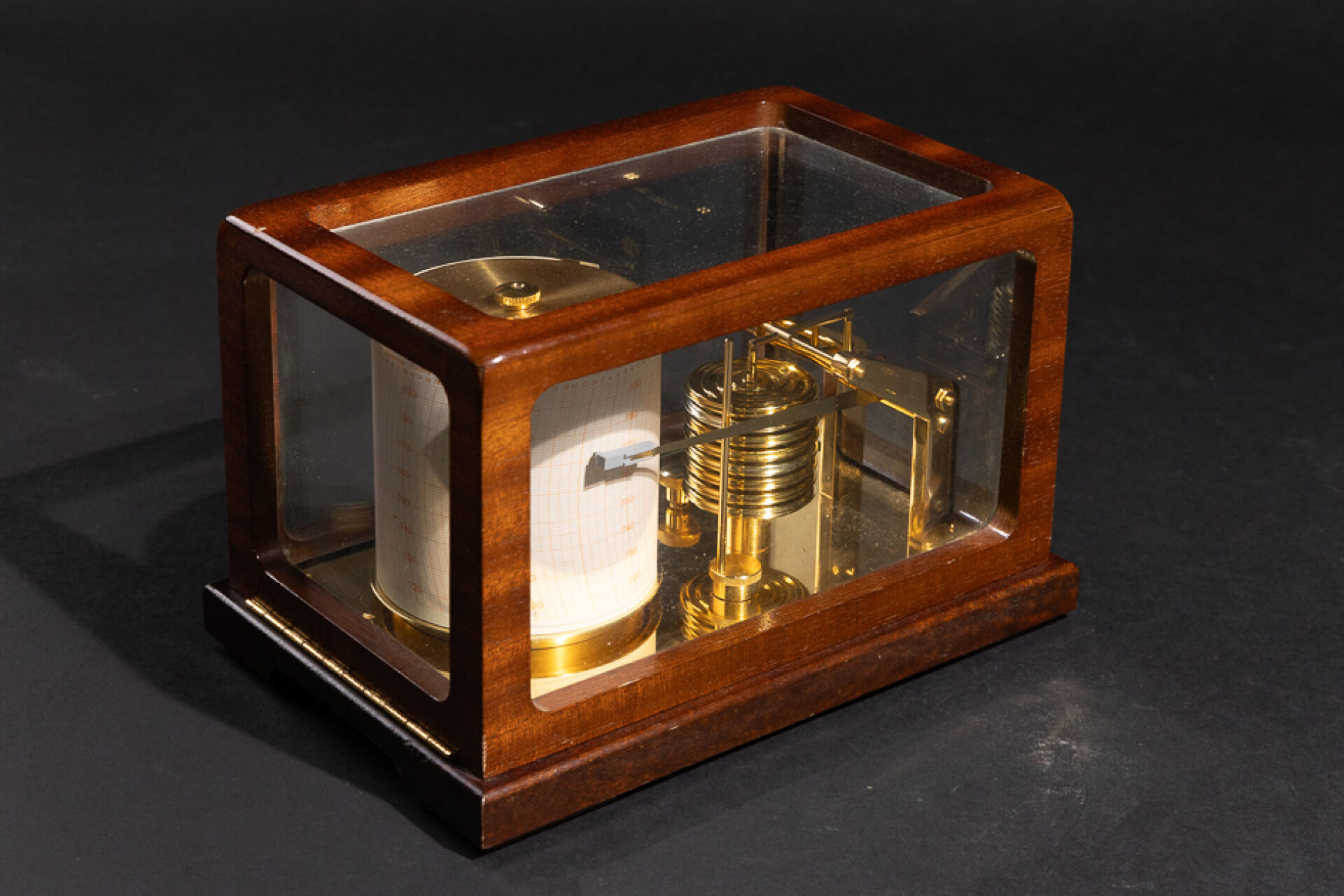 Maison BARIGO. Baromètre enregistreur dit barographe, en laiton, à huit capsules de vidi, à tambour enregistreur au jour en allemand, anglais et français, gradué de 720 à 790. Présenté dans une vitrine à couvercle basculant, signé (petits chocs). Haut. : 16.5 cm - Larg. : 26 cm - PRof. : 17 cm