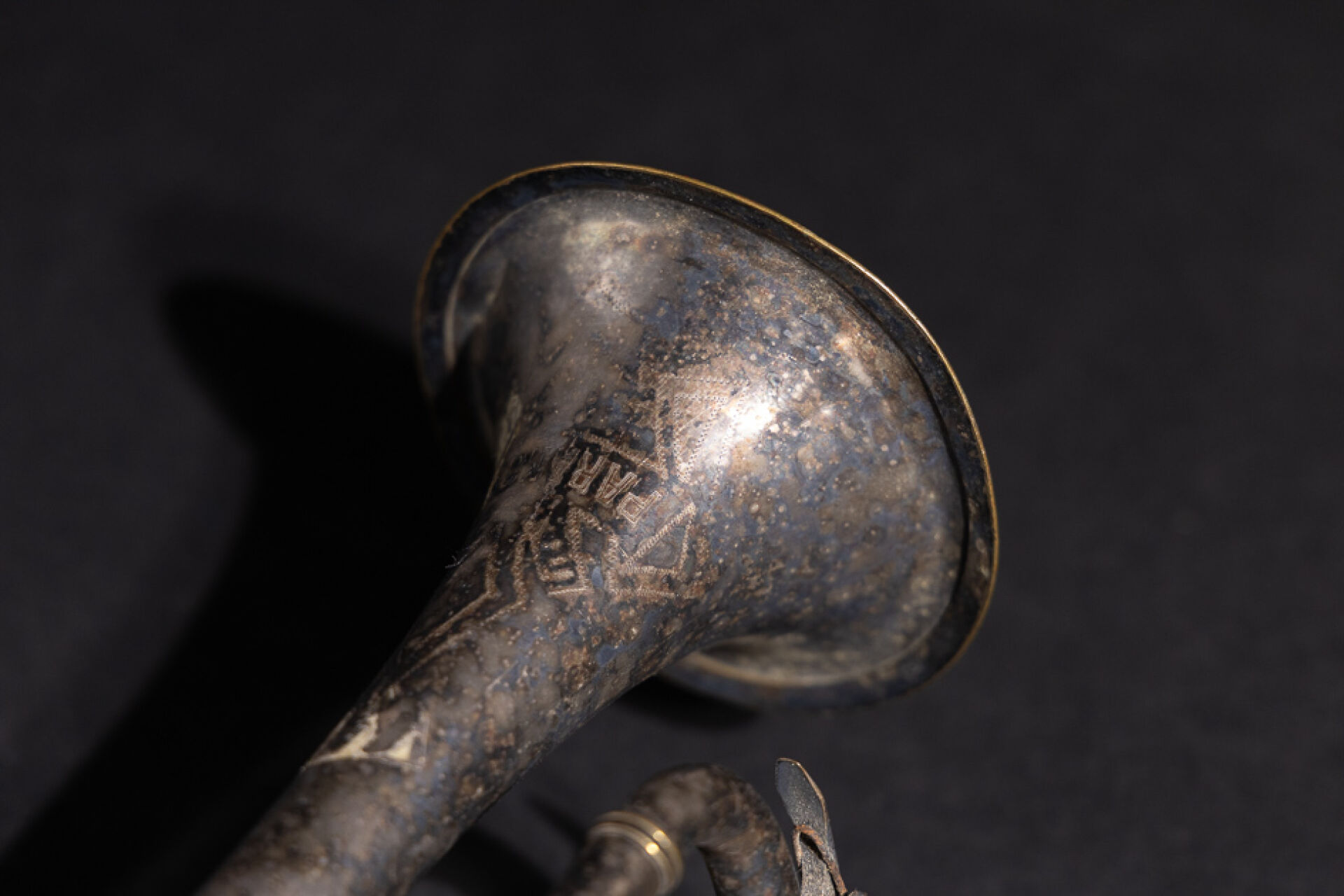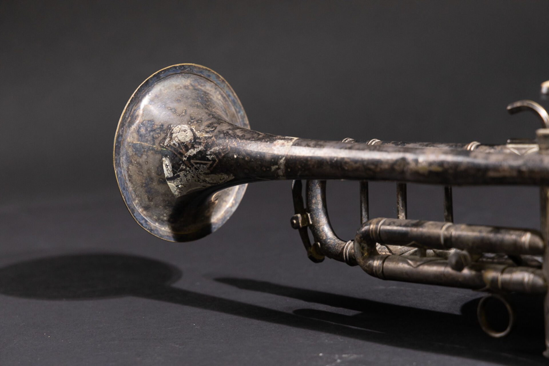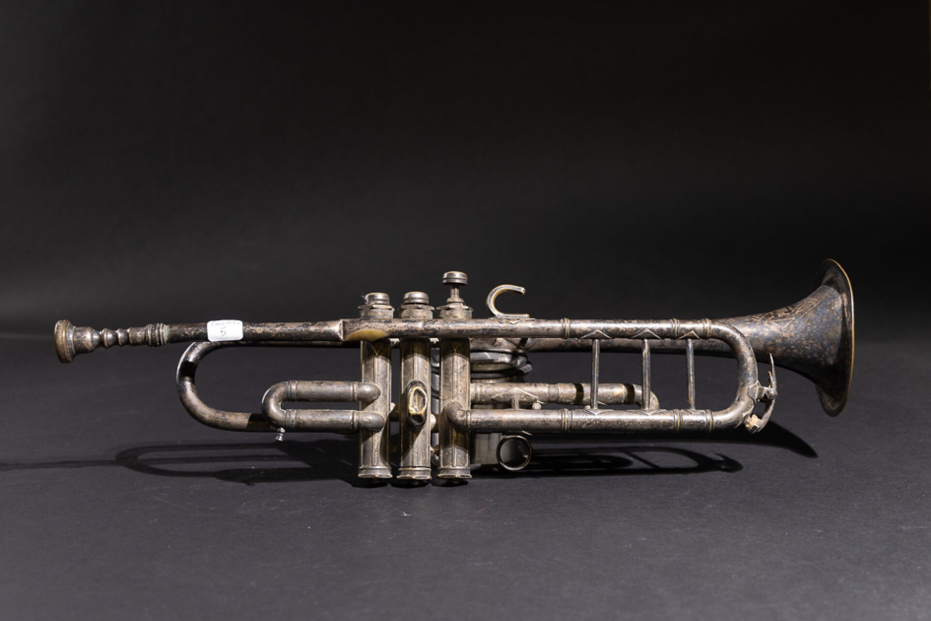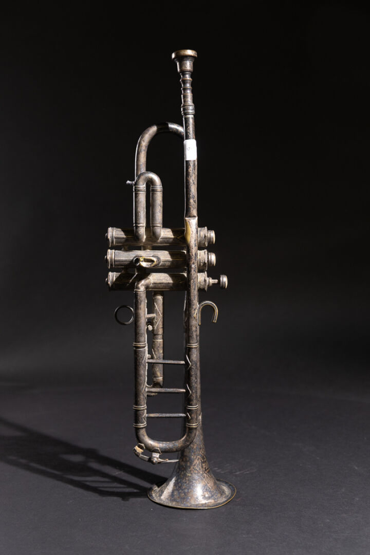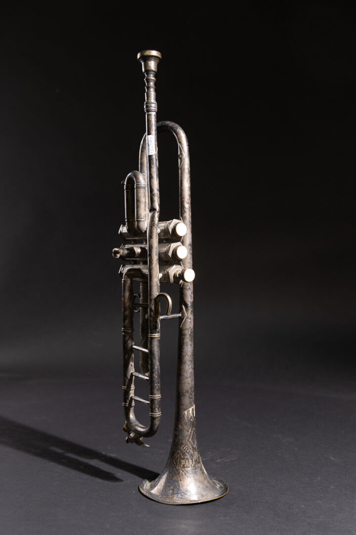 Maison PARAMOUNT. Trompette en métal argenté et nacre (chocs). XXe siècle. Long. : 51 cm