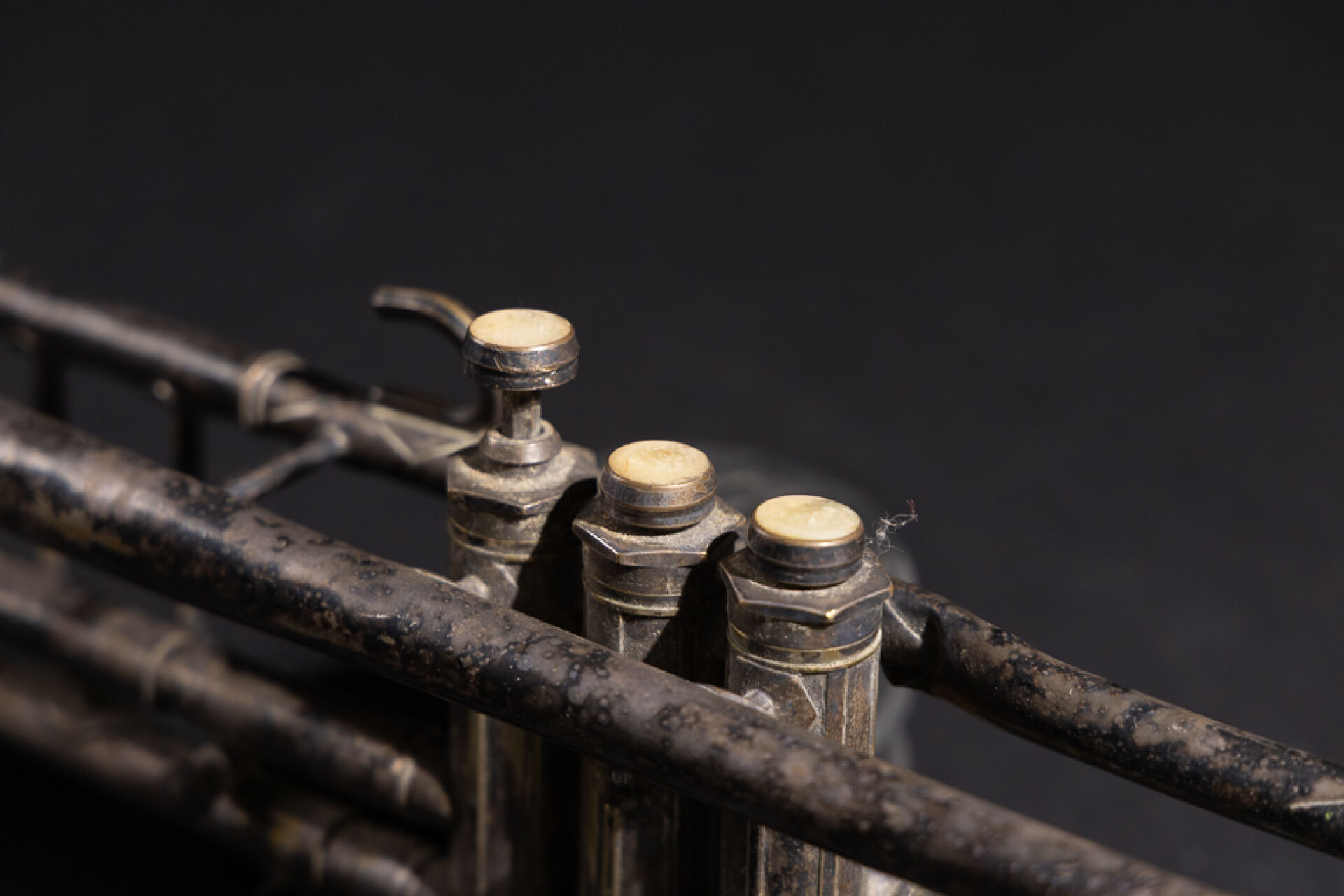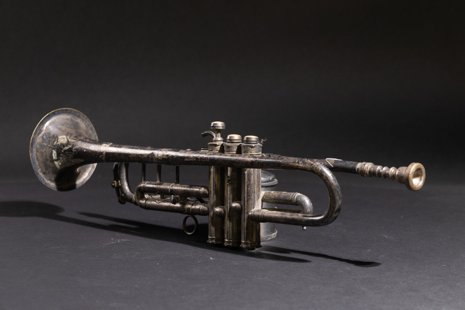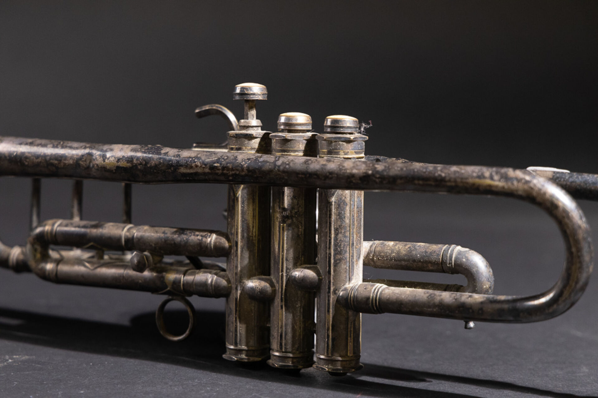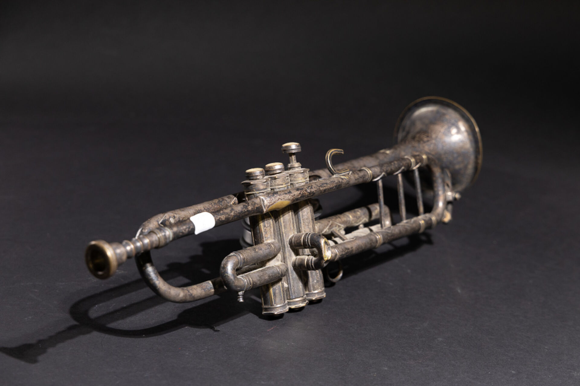 Maison PARAMOUNT. Trompette en métal argenté et nacre (chocs). XXe siècle. Long. : 51 cm