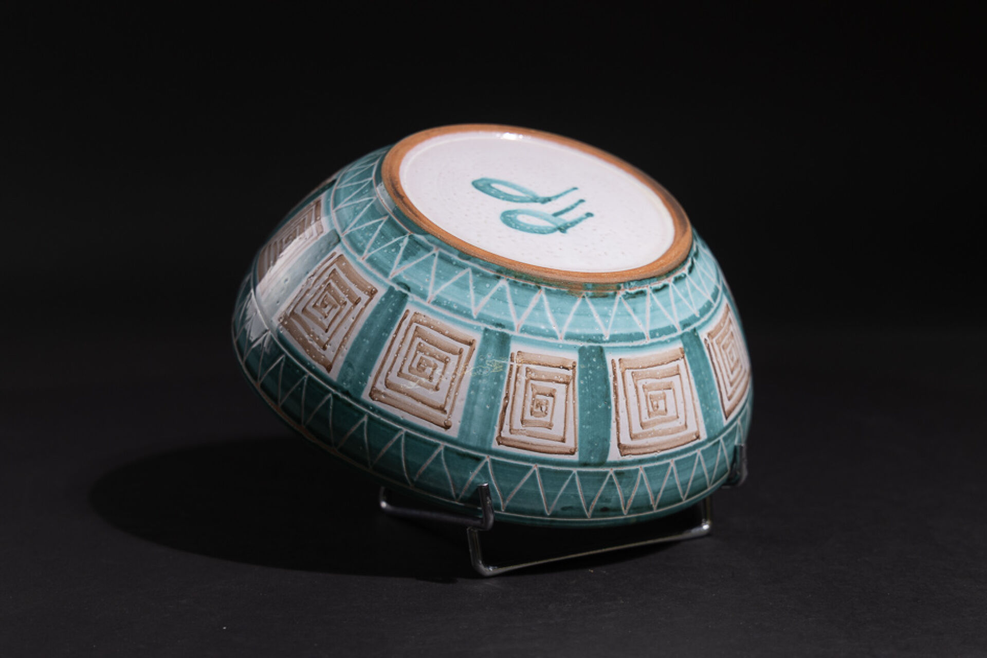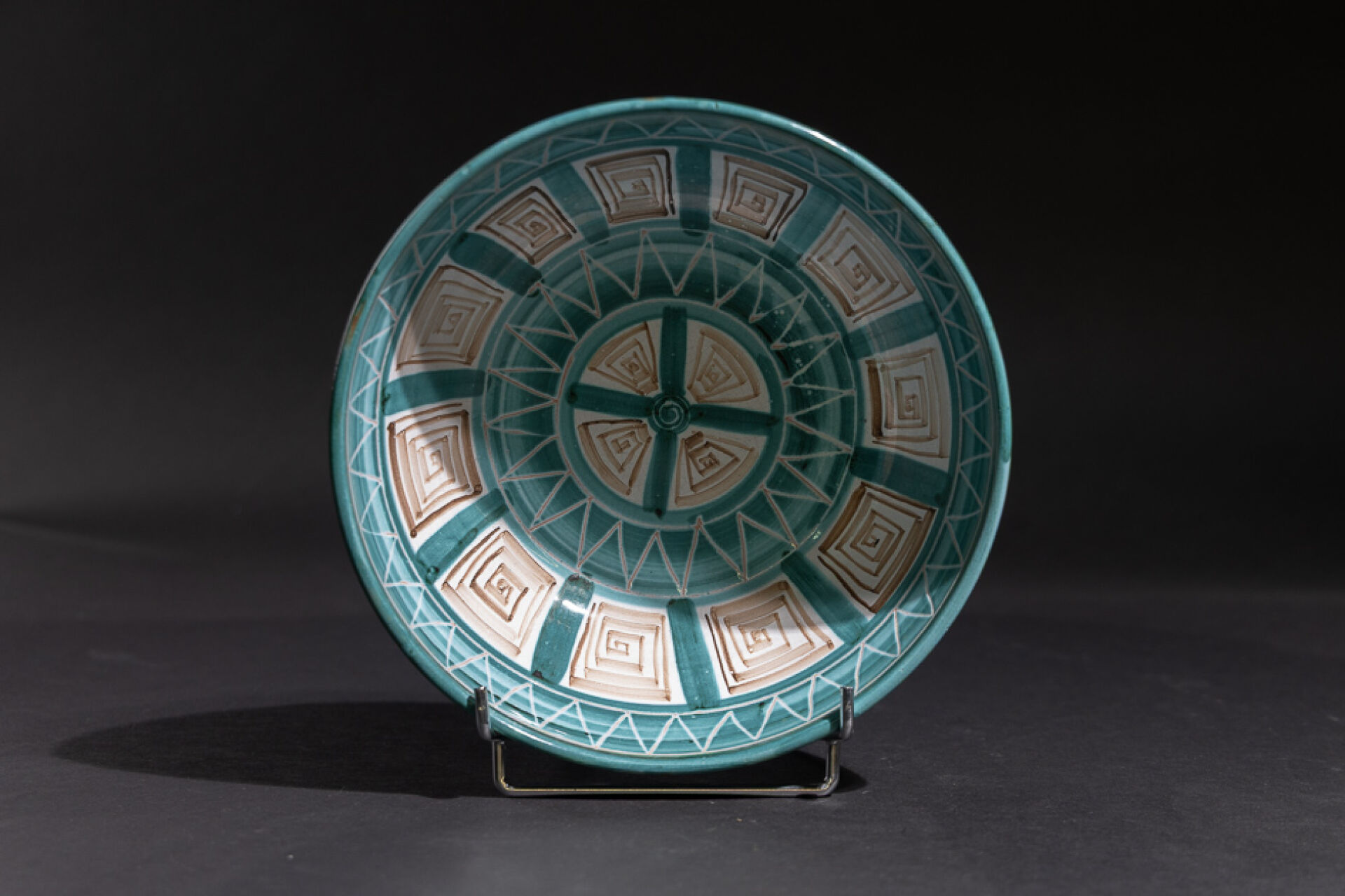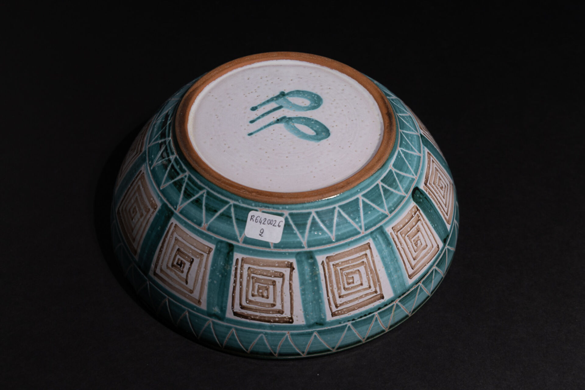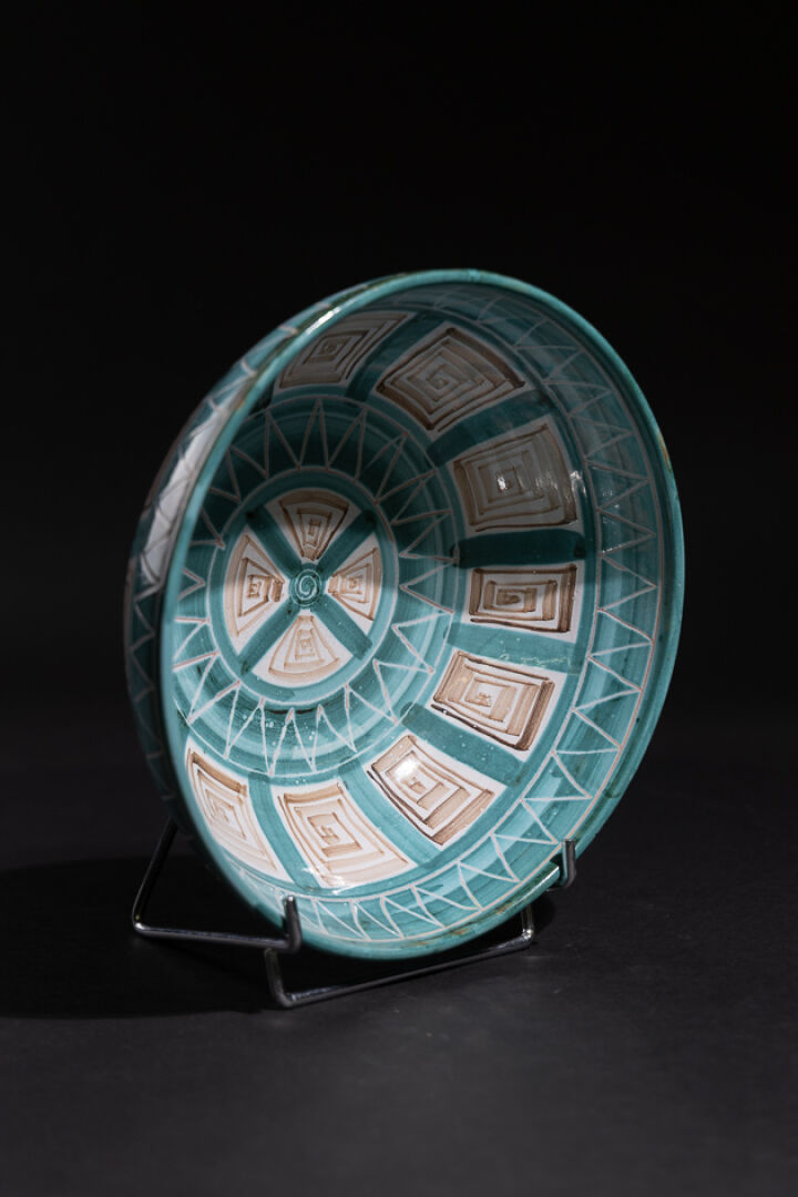 Robert PICAULT (1919-2000). Saladier en faïence à décor géométrique dans les tons vert et marron, monogrammé au revers. Haut. : 9 cm - Diam. : 25 cm