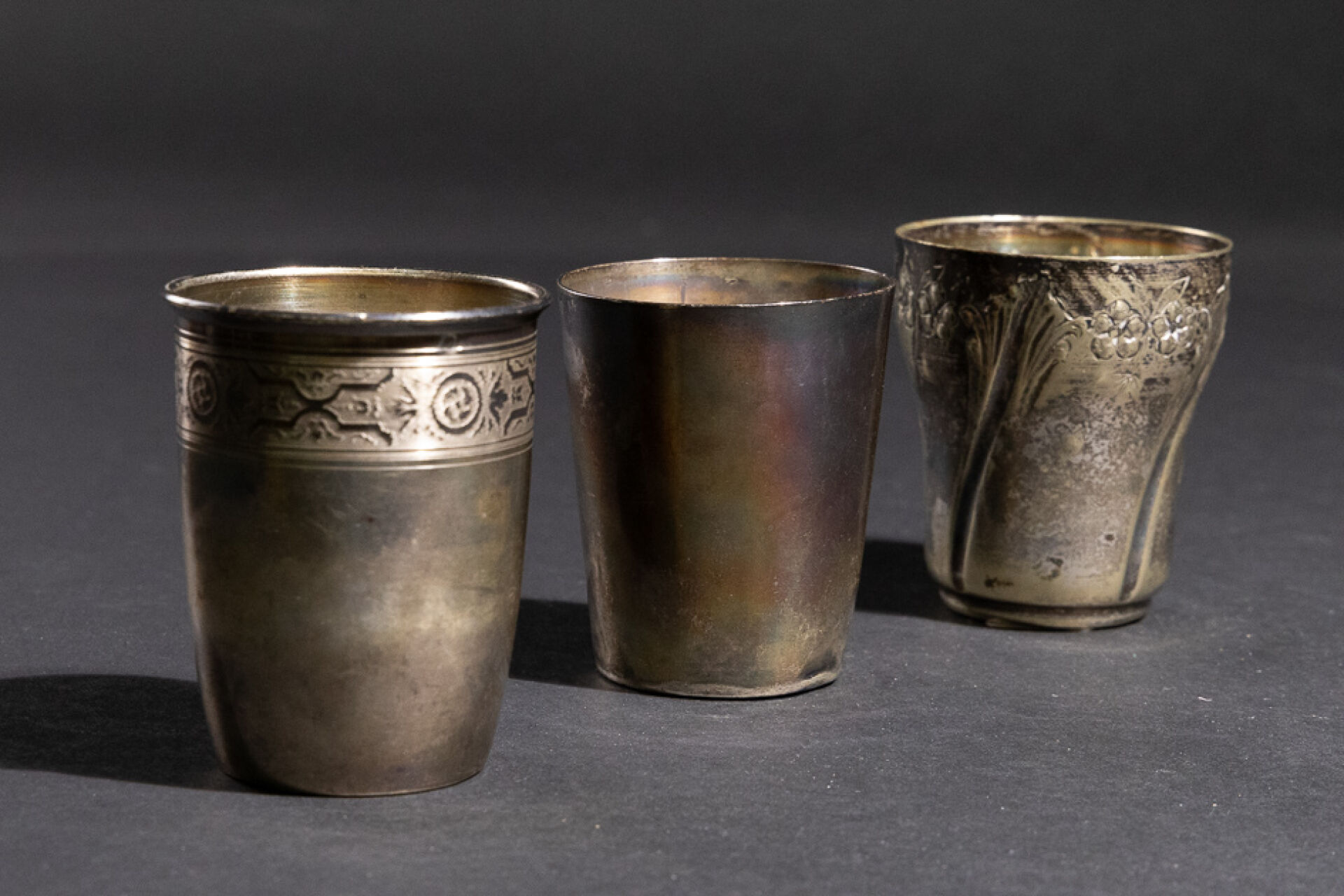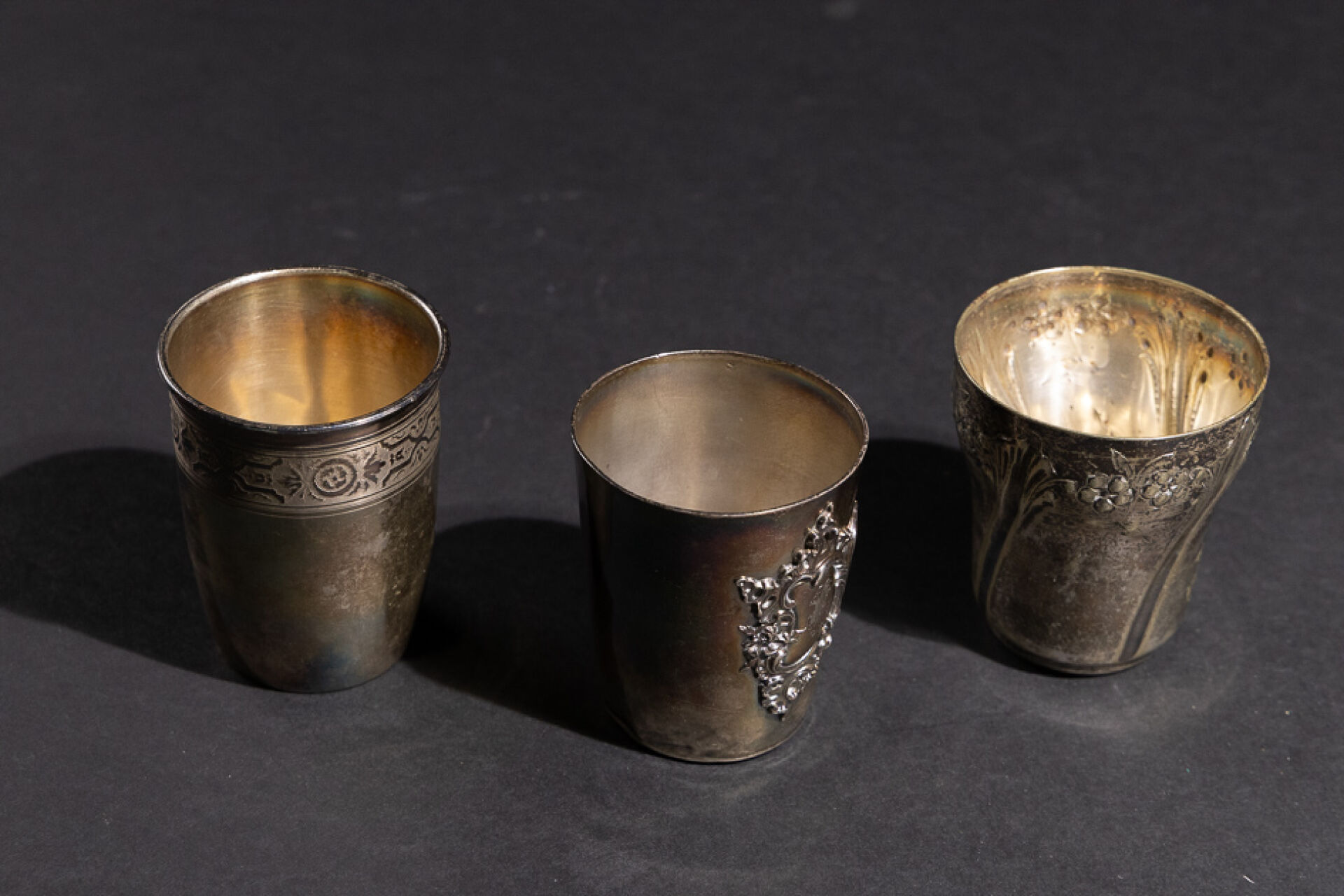 Deux timbales en argent (chocs) telles que : - Timbale à cartouche rocaille, monogrammée, poinçon Minerve. Haut. : 8 cm - Poids : 103,90 g. - Timbale à frise de volutes de fleurs stylisées, poinçon Minerve. Haut. : 8.5 cm - Poids : 61.42 g. Poids total !: 165.31 g. On joint : - Timbale en métal argenté, monogrammée, à décor de branchages et fleurs stylisées (usures et chocs). Haut. : 7.5 cm