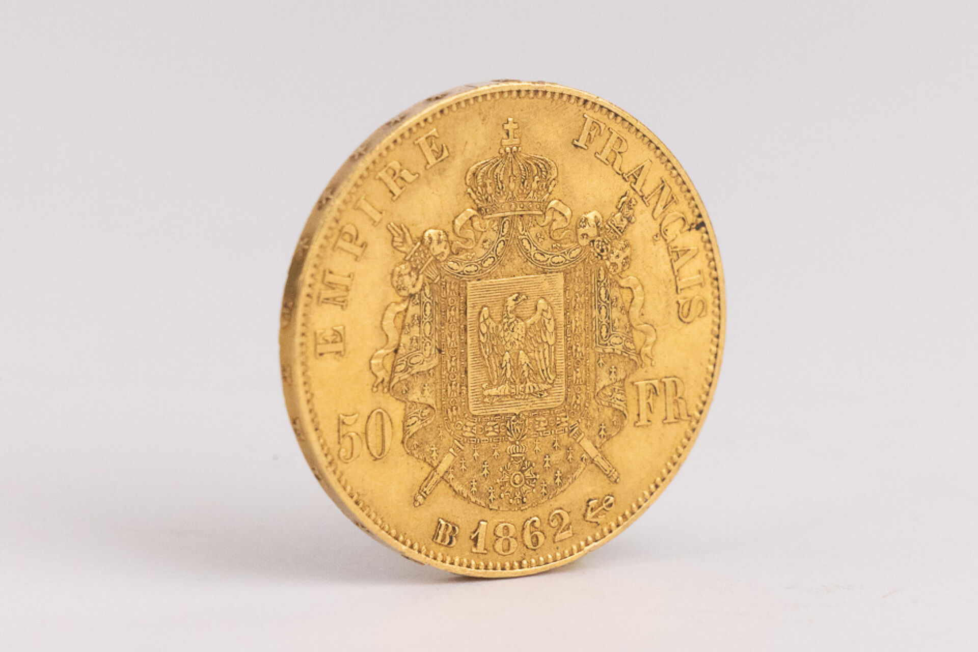 Pièce en or de 50 francs, profil de l'Empereur Napoléon III lauré,1862. Poids : 16,18 gr